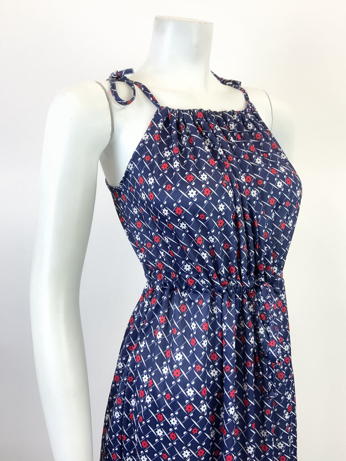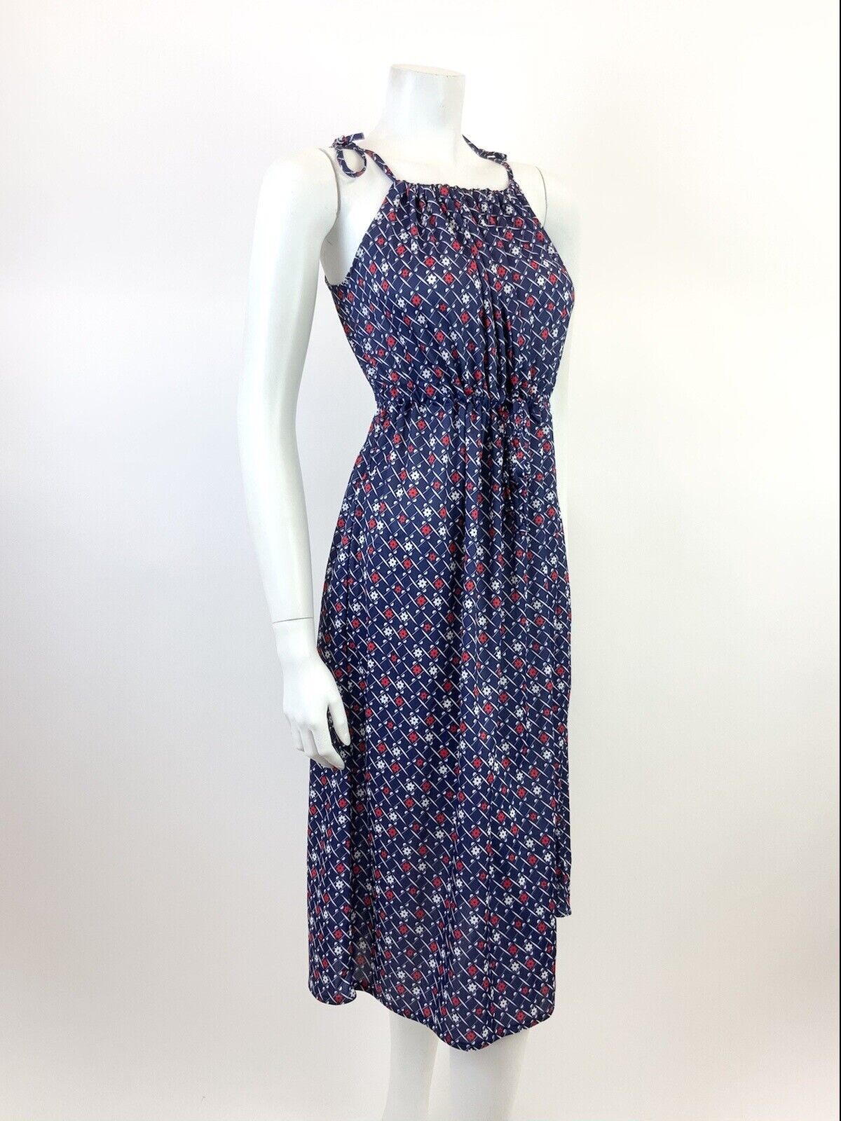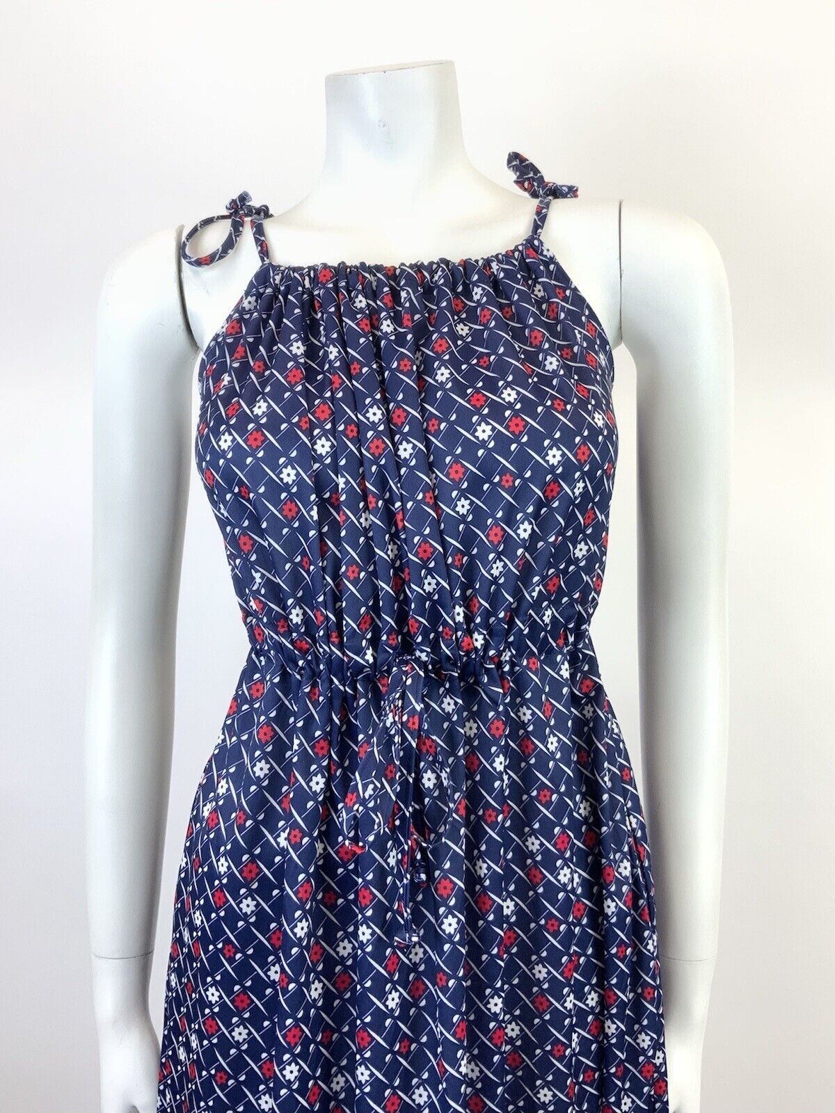 VINTAGE 70s 80s BLUE WHITE RED CHECKED GRID FLORAL STRAPPY MOD SUN DRESS 10 12