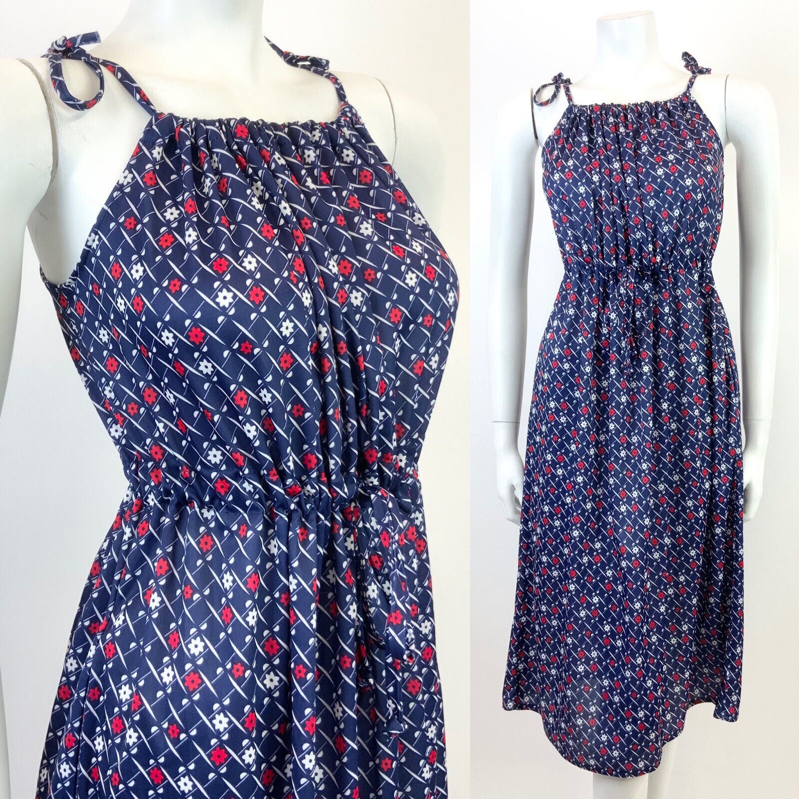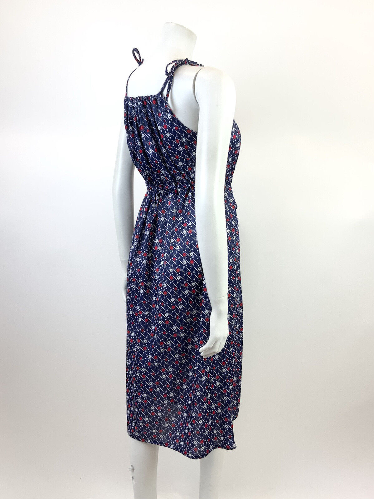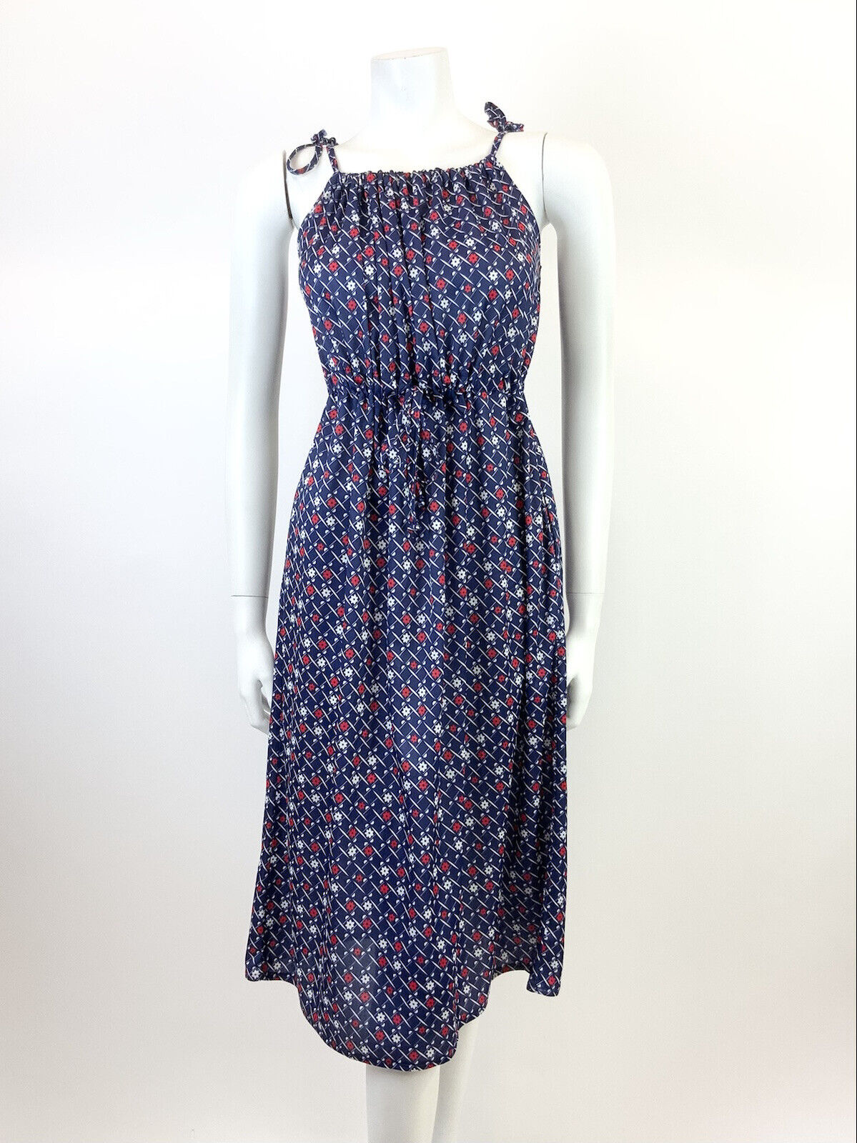 VINTAGE 70s 80s BLUE WHITE RED CHECKED GRID FLORAL STRAPPY MOD SUN DRESS 10 12