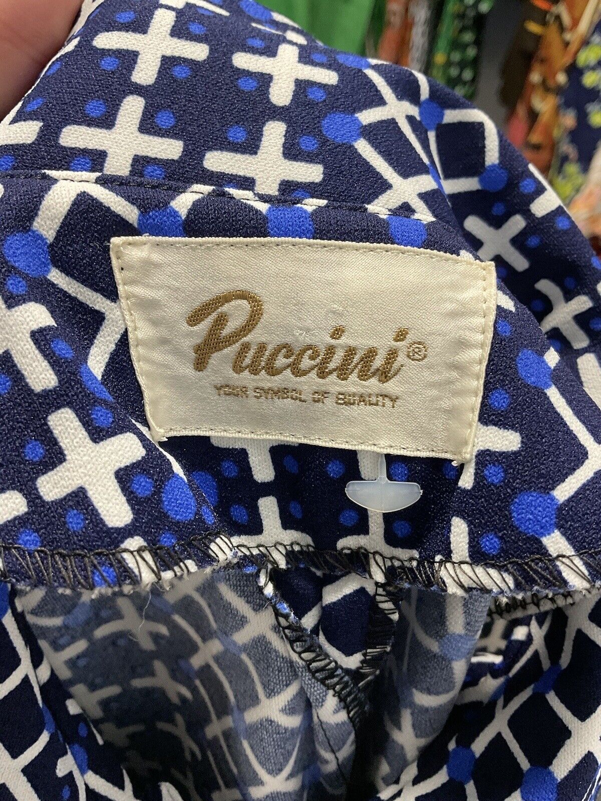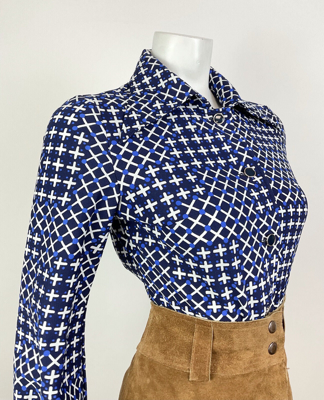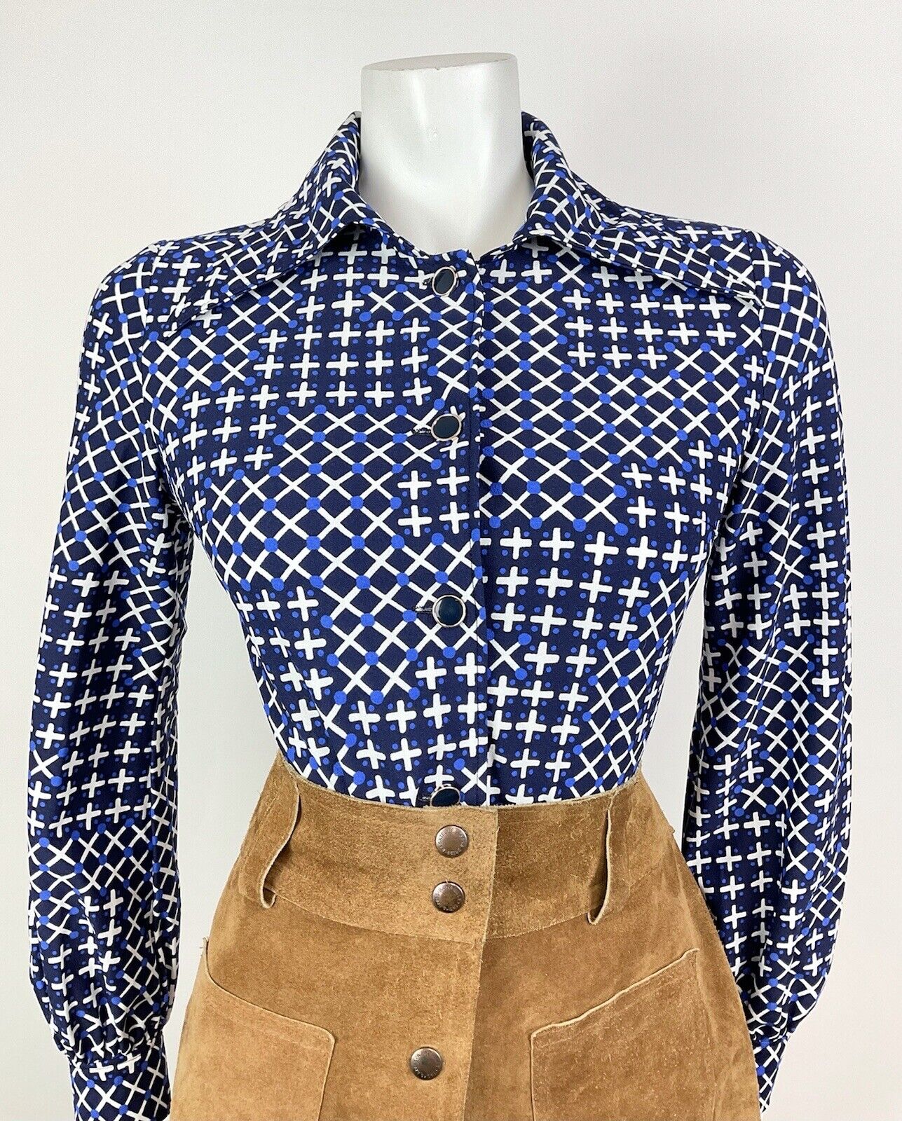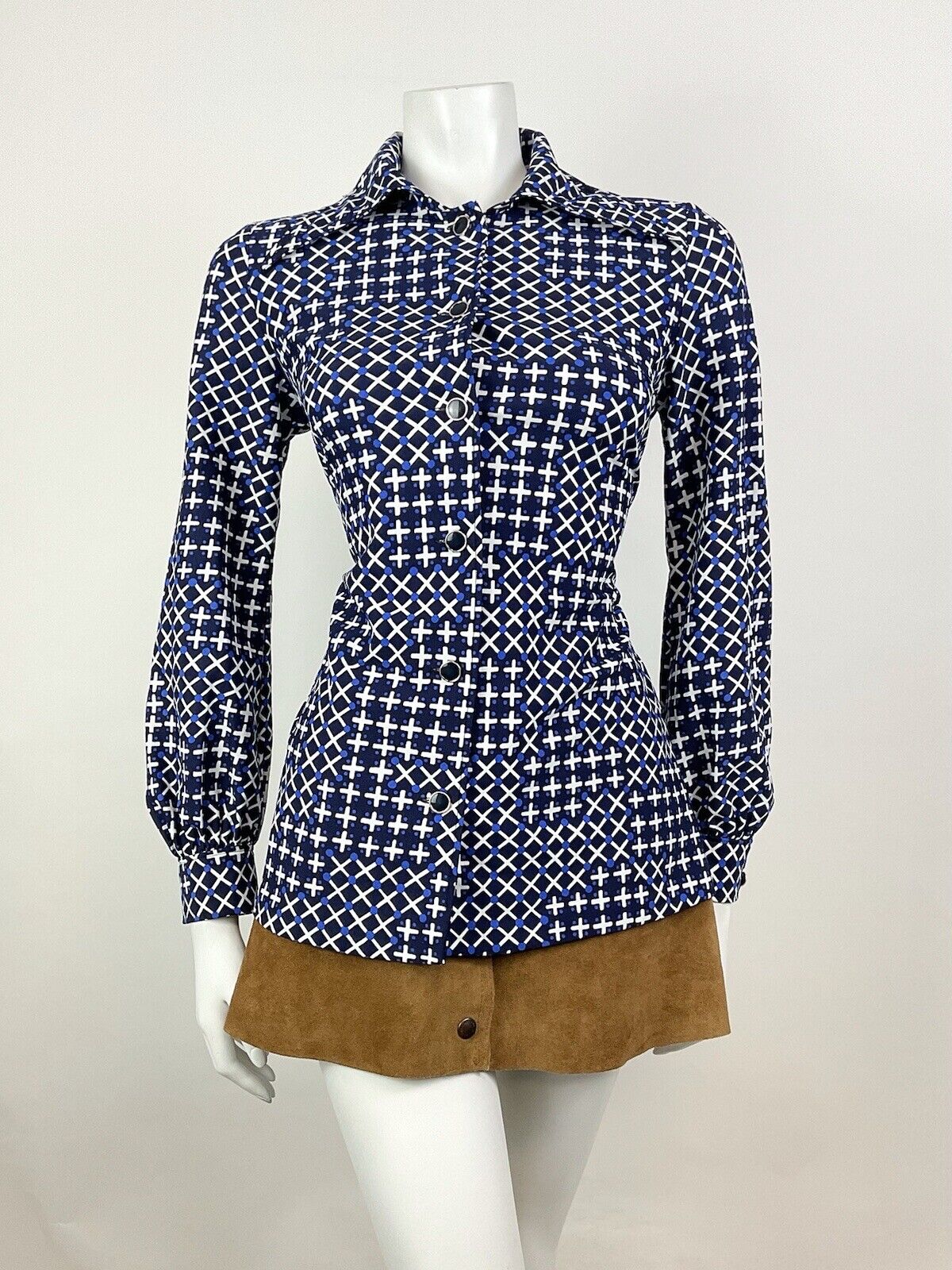 VINTAGE 70s 90s PUCCINI BLUE WHITE GEOMETRIC CRISS-CROSS CHECKED DAGGER SHIRT 10