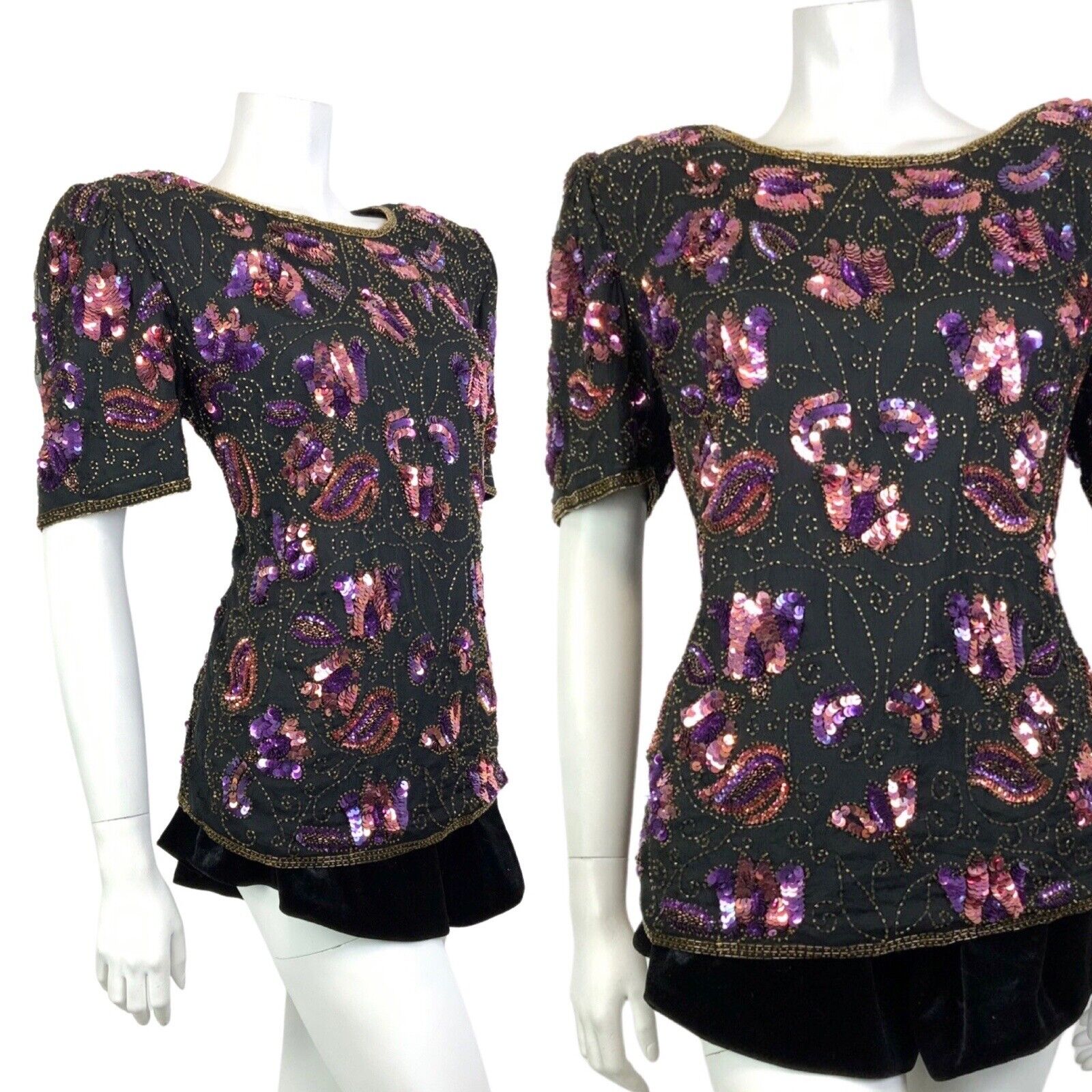 VINTAGE 70s BLACK PURPLE GOLD FLORAL SWIRL SEQUIN DISCO GLAM PARTY TOP 14 16