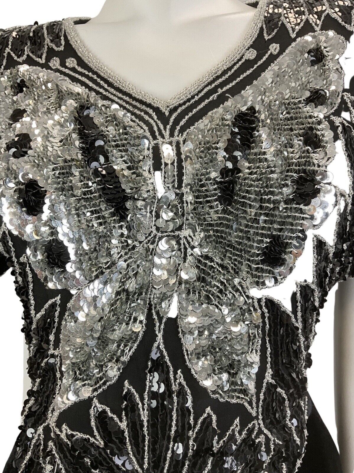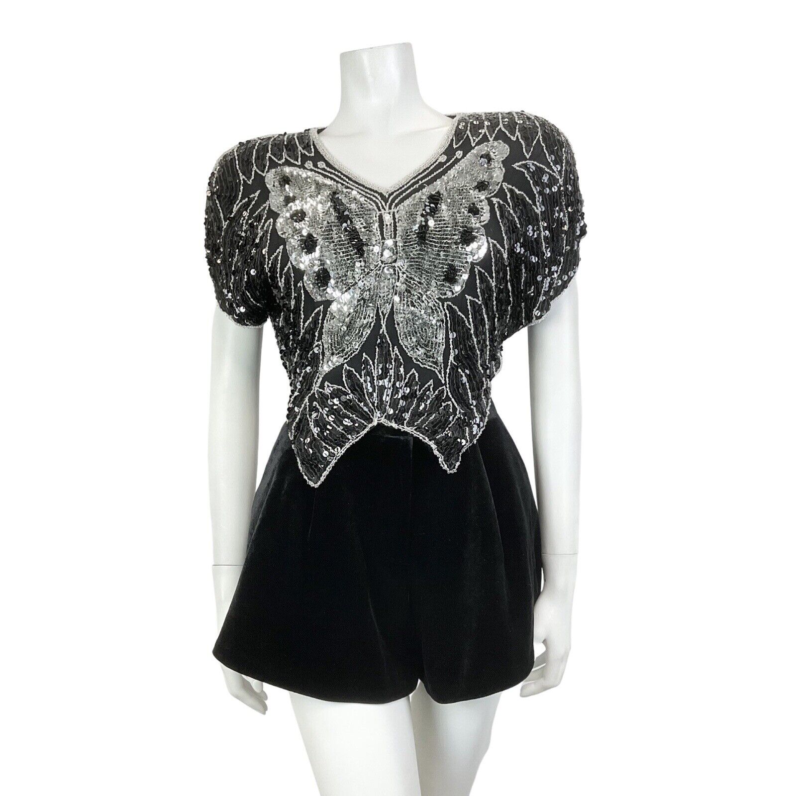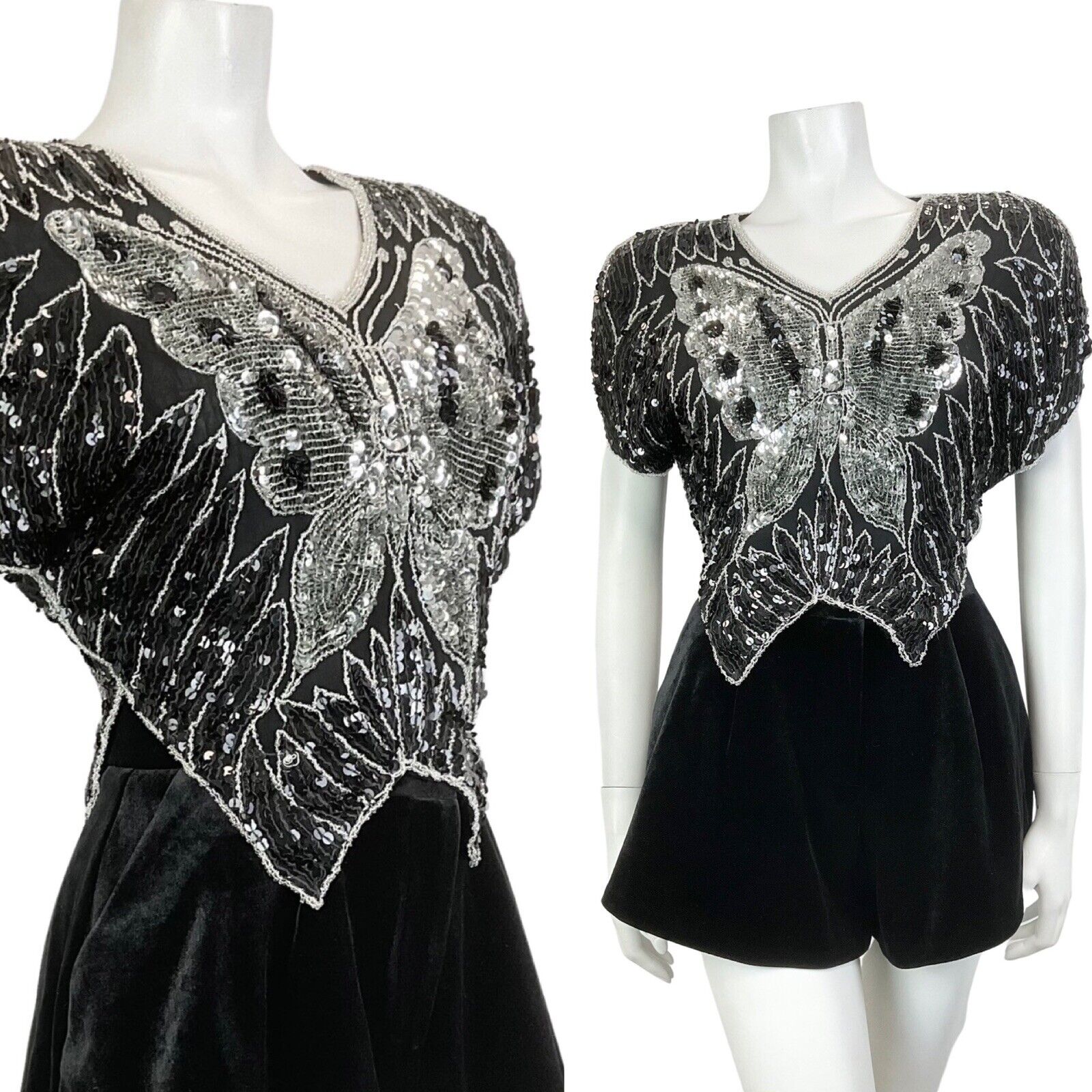 VINTAGE 70s BLACK SILVER SEQUIN BEADED BUTTERFLY DISCO STUDIO 54 GLAM TOP 10
