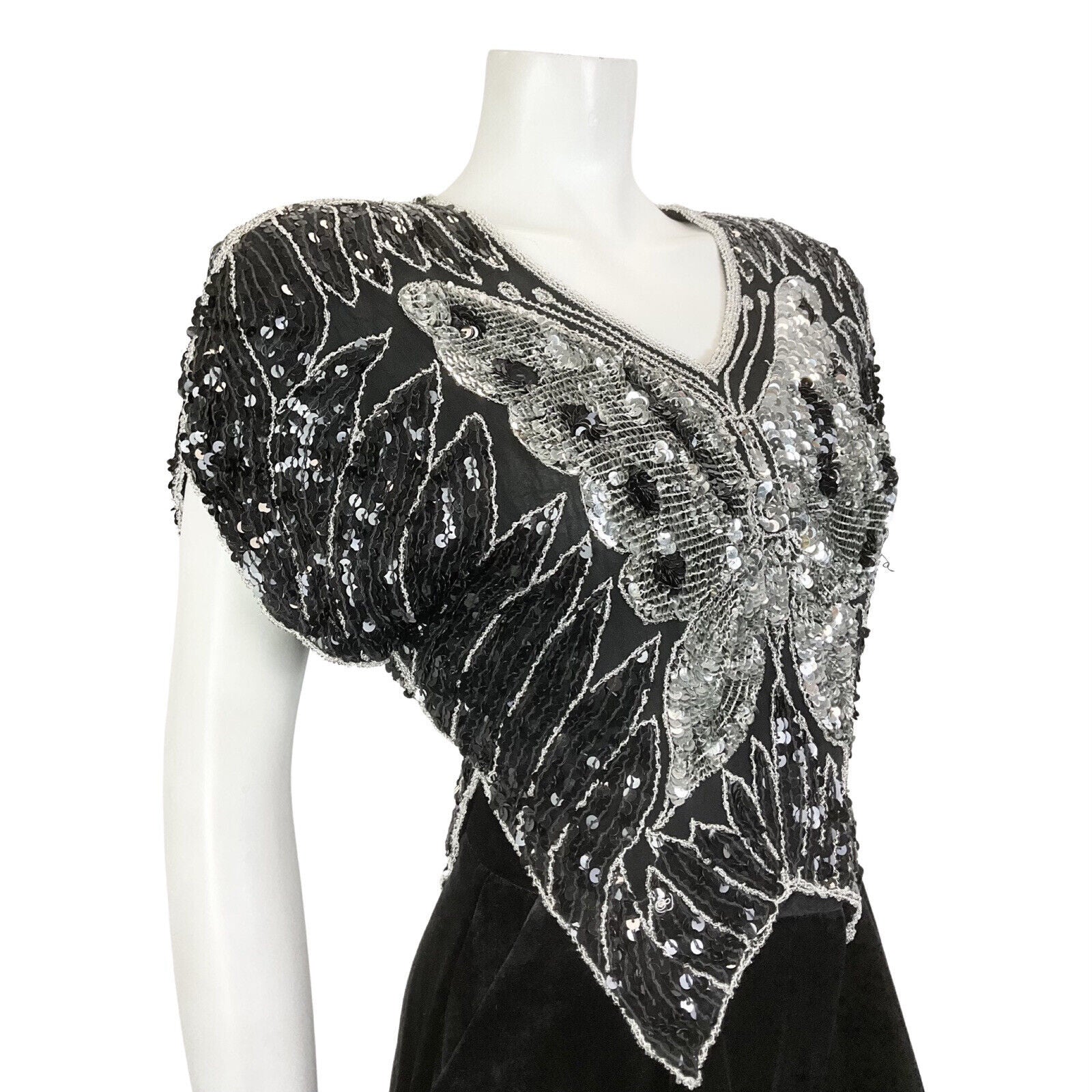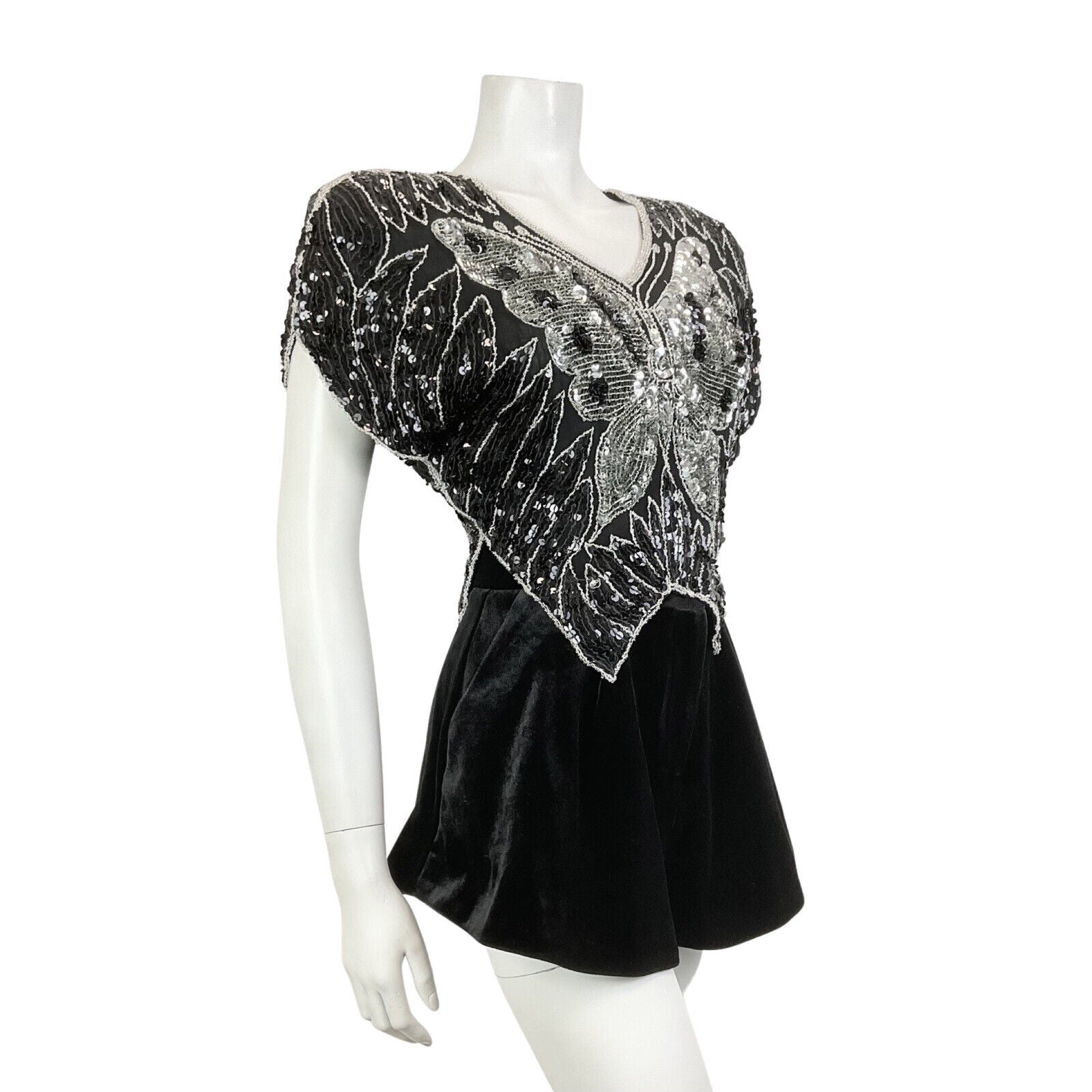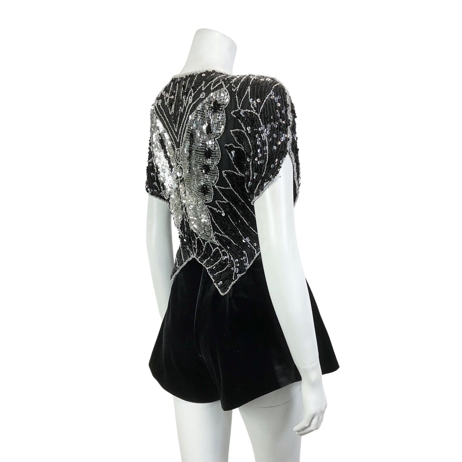 VINTAGE 70s BLACK SILVER SEQUIN BEADED BUTTERFLY DISCO STUDIO 54 GLAM TOP 10