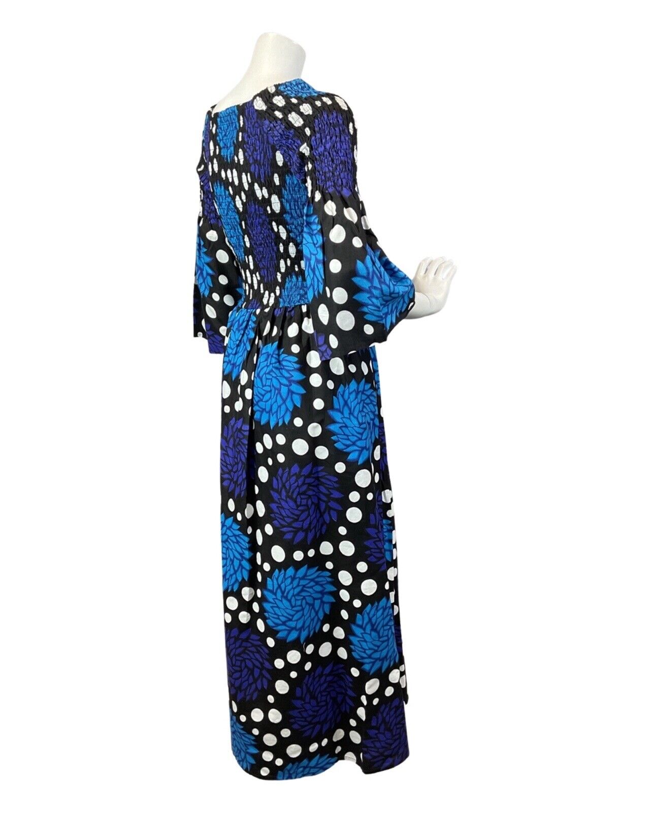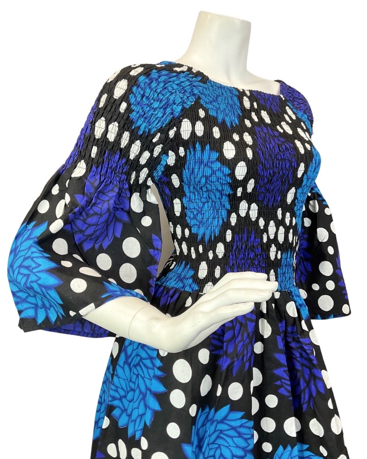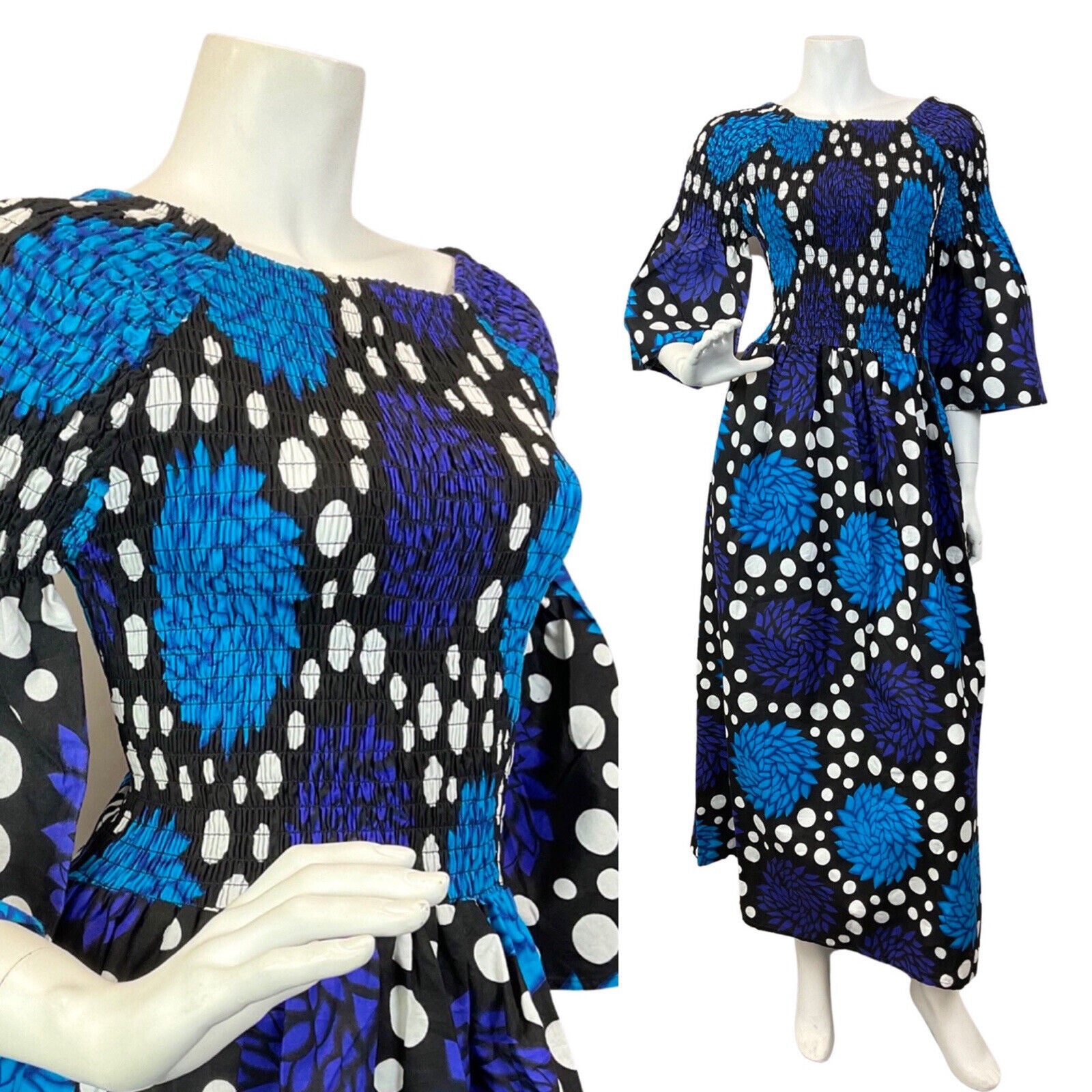 VINTAGE 70s BLUE BLACK WHITE POLKA-DOT FLORAL SHIRRED PSYCHEDELIC MAXI DRESS 6 8