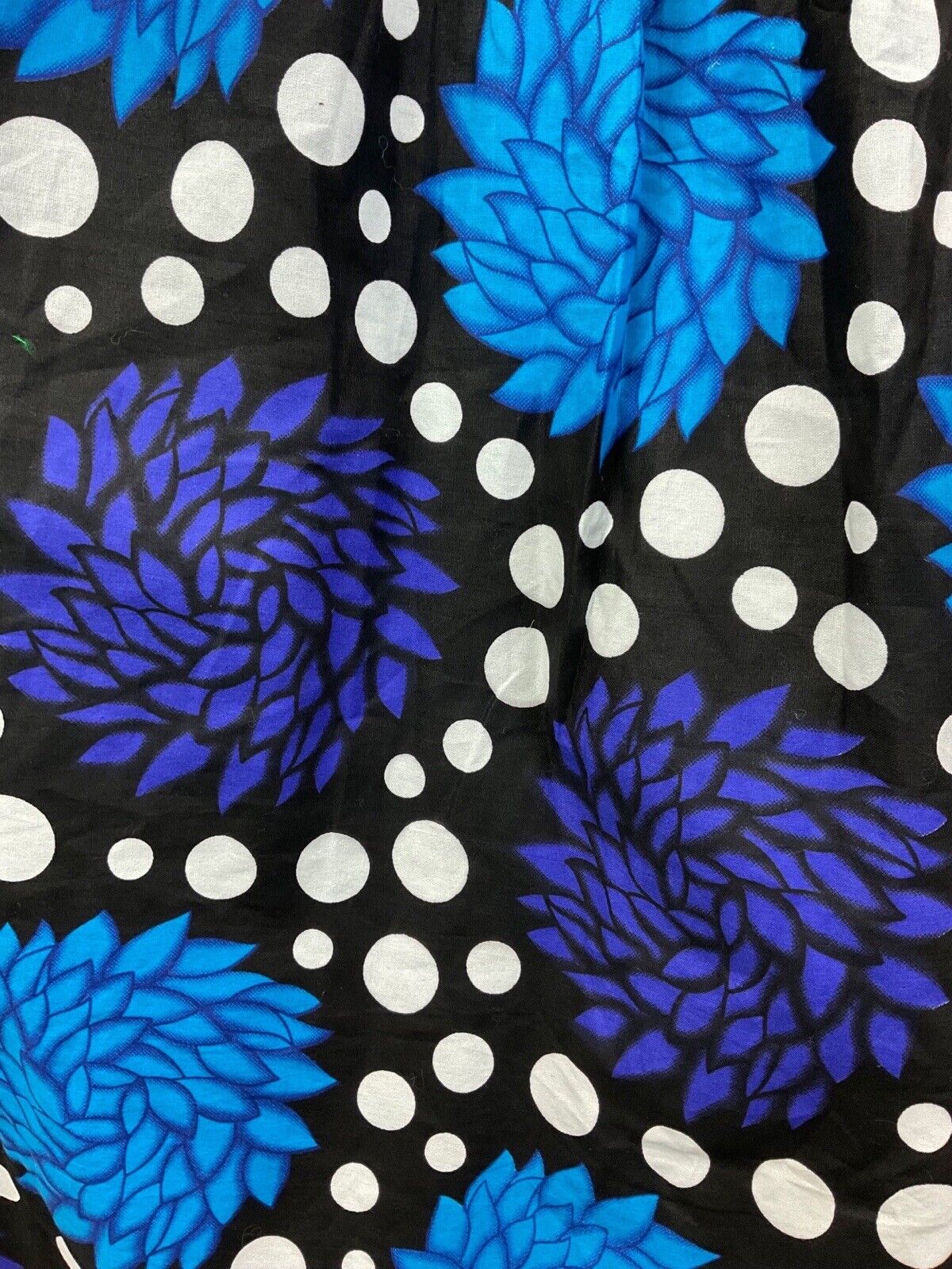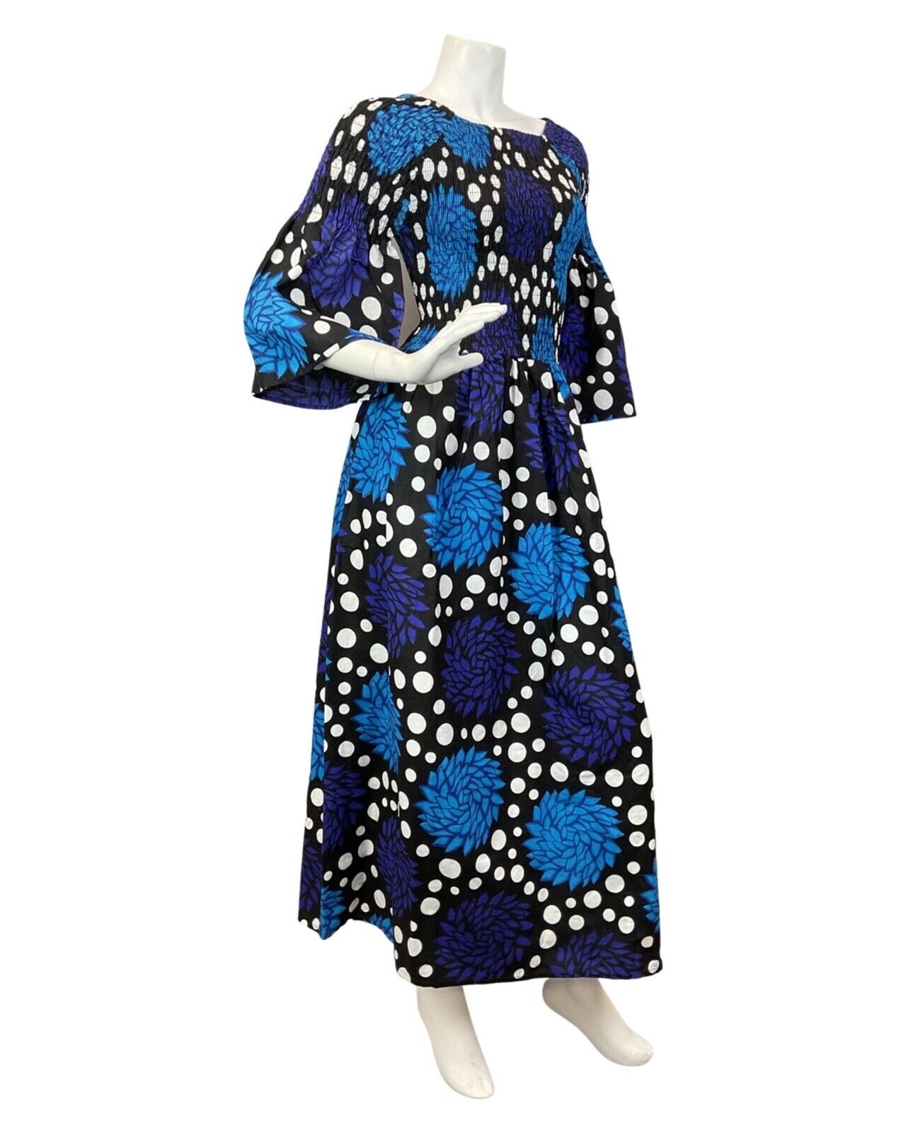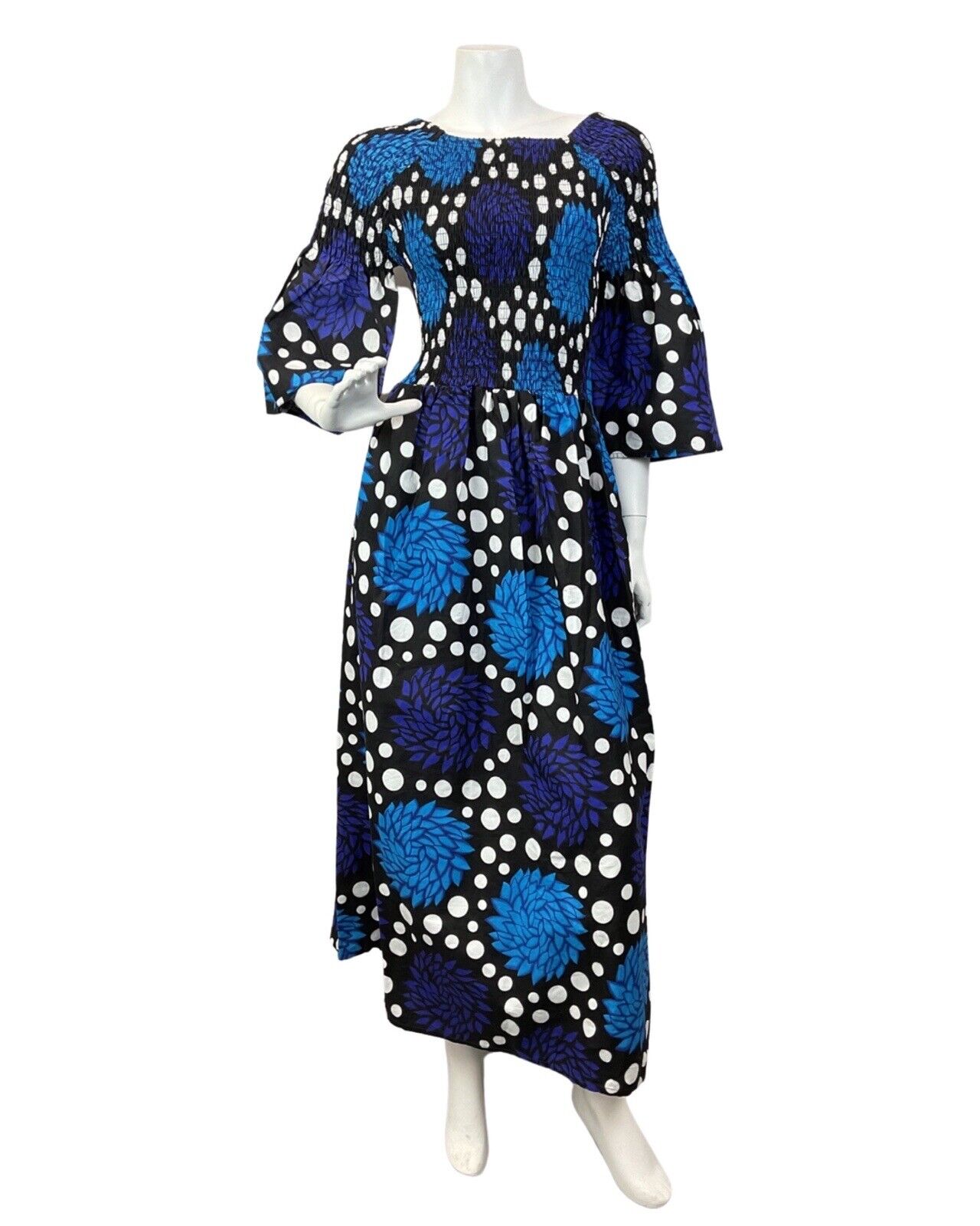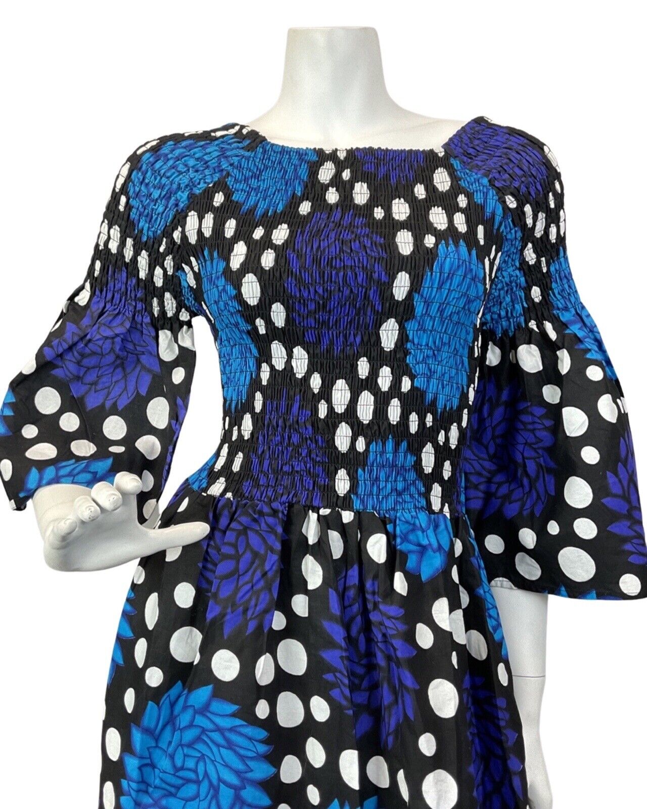 VINTAGE 70s BLUE BLACK WHITE POLKA-DOT FLORAL SHIRRED PSYCHEDELIC MAXI DRESS 6 8
