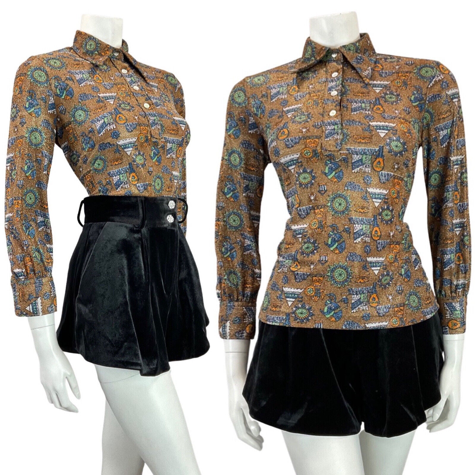 VINTAGE 70s BROWN SILVER BLUE CASTLE TENT MOD DAGGER COLLAR LUREX SHIRT 12