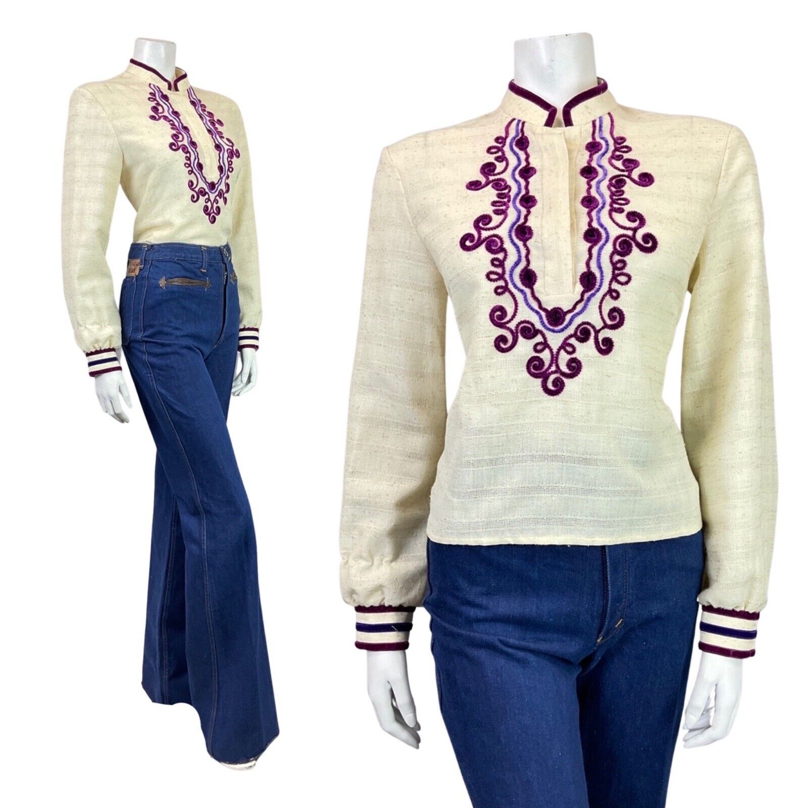 VINTAGE 70s CREAM PURPLE WINE VELVET SWIRL LUCIE LINDEN BOHO BLOUSE 12 14