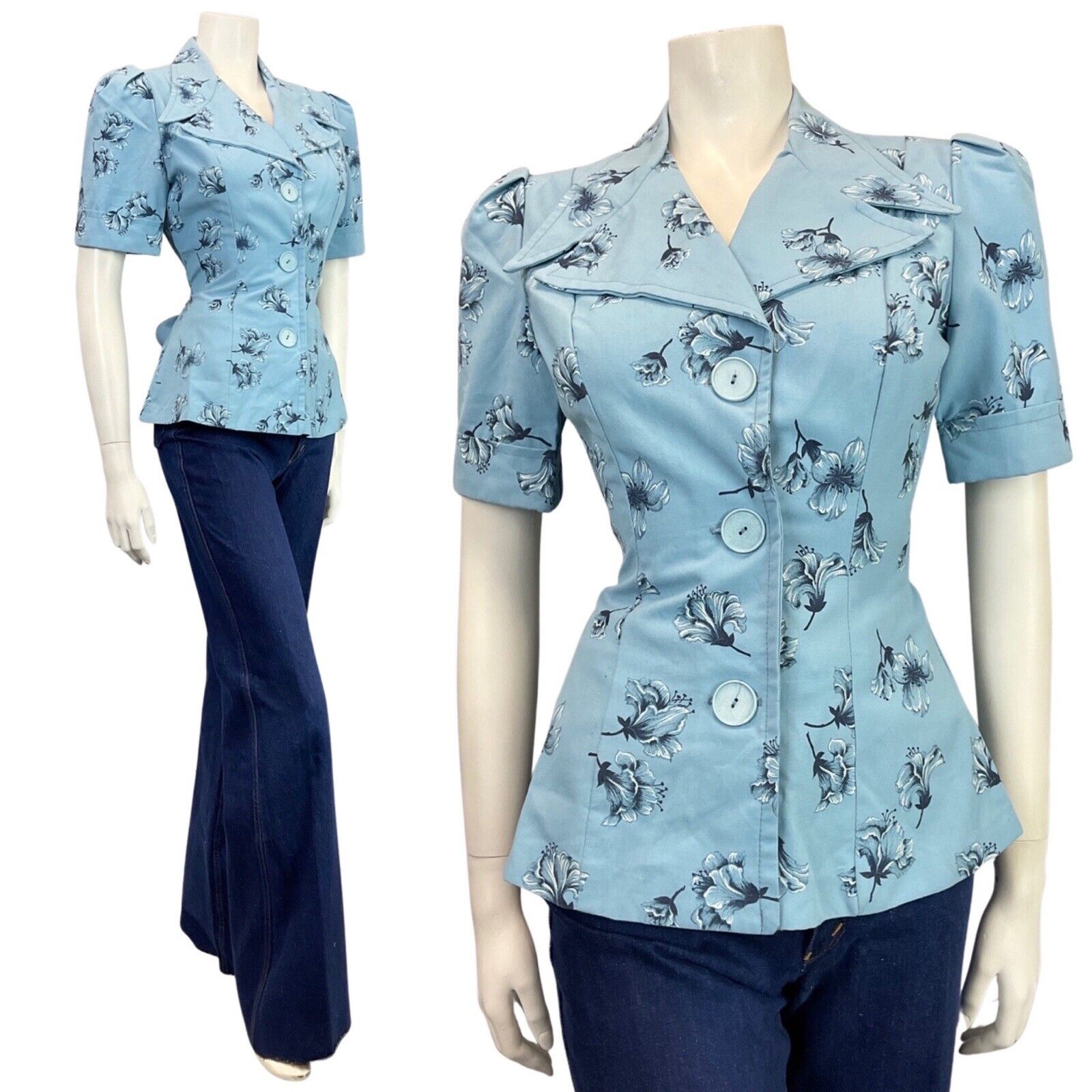 VINTAGE 70s DOES 40S BLUE NAVY FLORAL BELTED MOD BLOUSE TOP 10