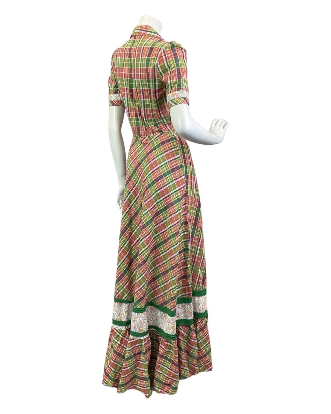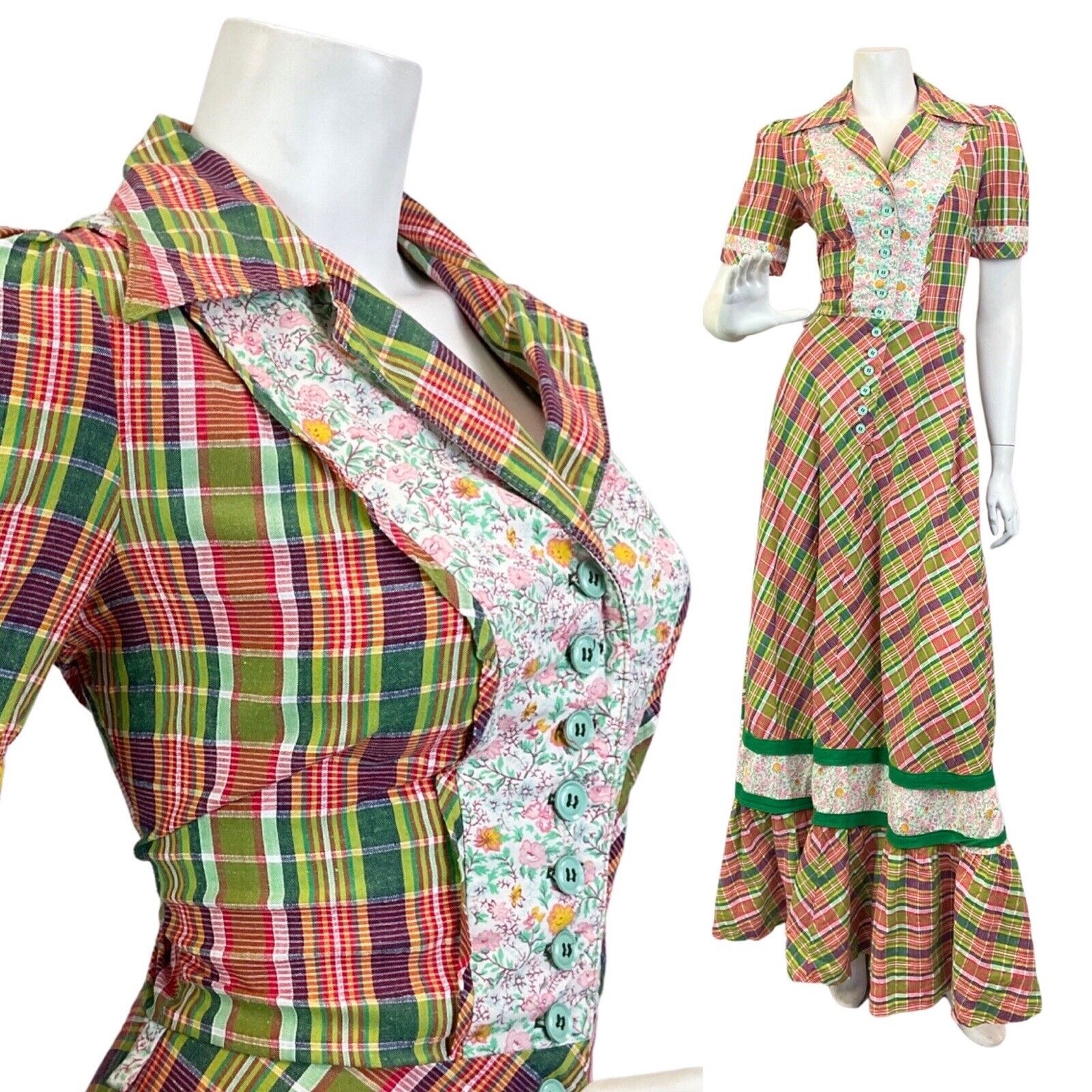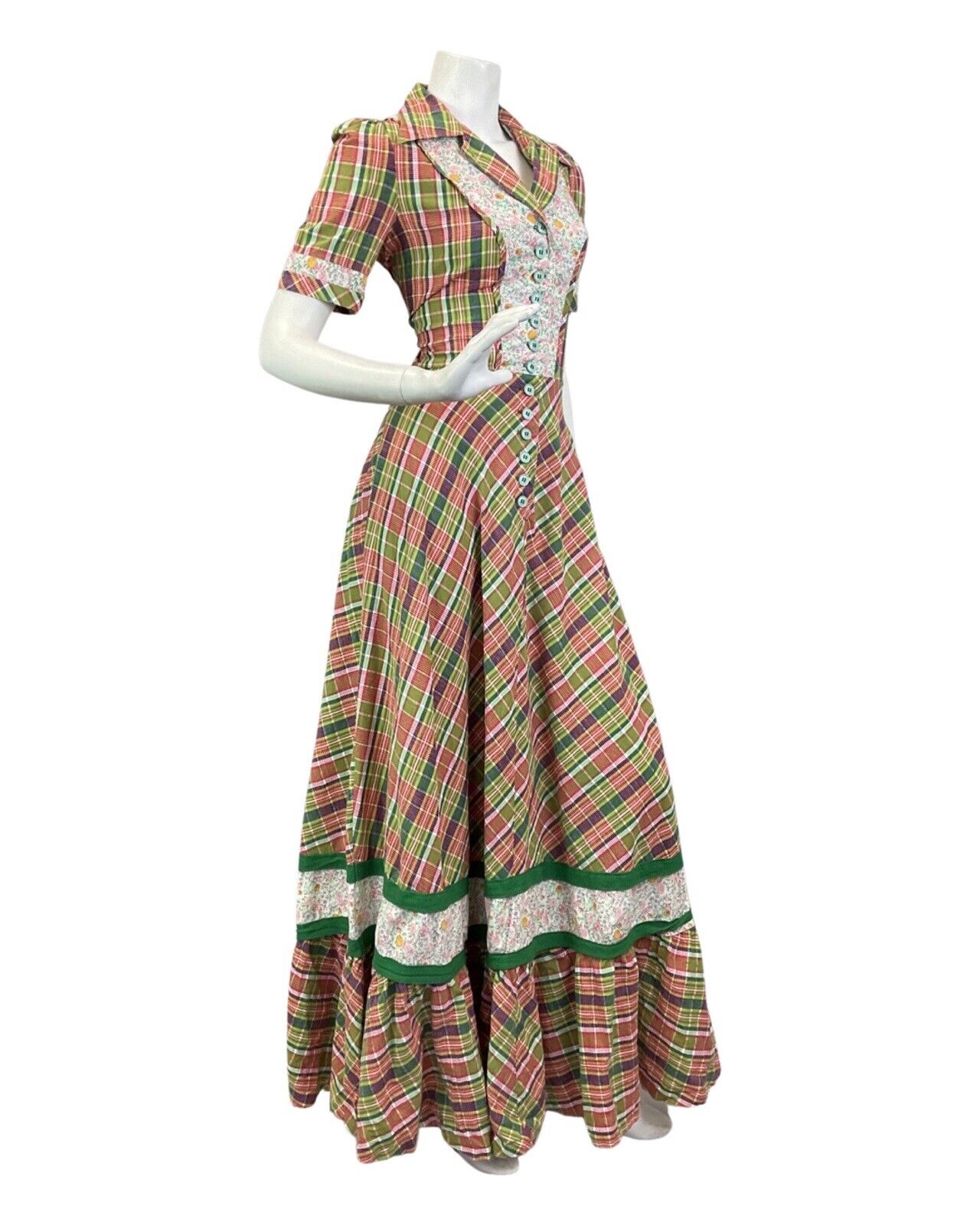VINTAGE 70s GREEN RED PURPLE PLAID DITSY FLOWER BOHO PRAIRIE DAGGER MAXI DRESS 8