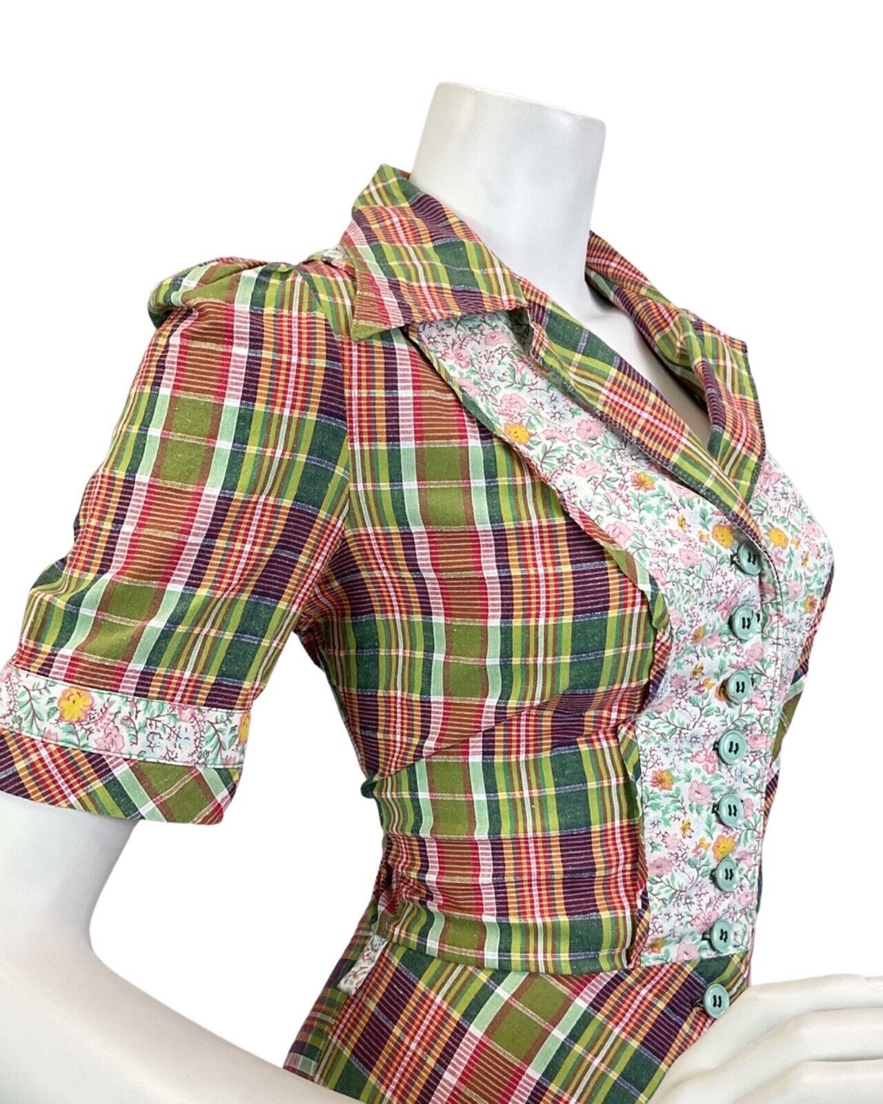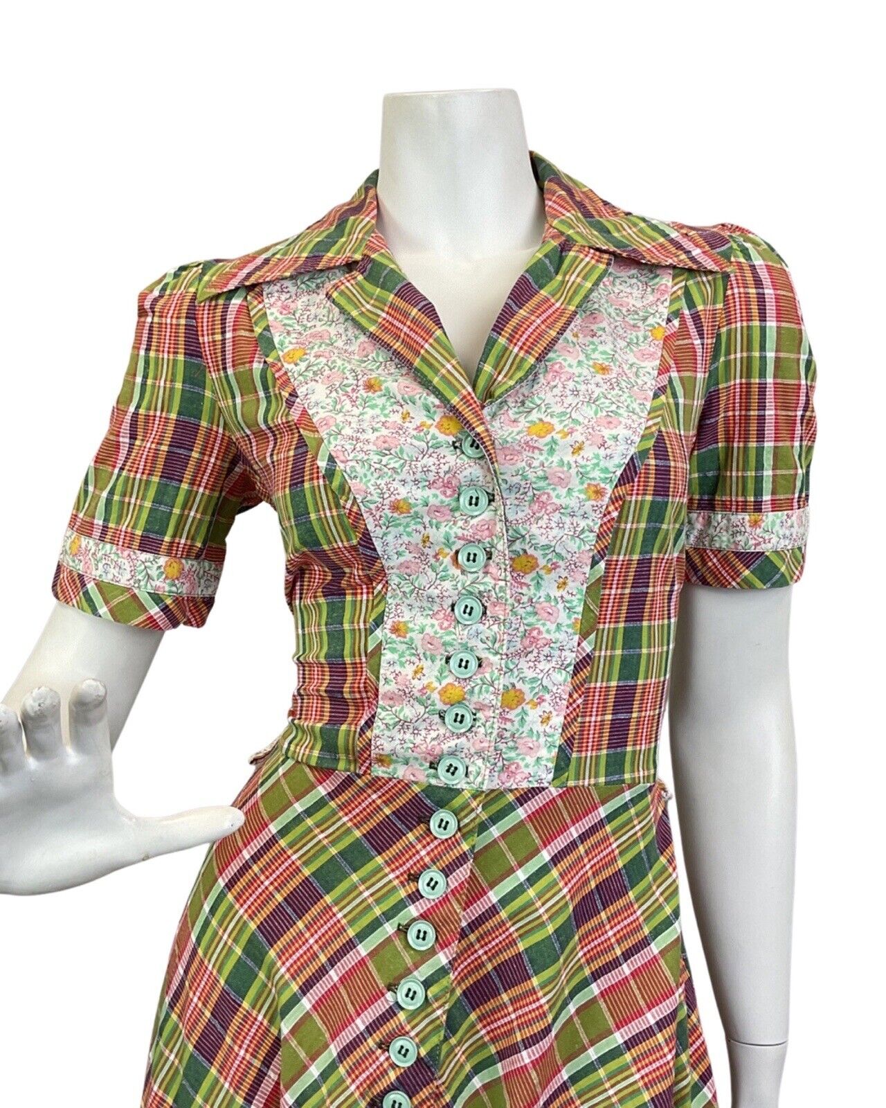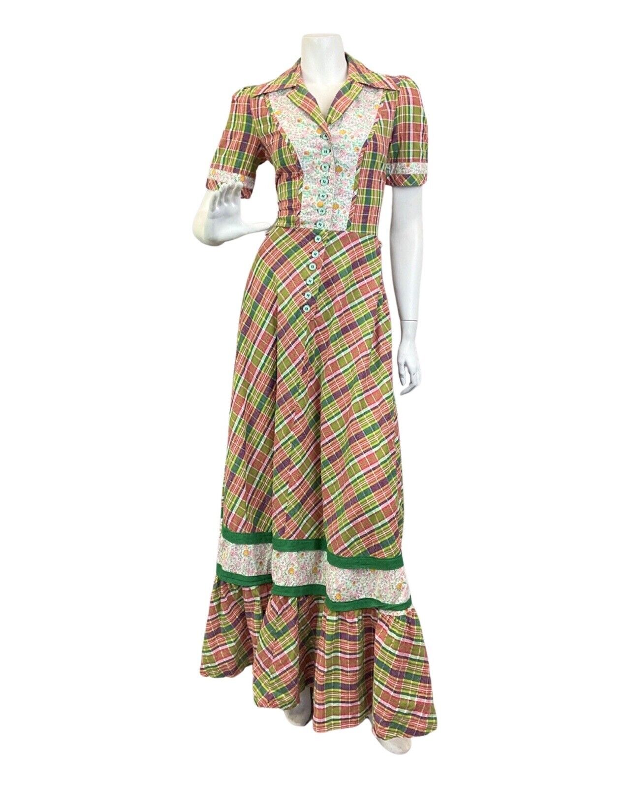 VINTAGE 70s GREEN RED PURPLE PLAID DITSY FLOWER BOHO PRAIRIE DAGGER MAXI DRESS 8