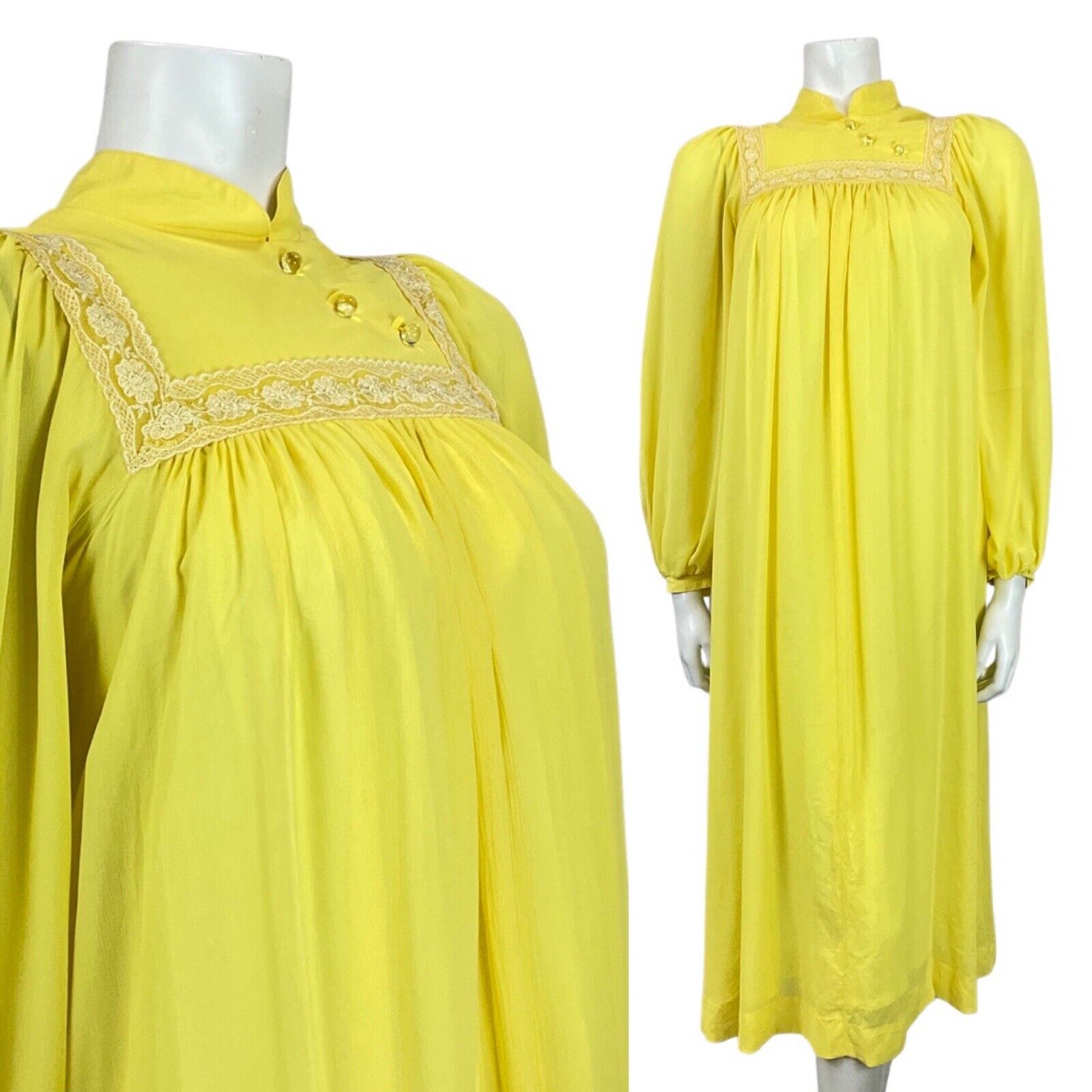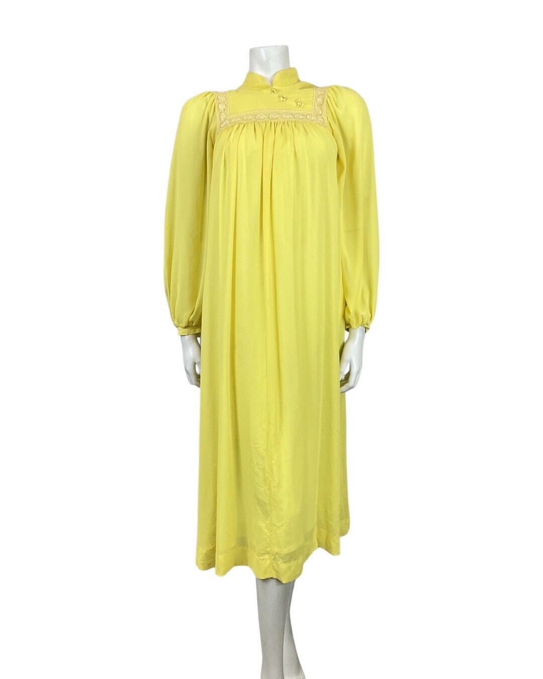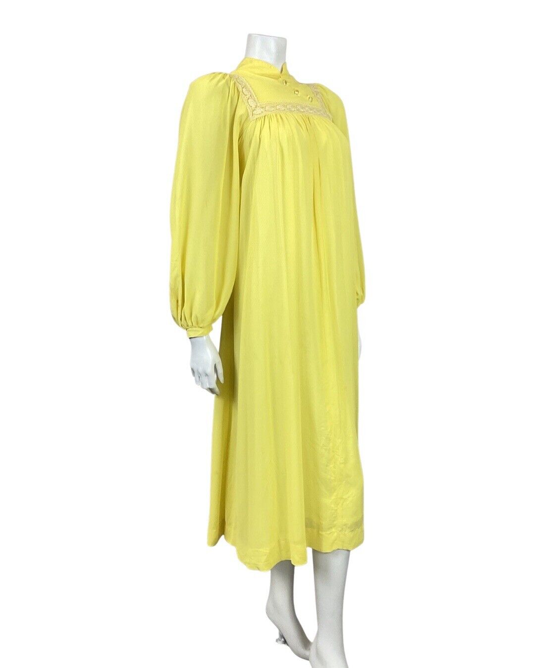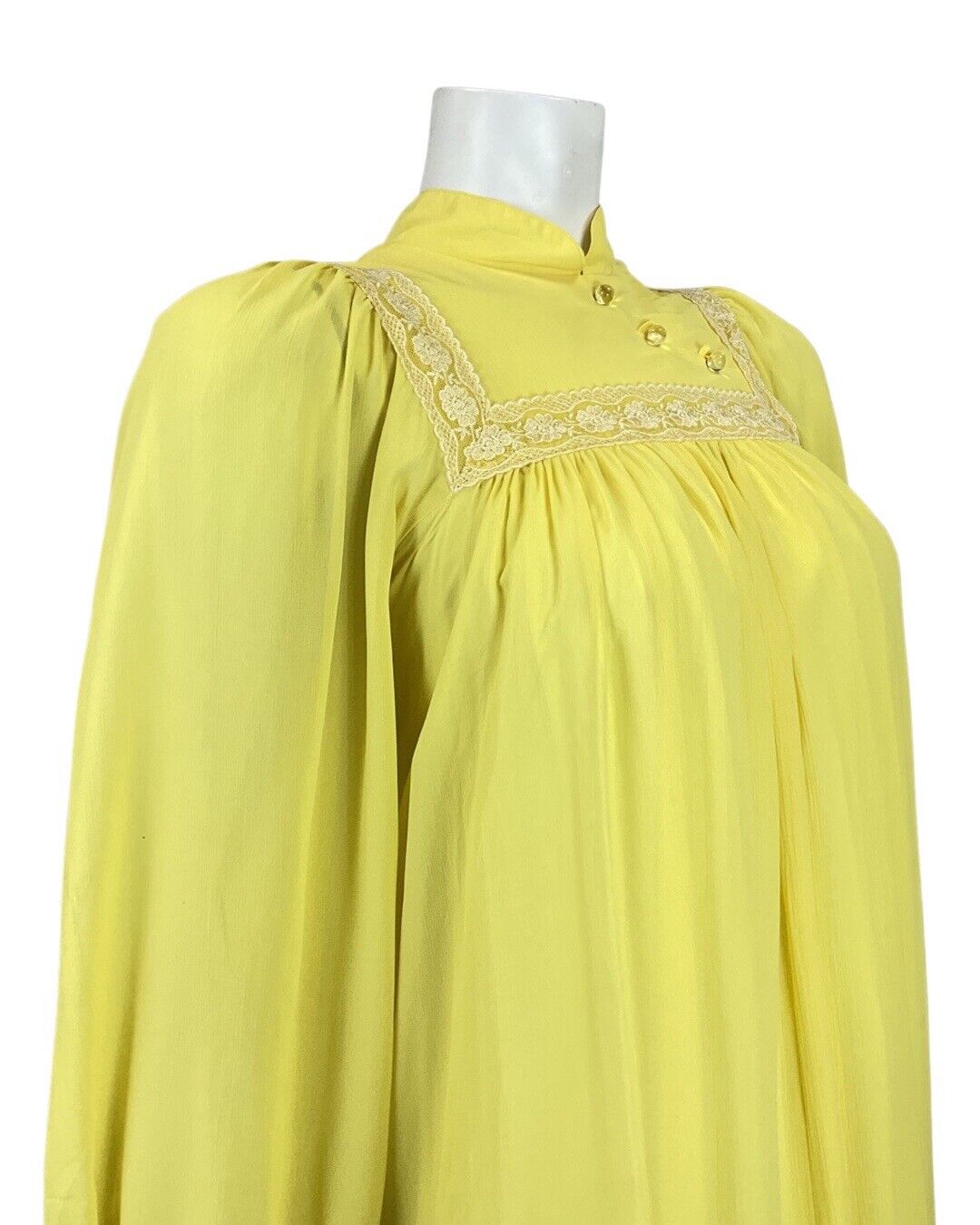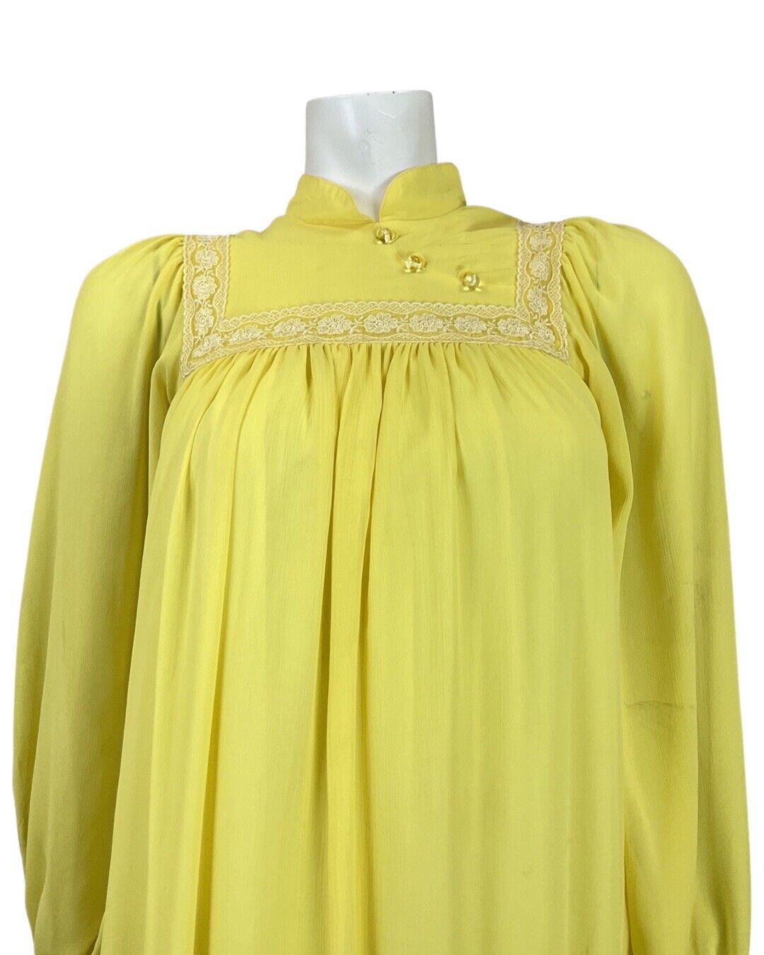 VINTAGE 70s PASTEL YELLOW LACE BOHO PRAIRIE EMPIRE LINE FLARED MIDI DRESS 8