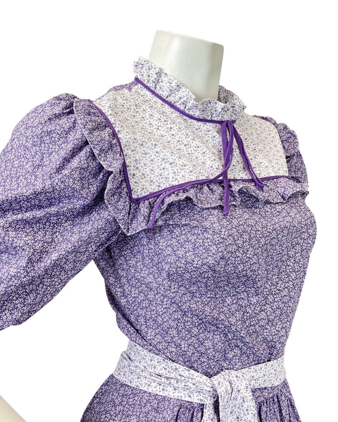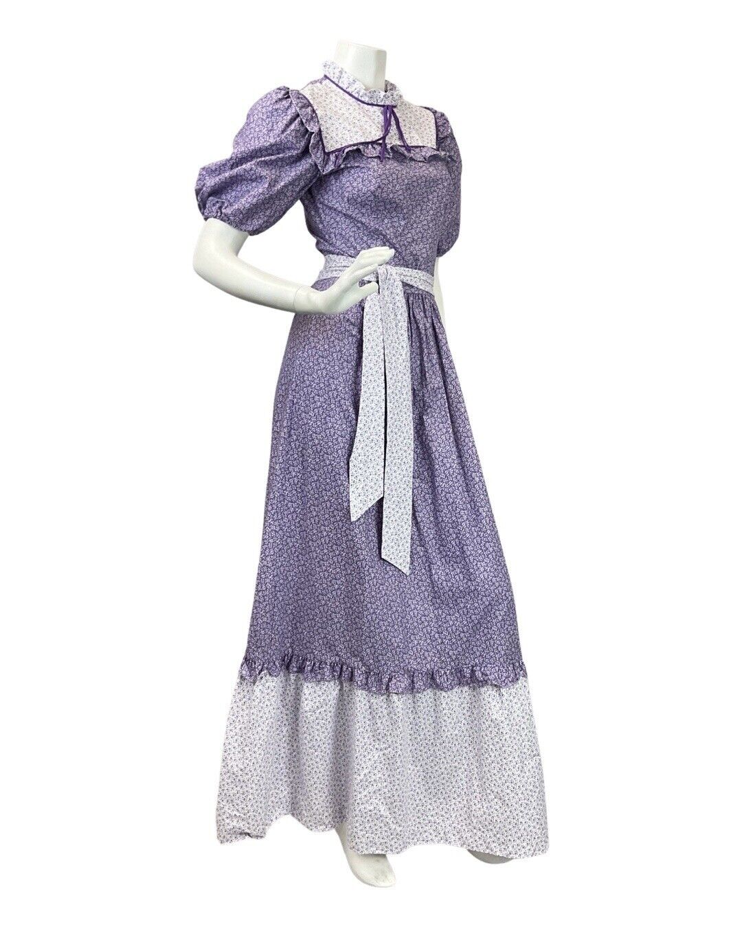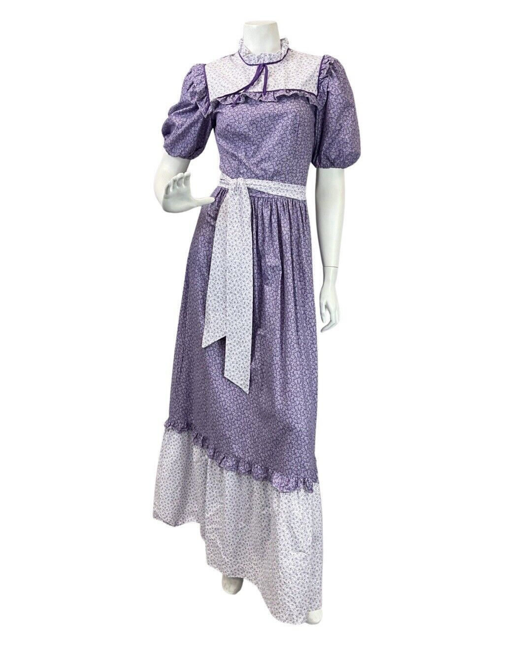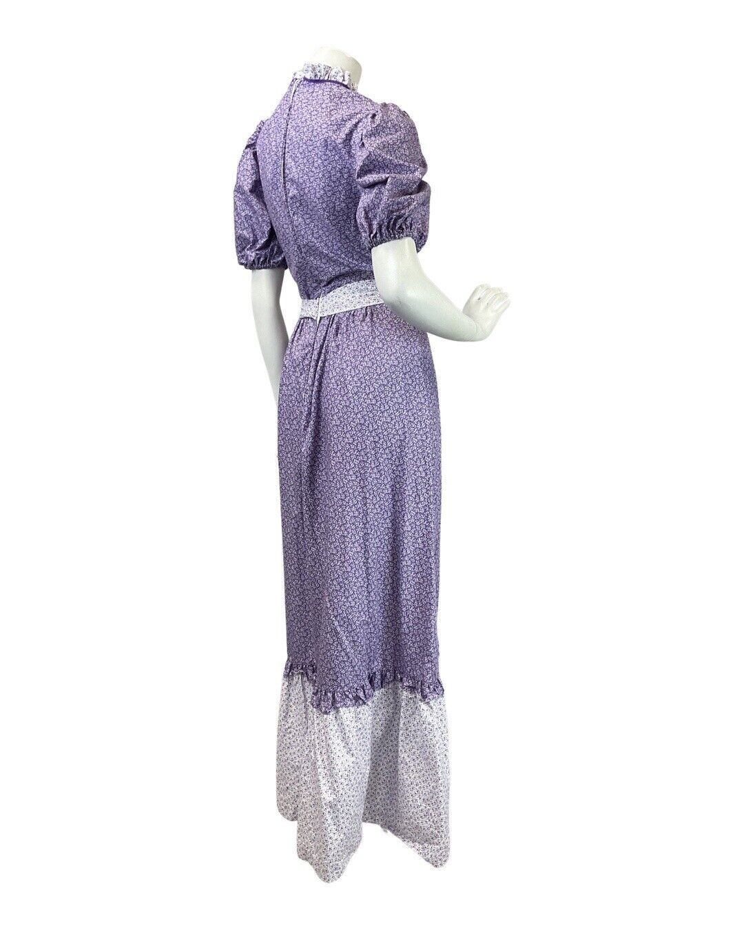 VINTAGE 70s PURPLE WHITE DITSY FLOWER PRAIRIE BOHO RUFFLED MAXI DRESS 6