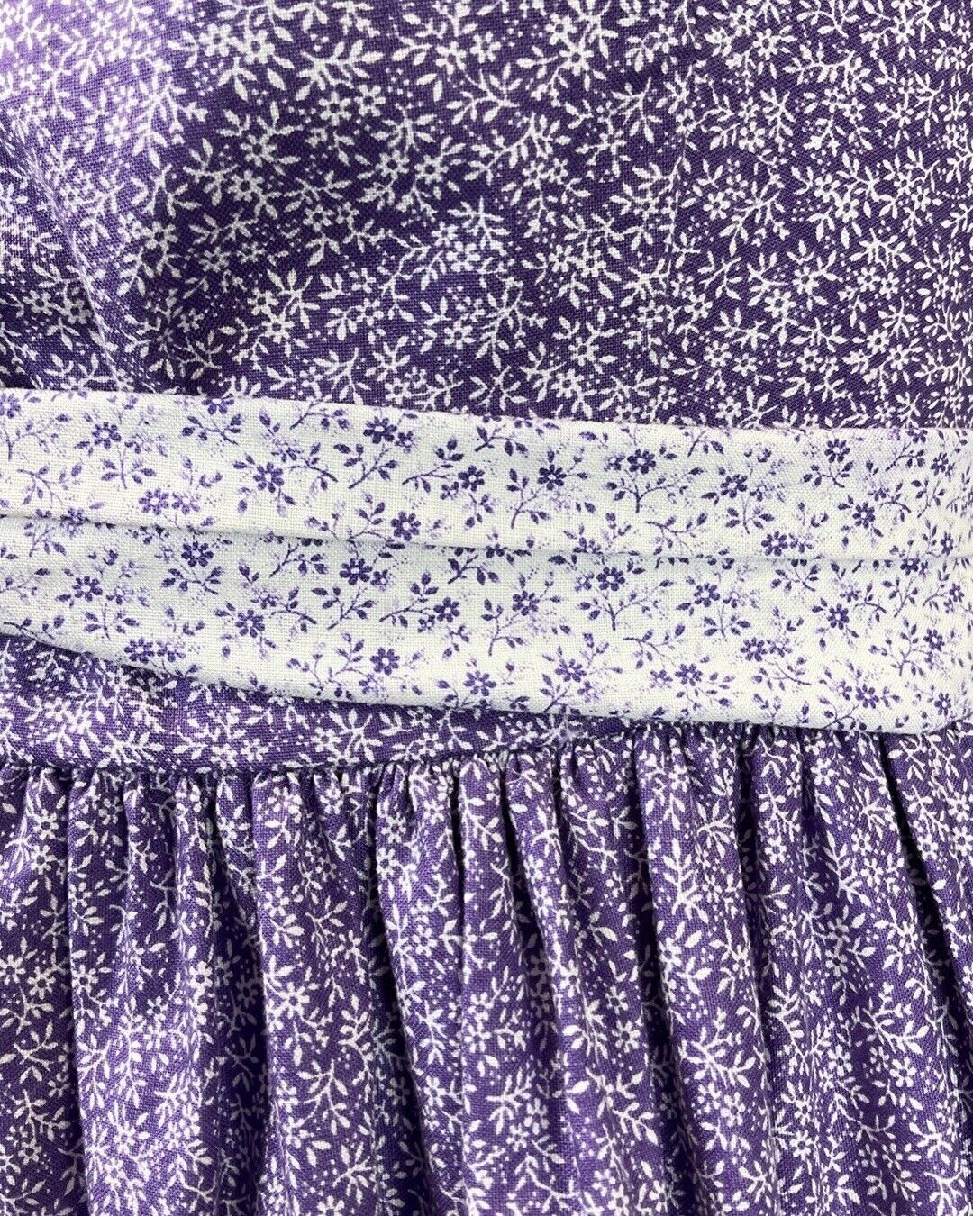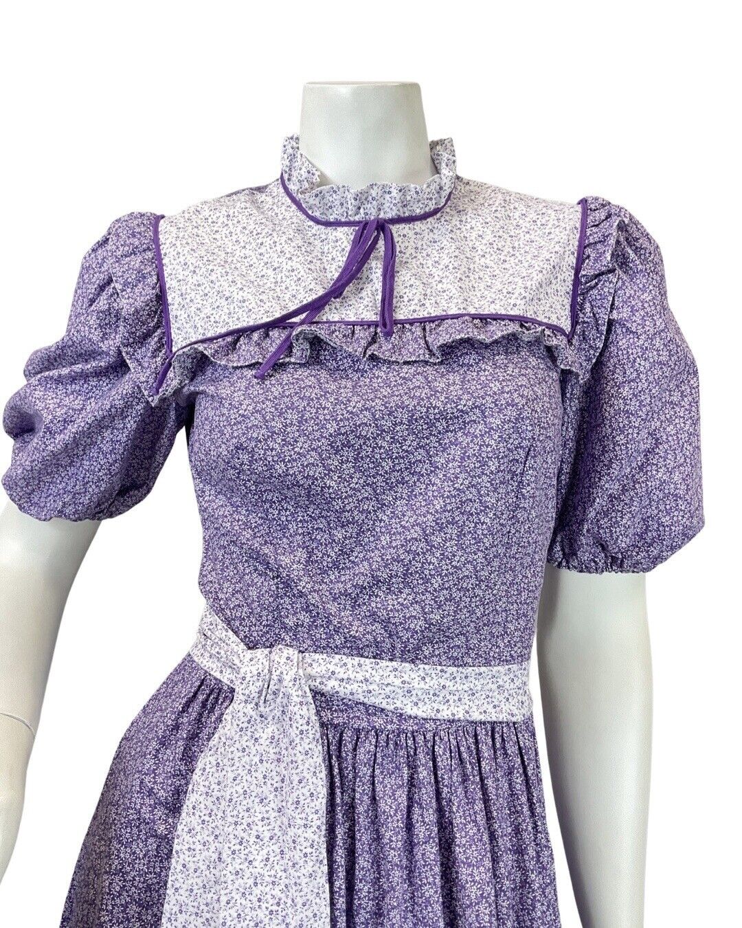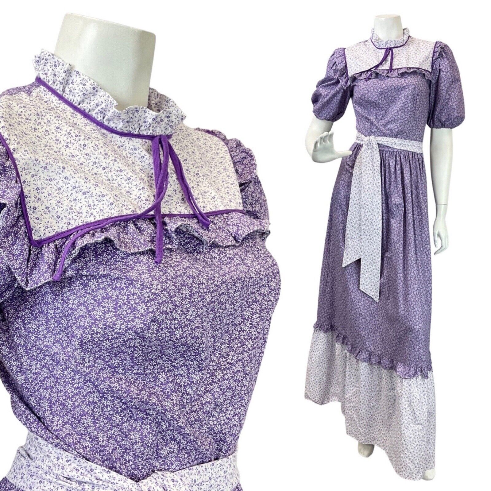 This is a gorgeous vintage maxi dress made from a mid-weight, cotton blend fabric with no stretch and no additional lining.Featuring a rounded neckline with a short ruffled collar, squared front bib with ruffled trim, short puff sleeves, fitted waistband with attached waist ties, tiered maxi skirt, and a long zip fastening down the back.Covering the material is a petite ditsy flower pattern in purple and white.This fab dress is designed to be worn a little more fitted to the waist but looser elsewhere, which will be reflected in the recommended size.This dress would best fit: 6please check your measurements against the ones provided below,Bust: 35"Waist: 25"Hips: 47"Length: 60"PLEASE NOTE: This garment has been measured flat and doubled for bust (armpit to armpit), waist and hip measurements, we measure the length down the back of the dress, measurements may differ slightly due to dress styles and fabrics. We ignore any existing size labels as vintage brands differed so much. Items shown on our mannequin may be clipped to fit.This garment is true vintage so please be aware there may be some signs of wear as expected from a garment of this age. We do not list stains to area likes linings that are hidden or things that can barely be seen without close inspection. These can include pin holes, small marks, light piling. We hand pick our items to make sure they are in great condition and fully wearable and we reject anything of poor condition. The majority of our items are 40-70 years old. If you think we've missed something significant please get in touch, we are only human and we lose transaction fees on returns so we don't skip things on purpose.CHECK OUT OUR OTHER ITEMS, WE LIST EVERY WEEK!