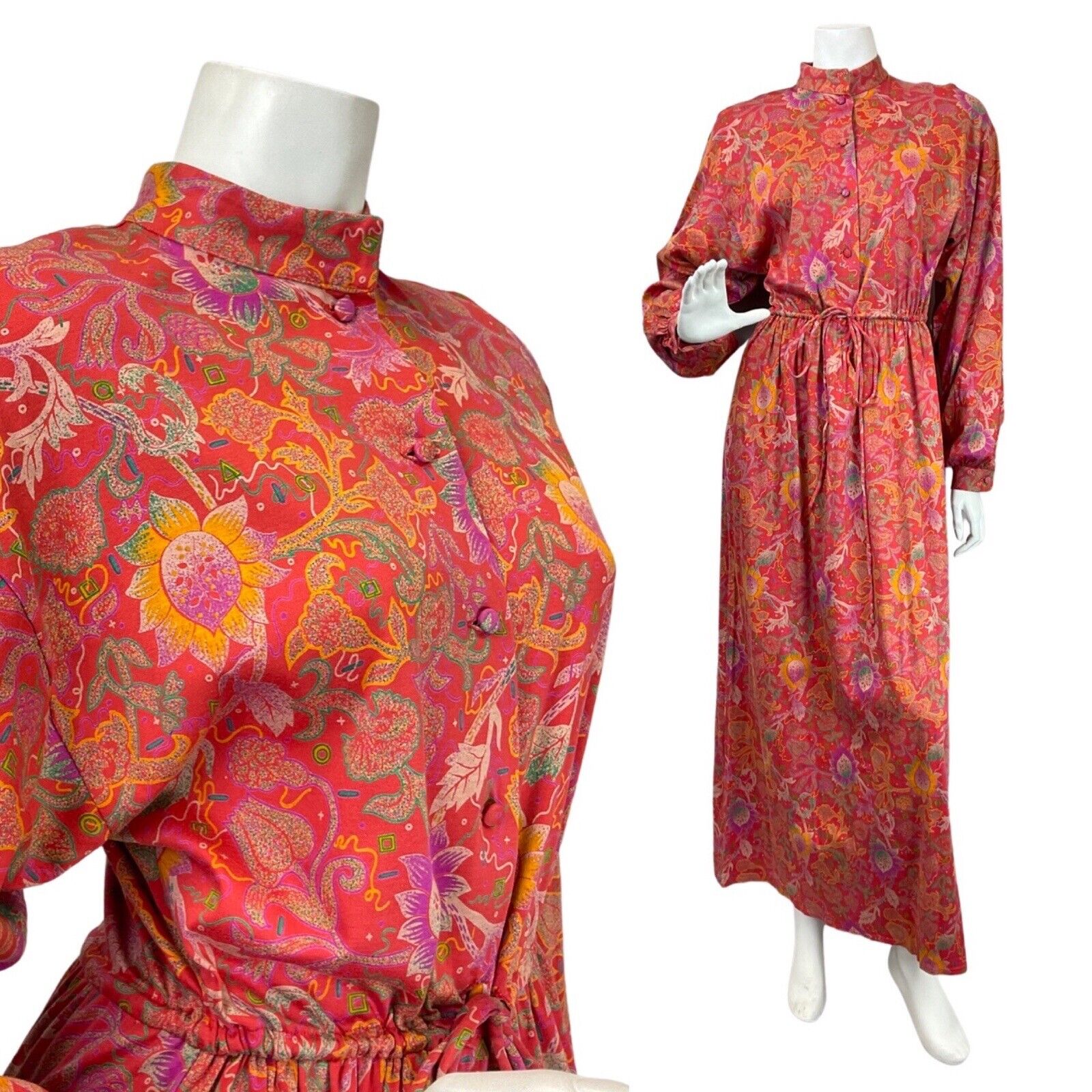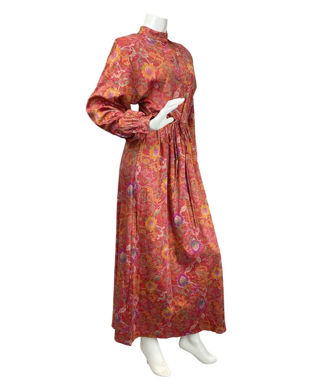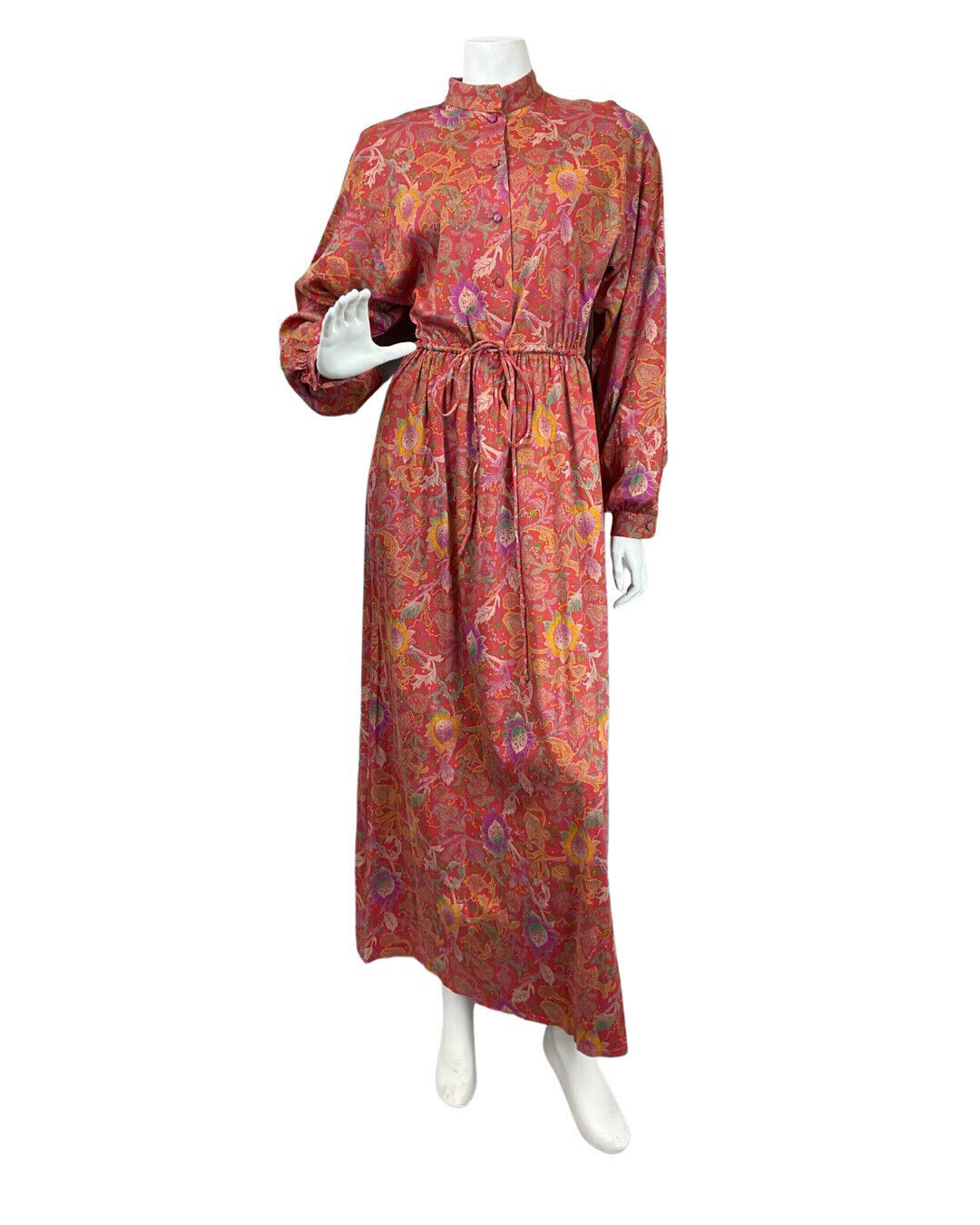 VINTAGE 70s RED PURPLE GREEN FLORAL PAISLEY BOHO LONGSLEEVE MAXI DRESS 10 12