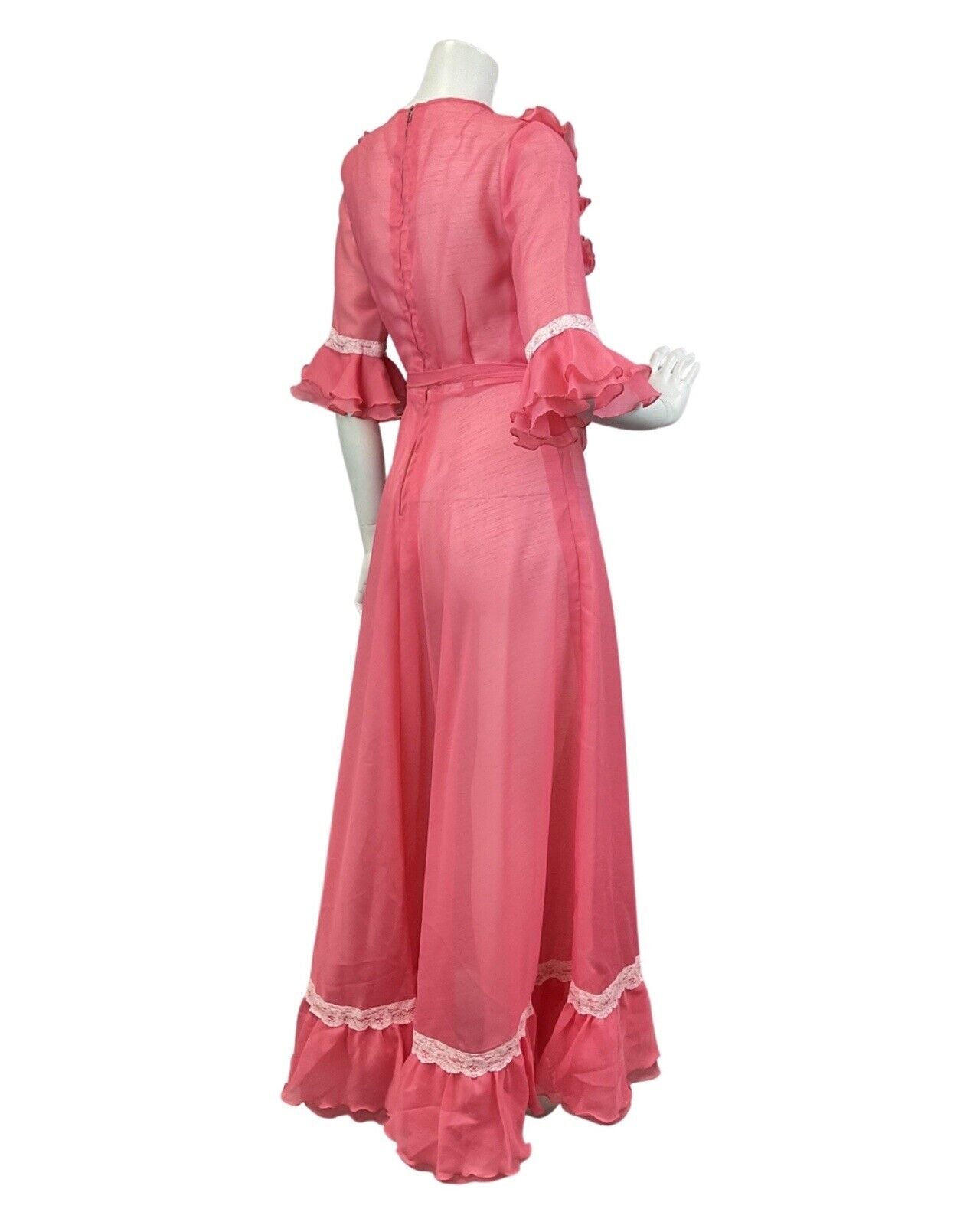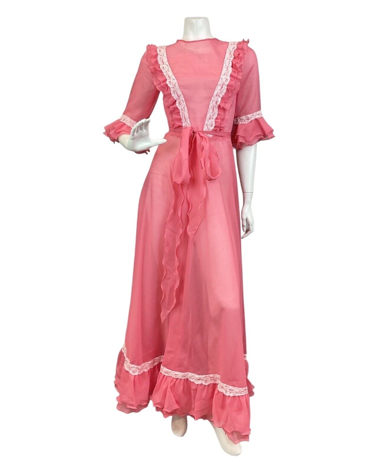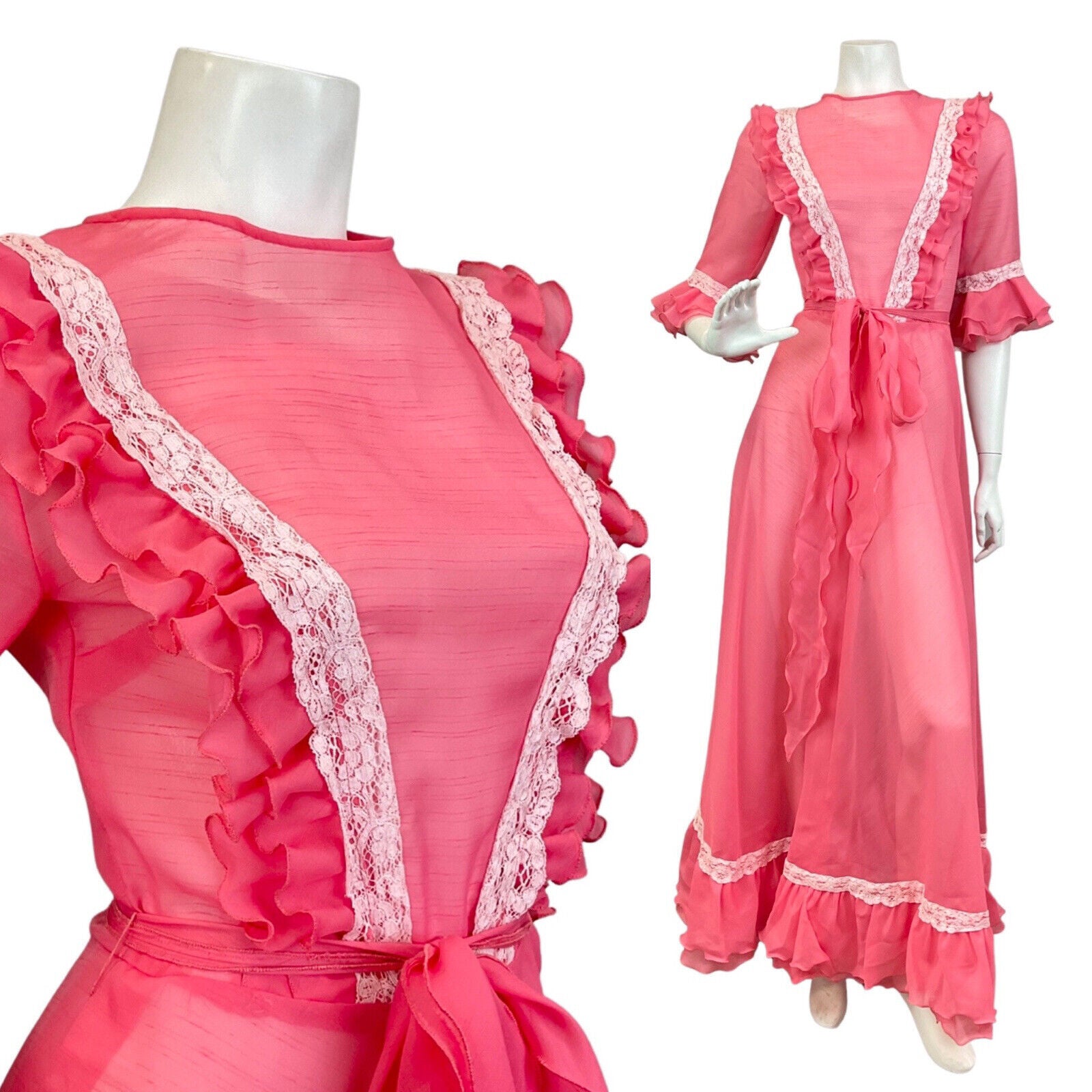 VINTAGE 70s SALMON PINK WHITE RUFFLED LACE SHEER PRAIRIE BOHO MAXI DRESS 6