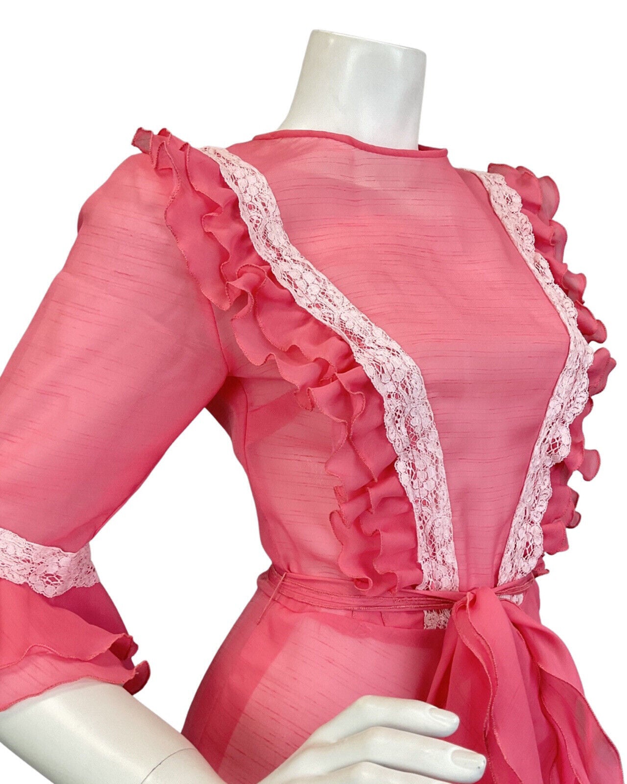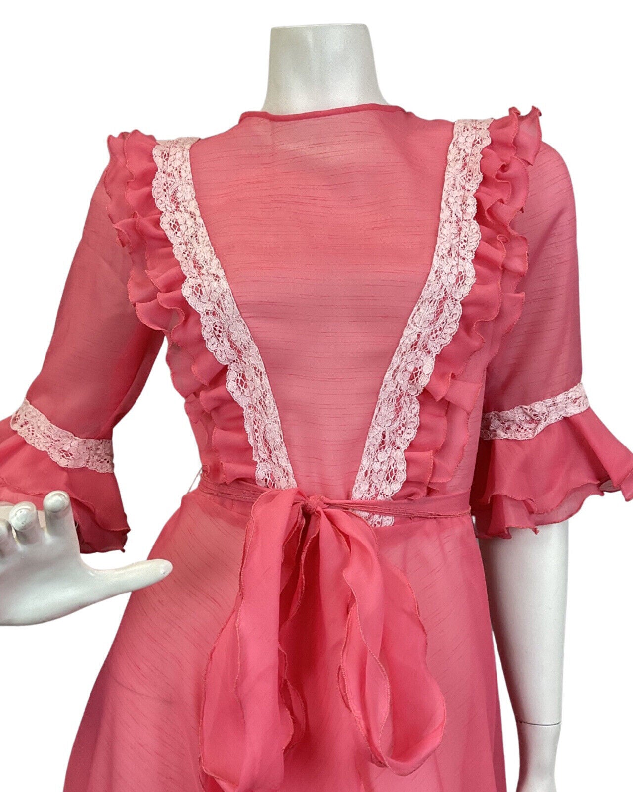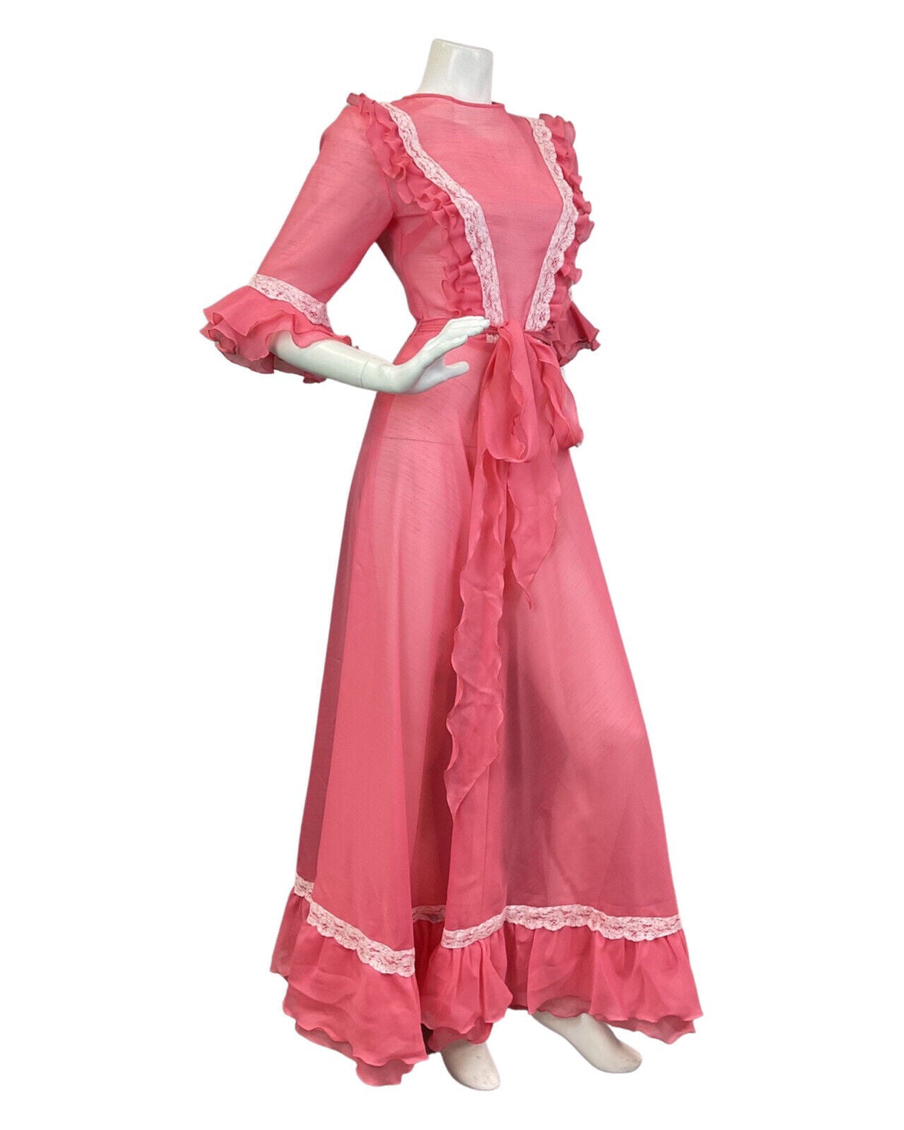 VINTAGE 70s SALMON PINK WHITE RUFFLED LACE SHEER PRAIRIE BOHO MAXI DRESS 6