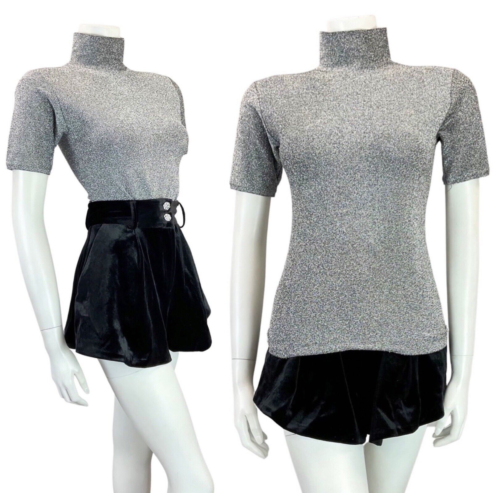 VINTAGE 70s SILVER GLITTER HIGH-NECK SHORT SLEEVE FITTED LUREX BLOUSE TOP 6 8