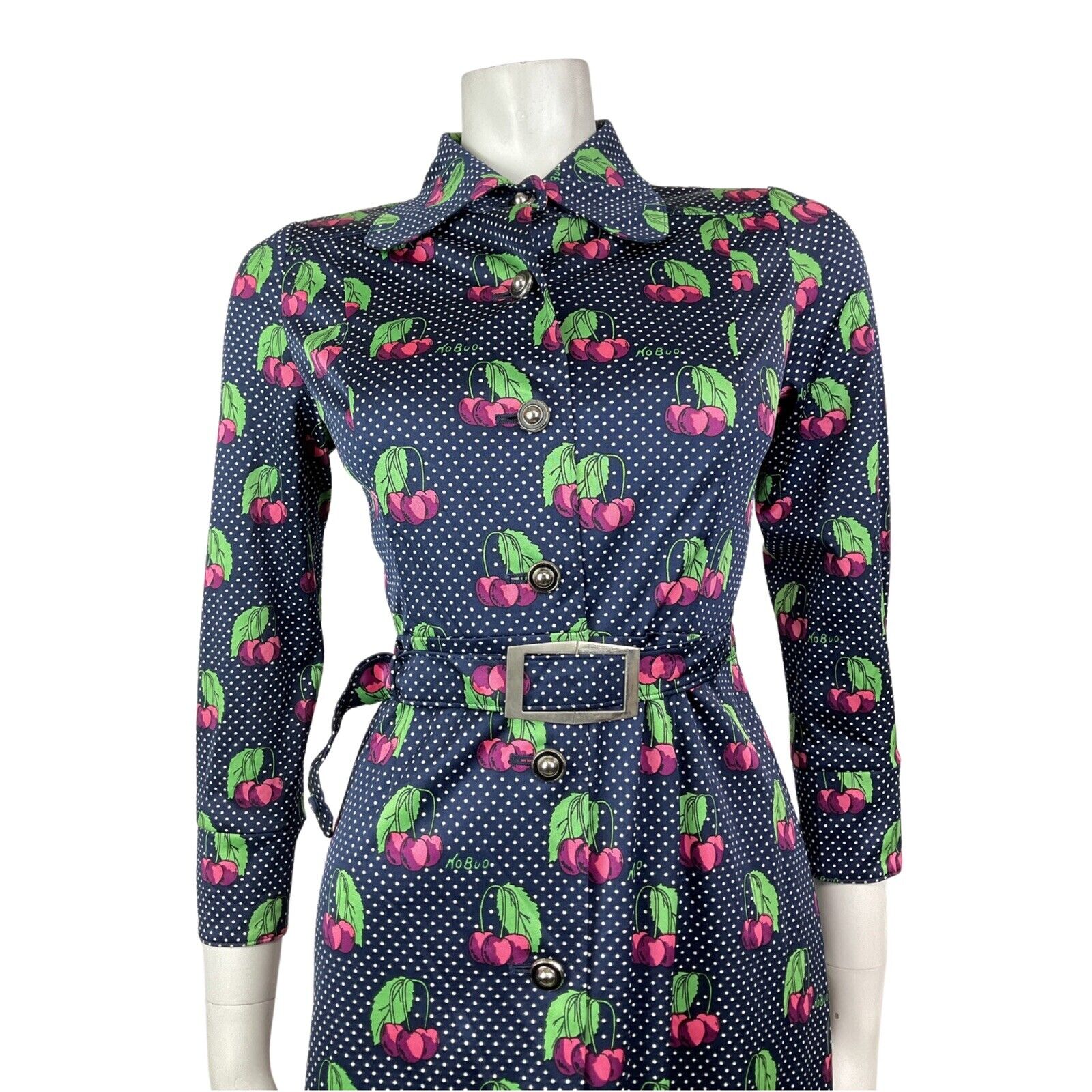 VINTAGE 70s STYLE 90s BLUE WHITE PINK POLKA-DOT CHERRY DAGGER SHIRT DRESS 8 10