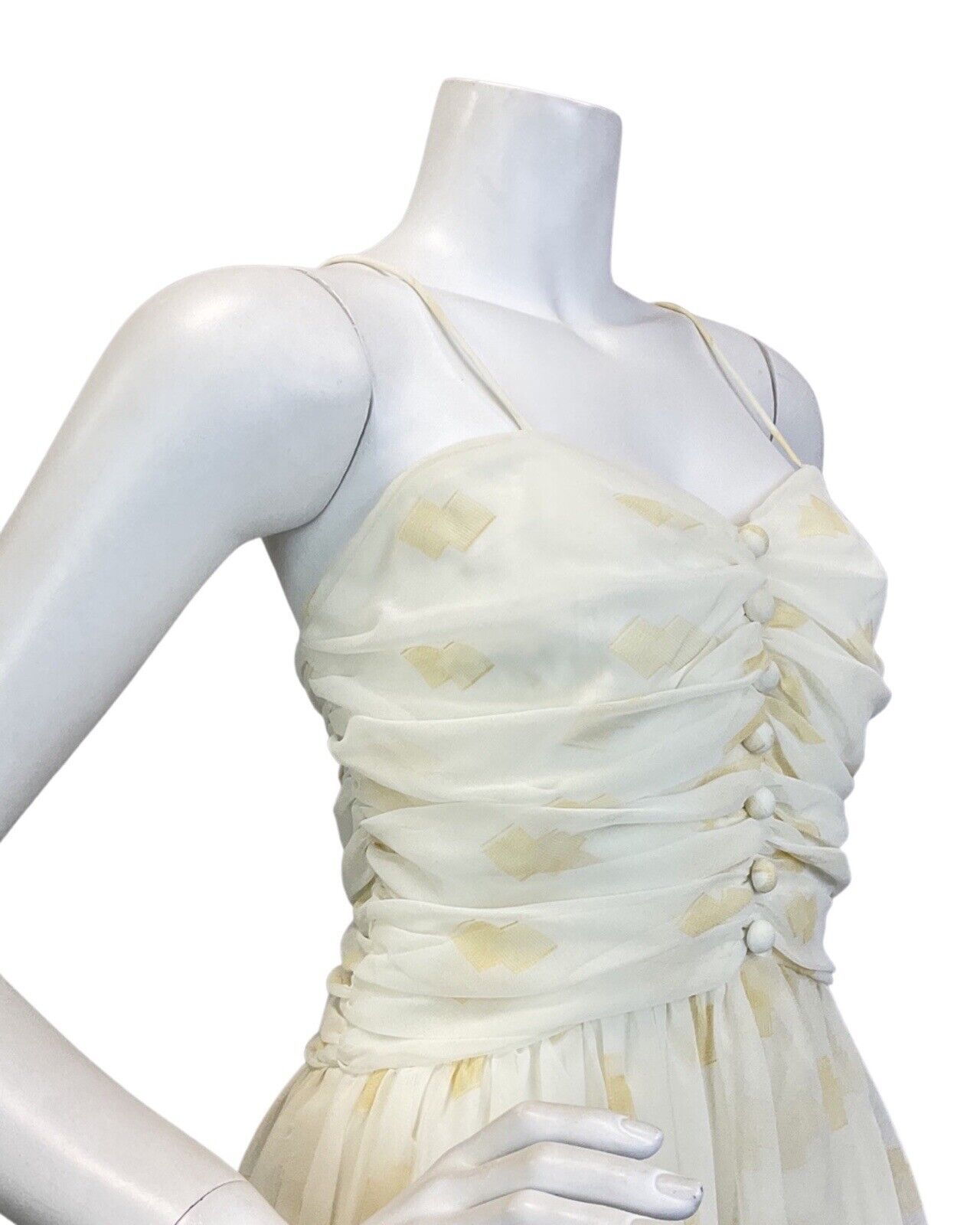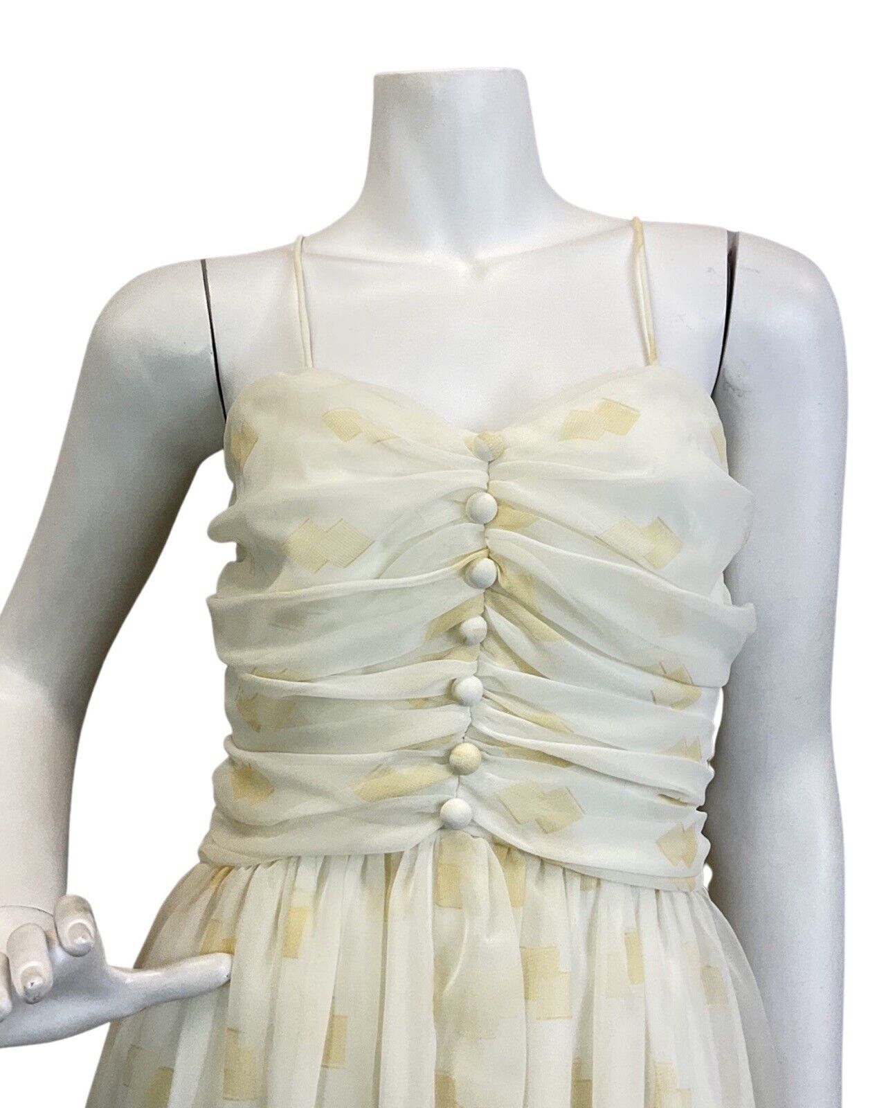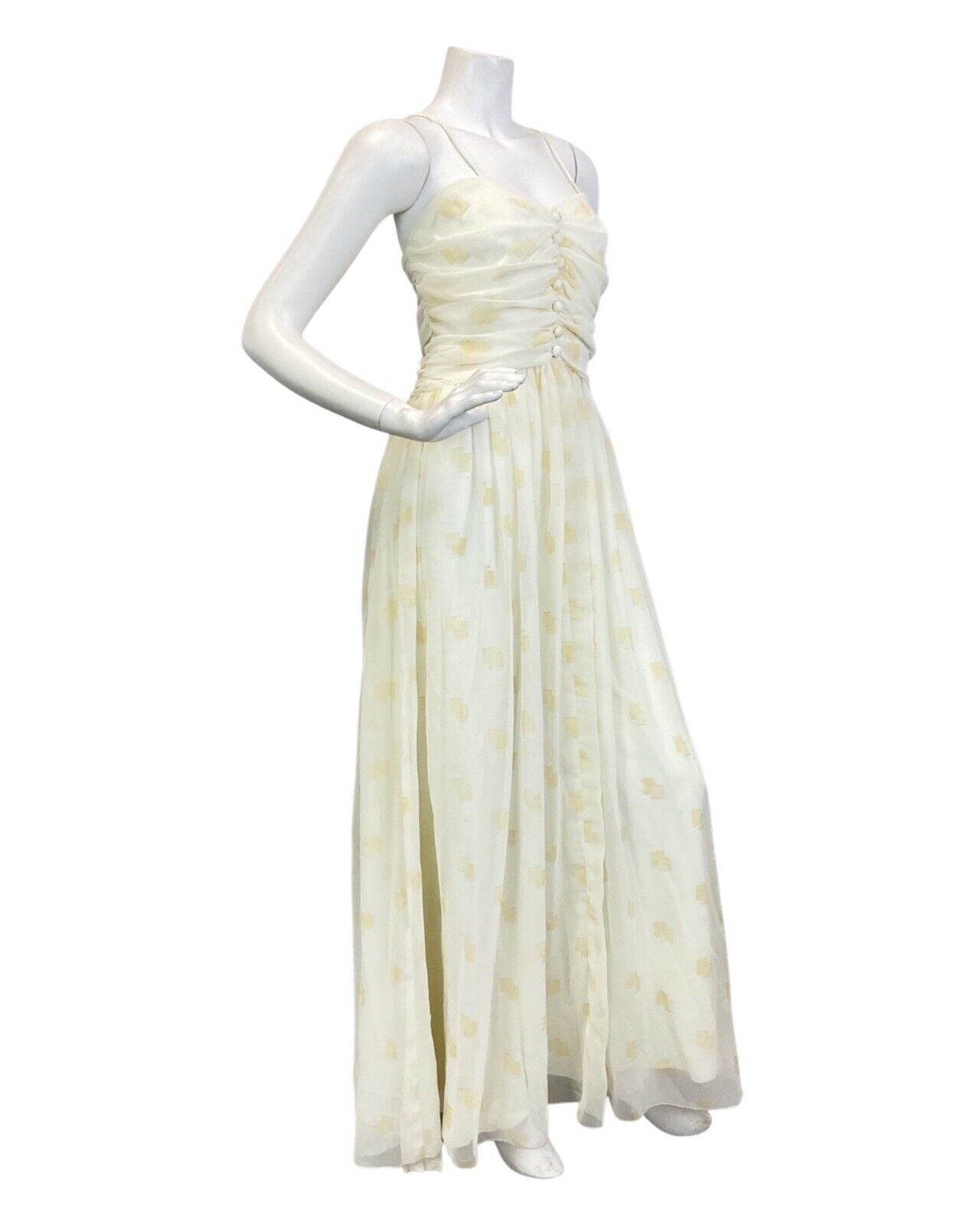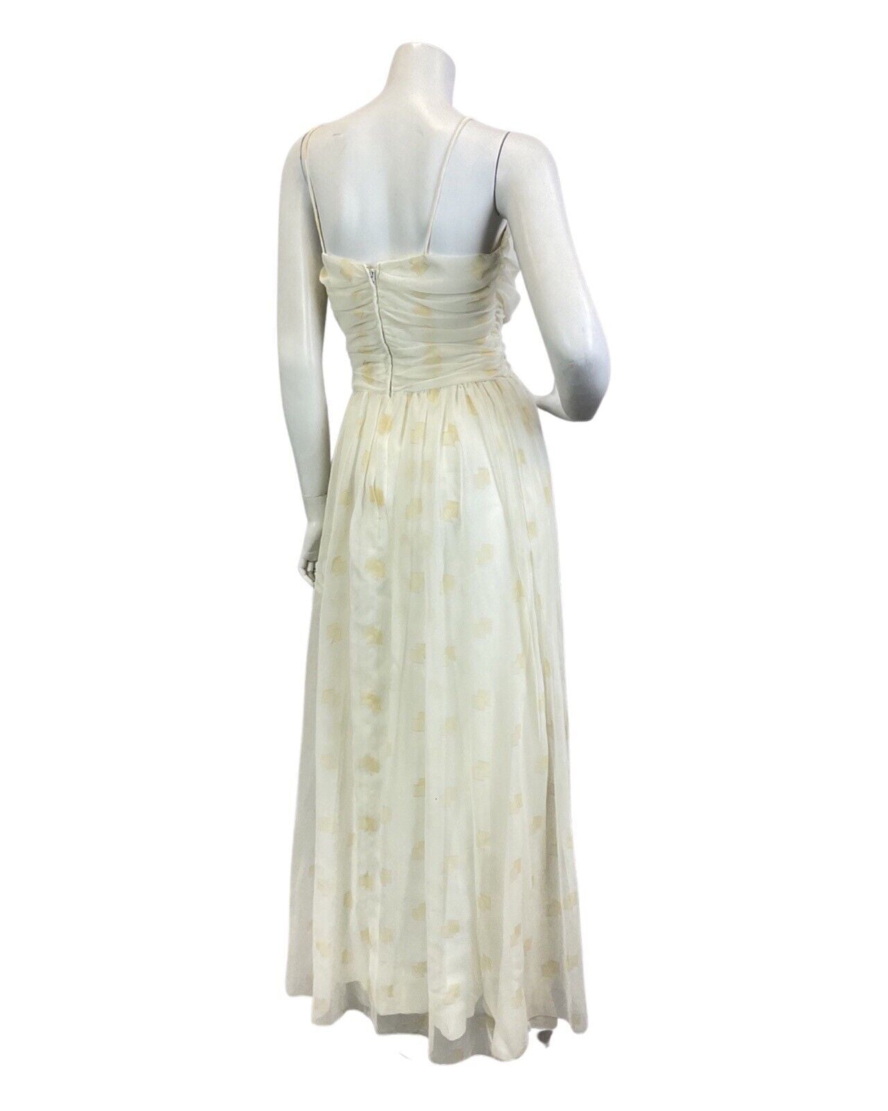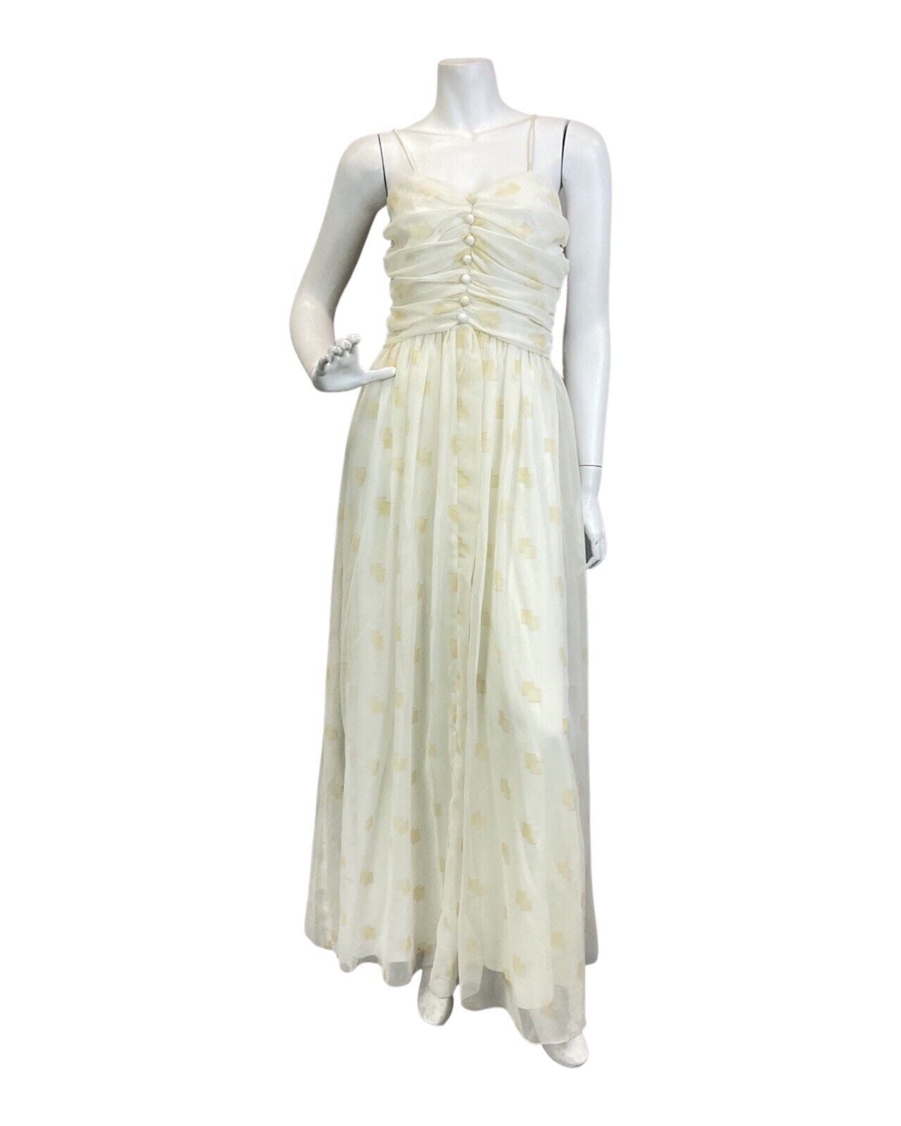 VINTAGE 70s WHITE GOLD SHEER SPAGHETTI STRAP EVENING GOWN MAXI DRESS 8