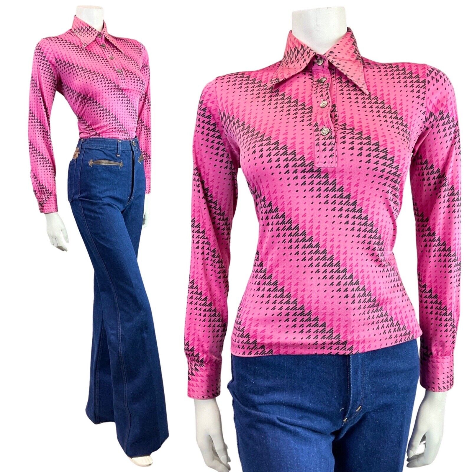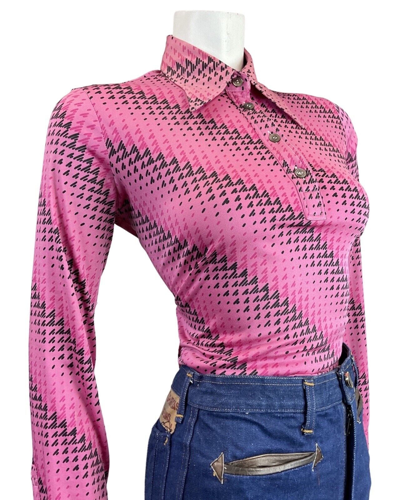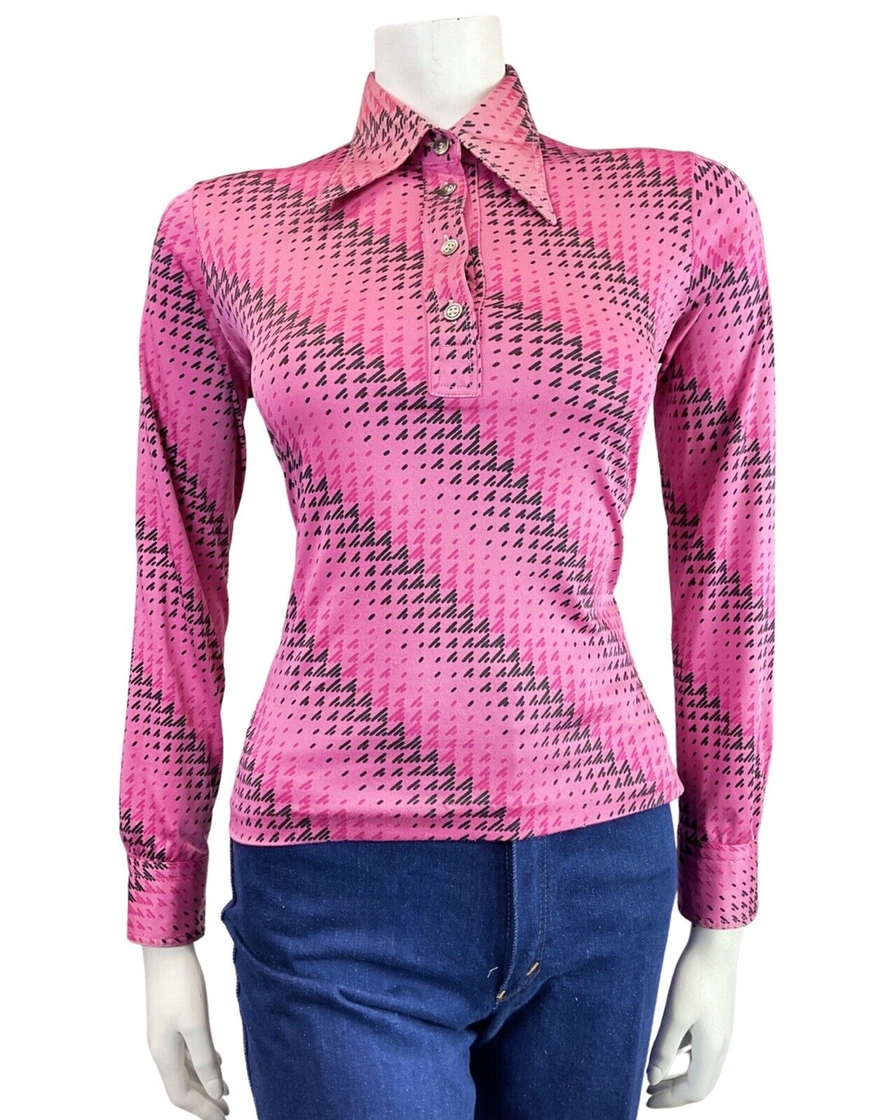 VINTAGE 90 does 70s PINK BLUE WHITE GEOMETRIC DASH MOD DAGGER BLOUSE 10 12