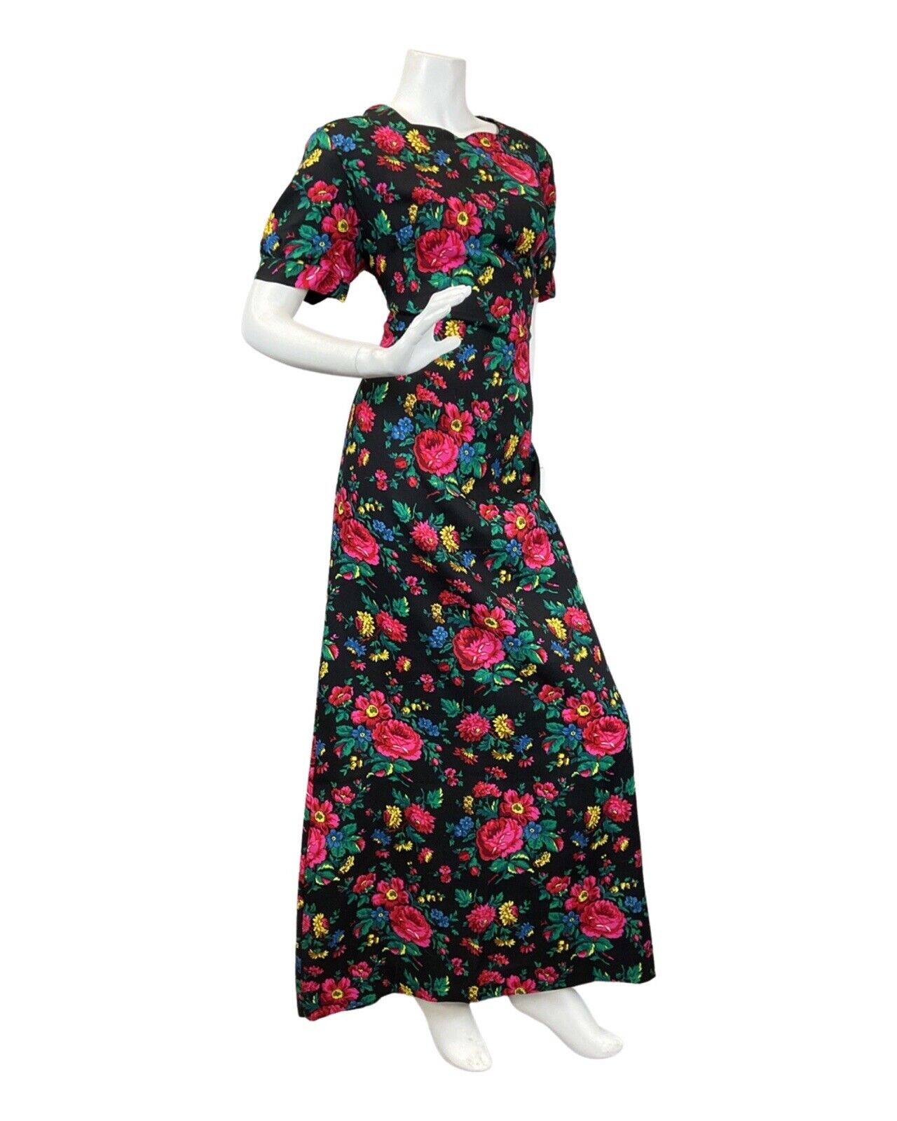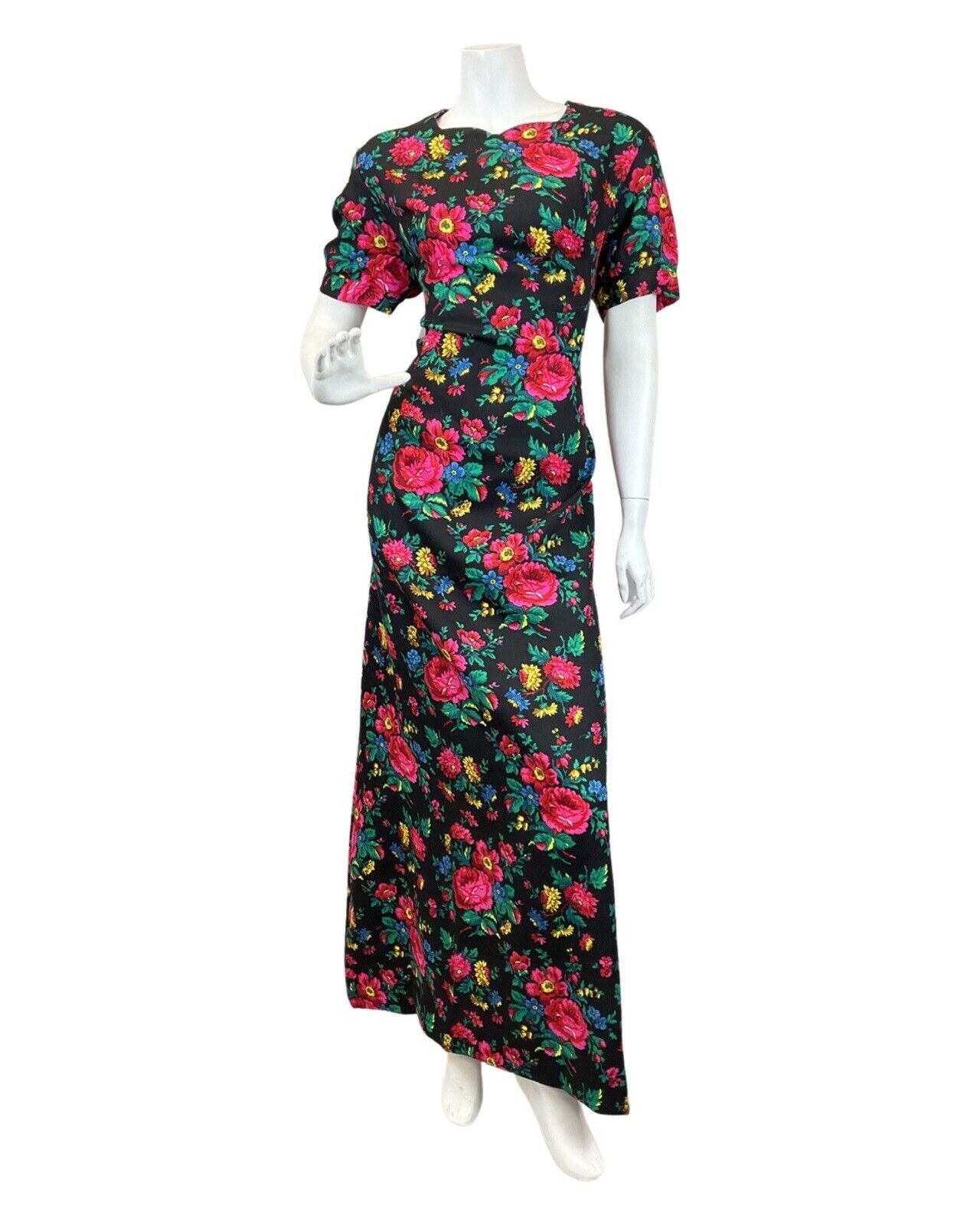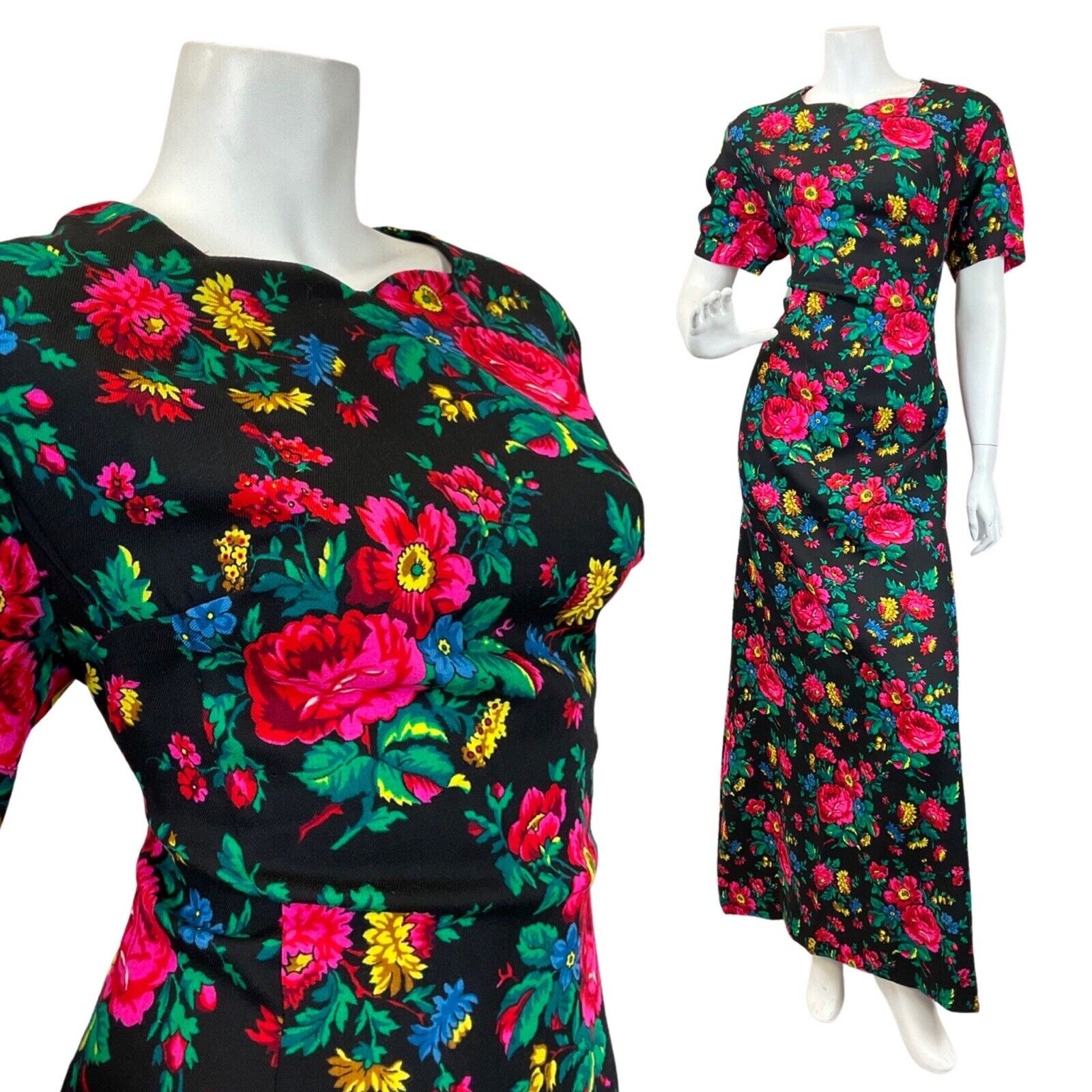 VNITAGE 60s 70s BLACK RED GREEN FLORAL ROSE SWEETHEART MOD MAXI DRESS 14 16