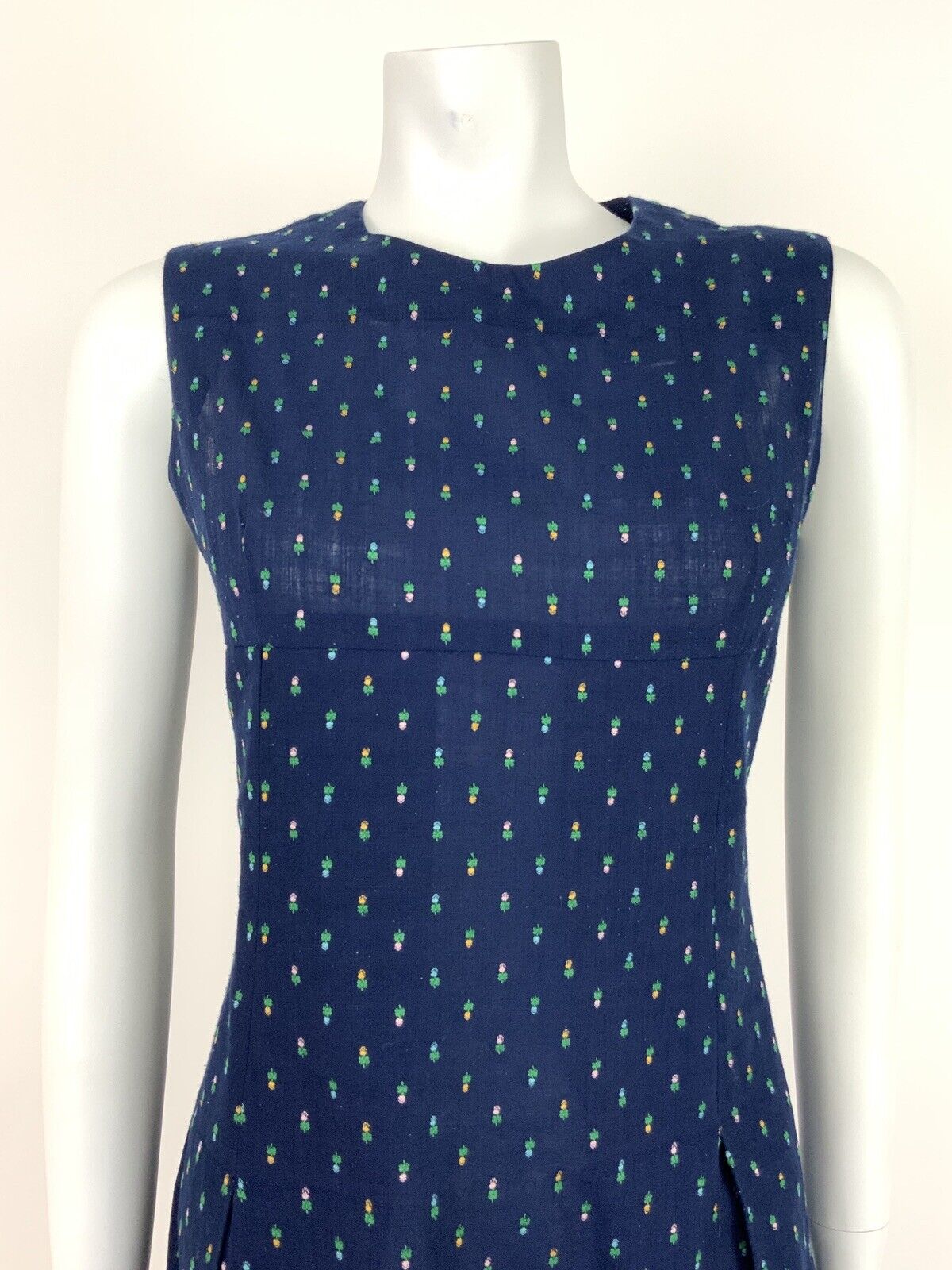 VTG 60s 70s A-LINE BLUE SUN DRESS FLORAL TULIP EMBROIDERED PINK YELLOW 10 12