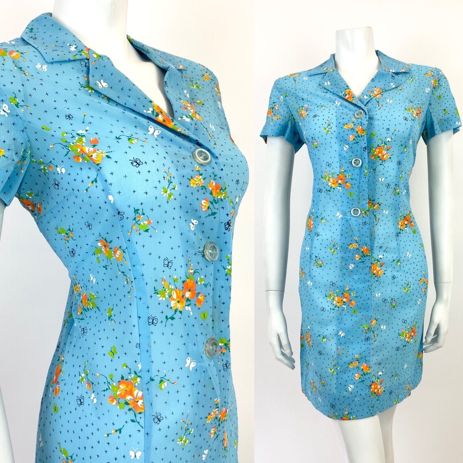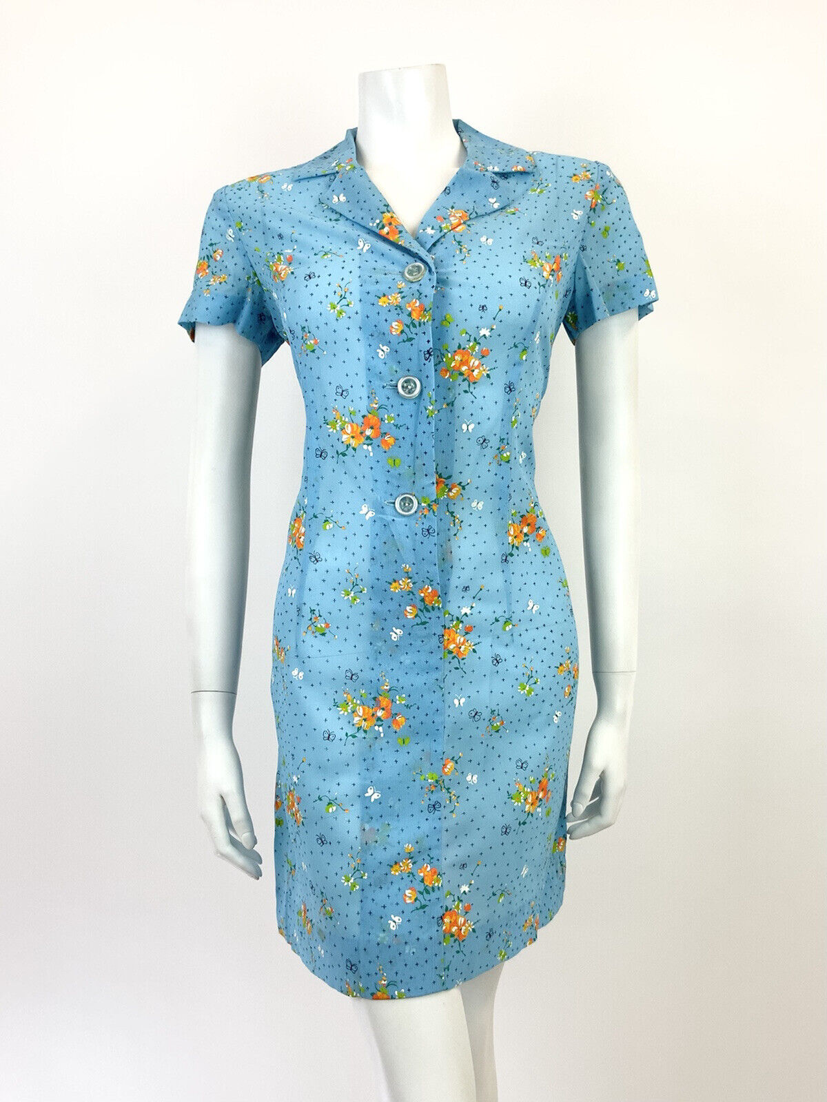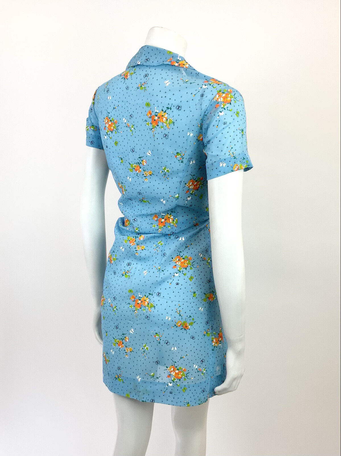 VTG 60s 70s BABY BLUE WHITE ORANGE FLORAL BUTTERFLY MOD SHEER SHIRT DRESS 10 12
