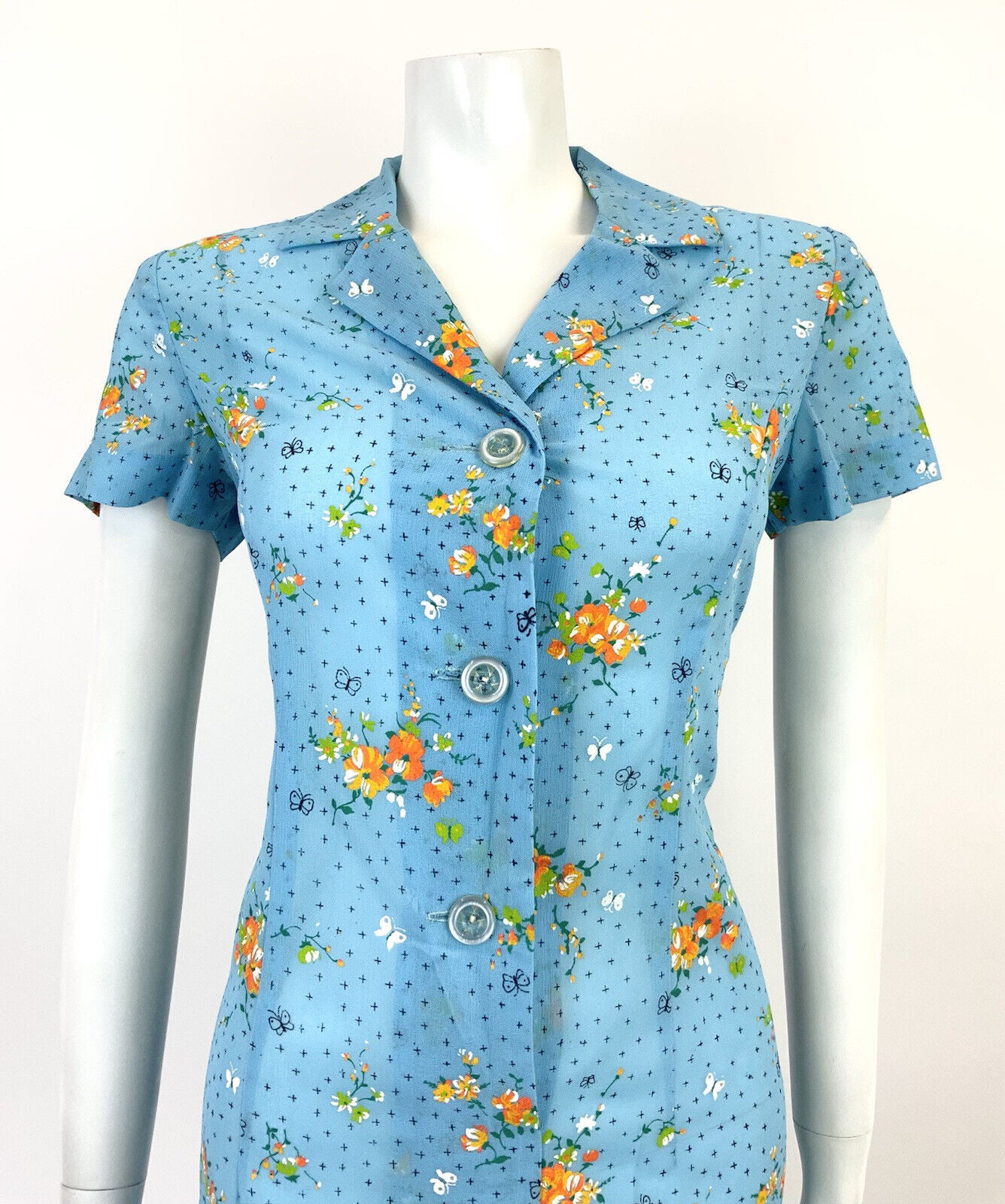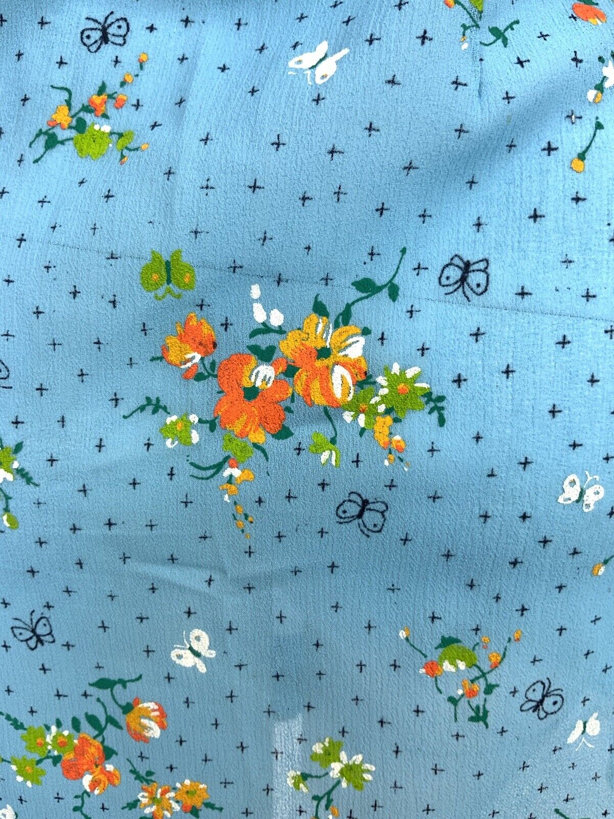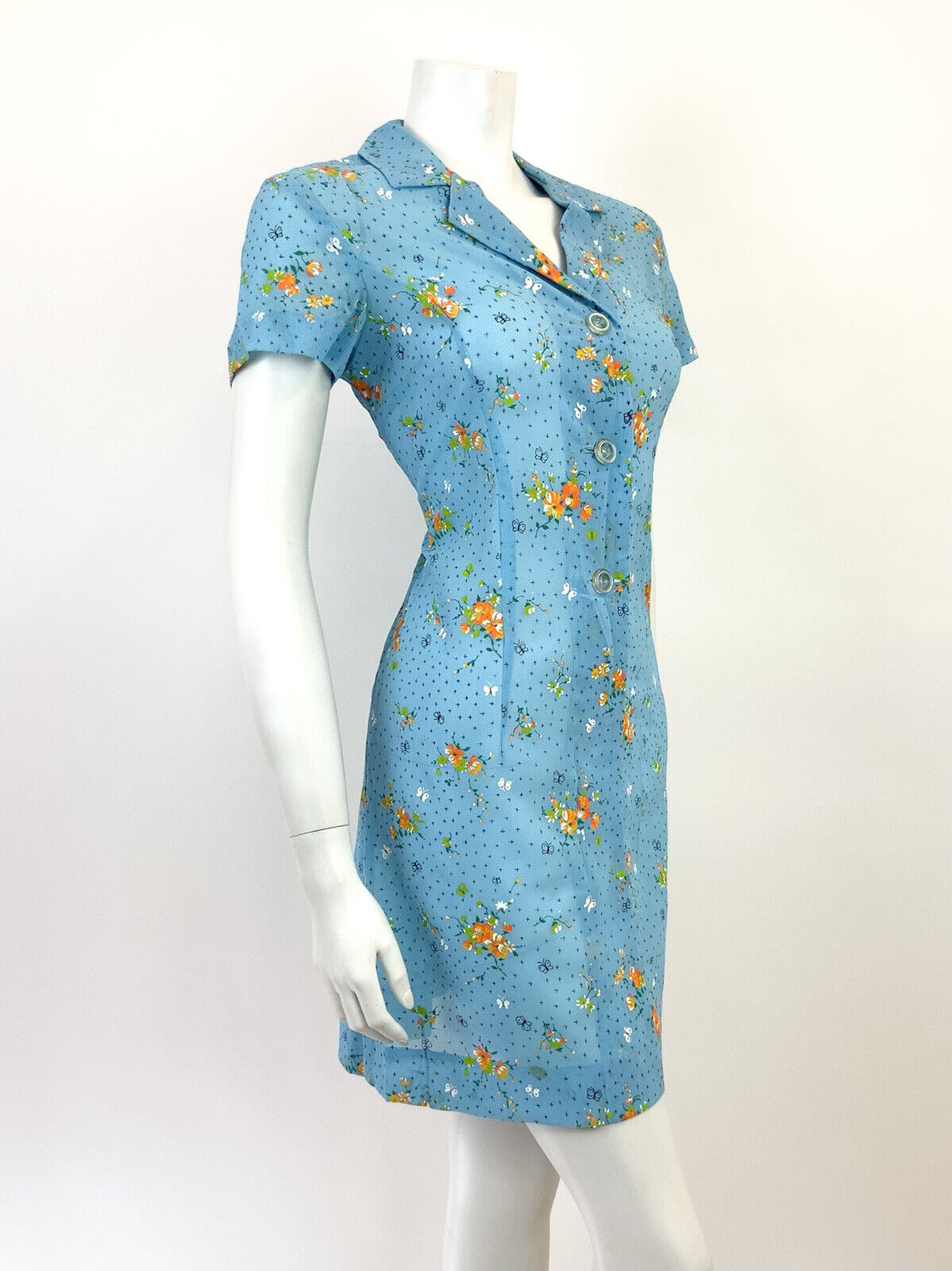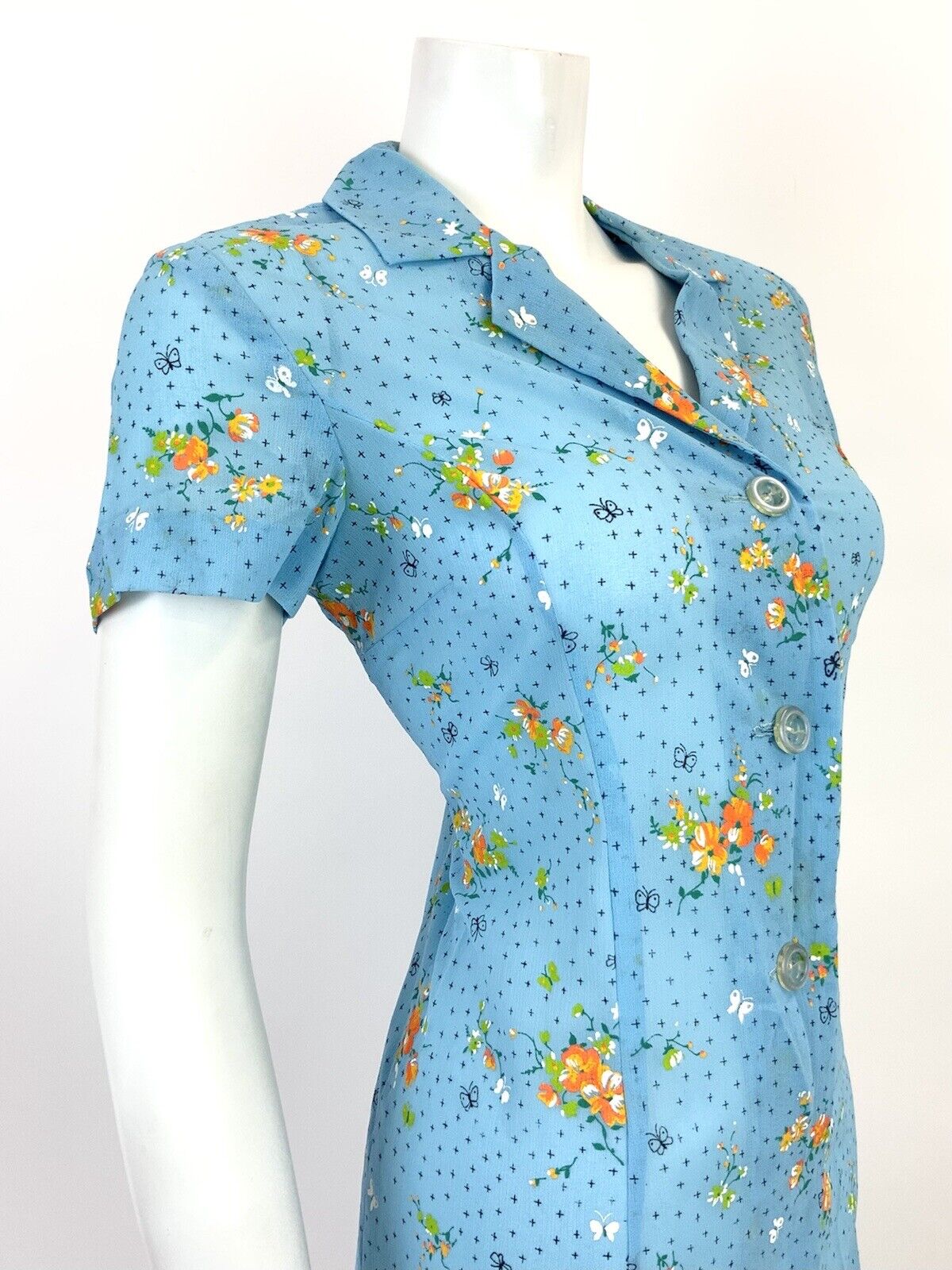 VTG 60s 70s BABY BLUE WHITE ORANGE FLORAL BUTTERFLY MOD SHEER SHIRT DRESS 10 12