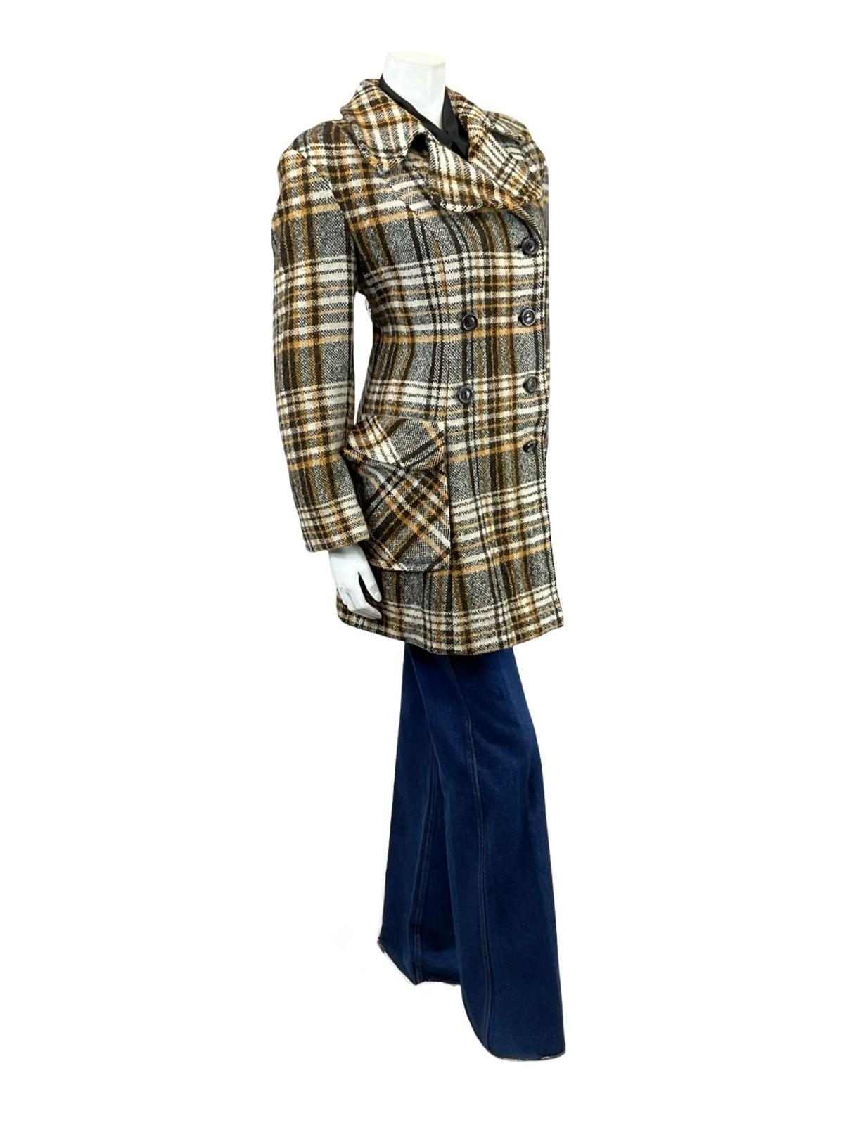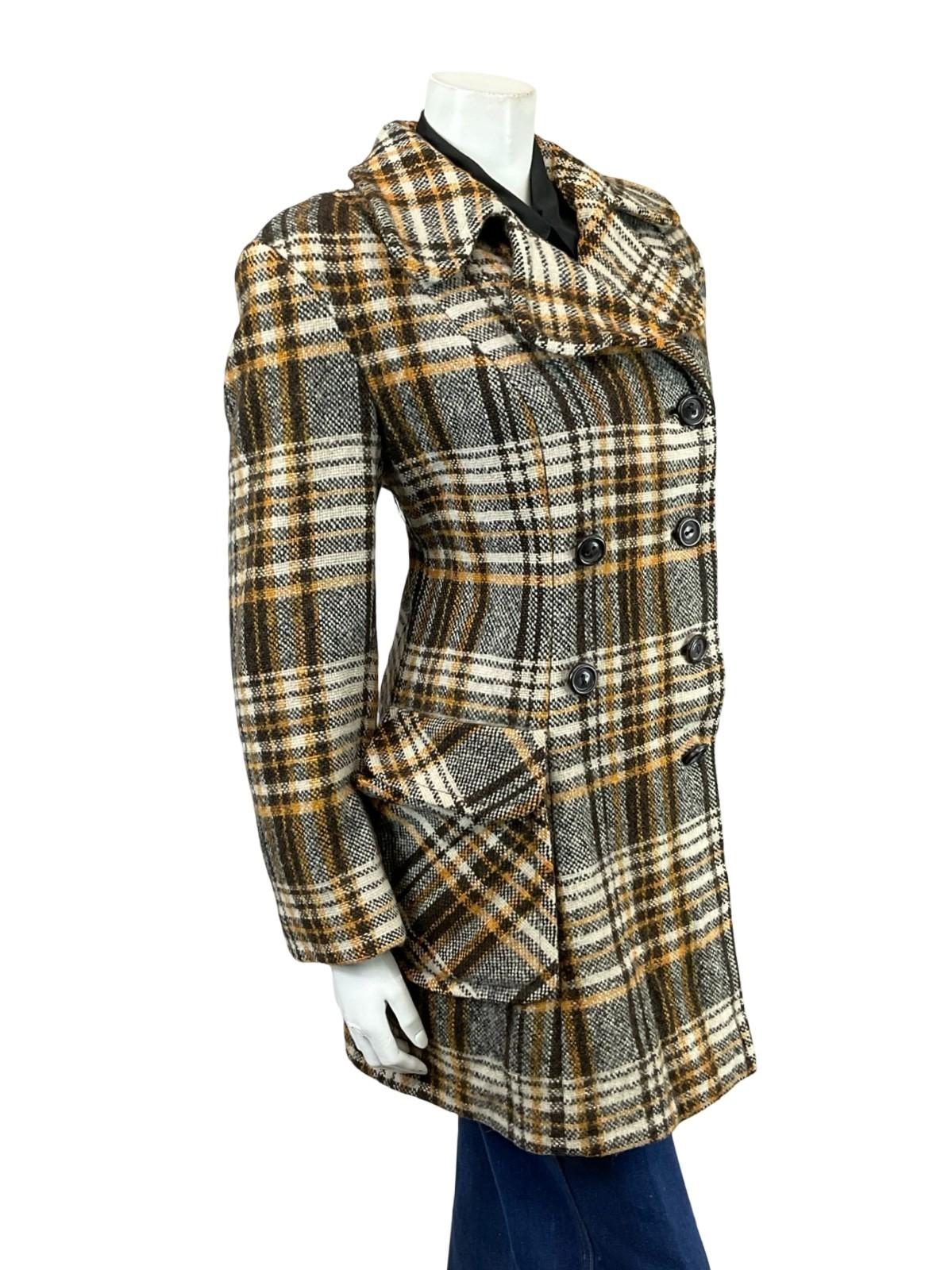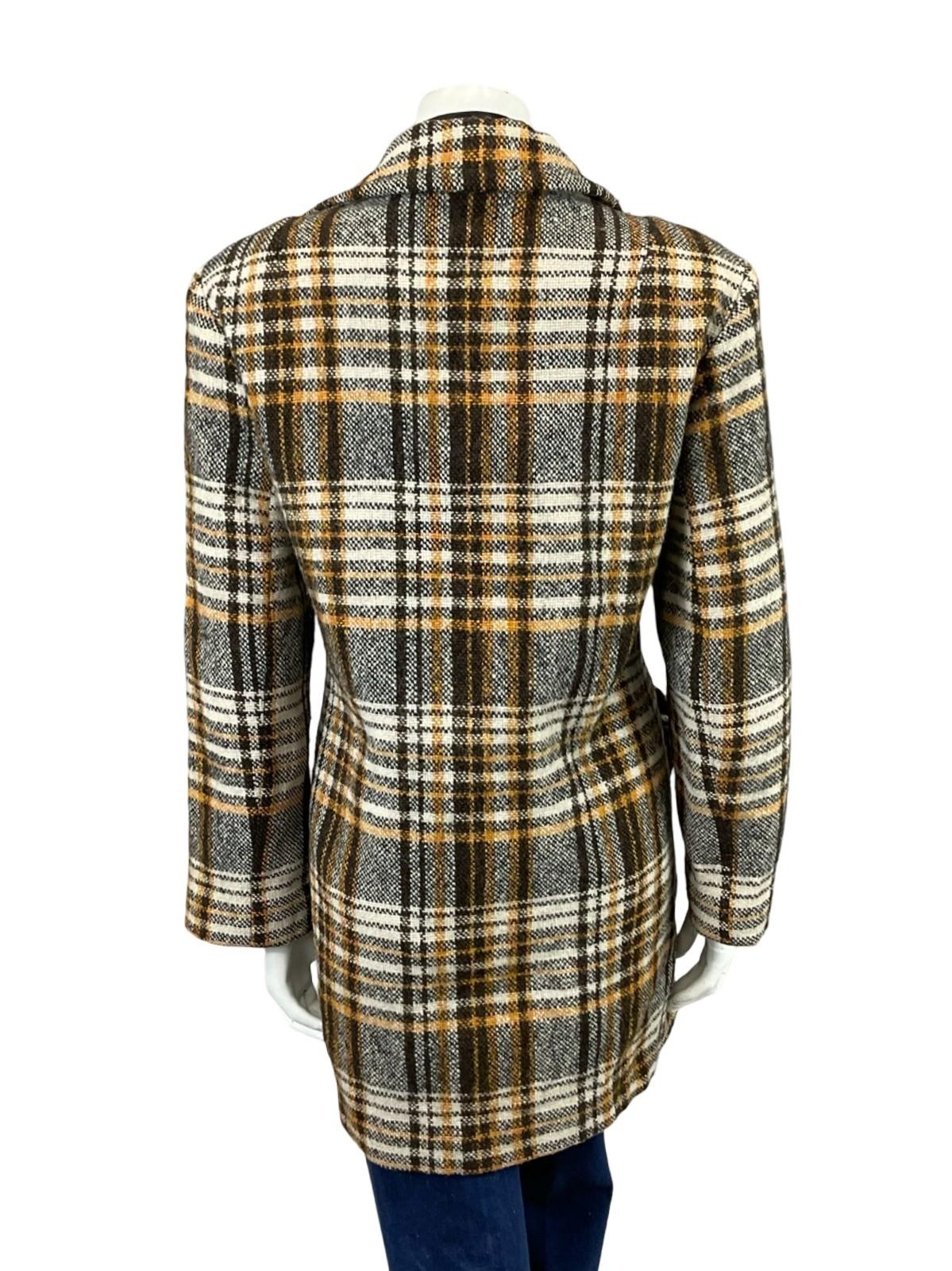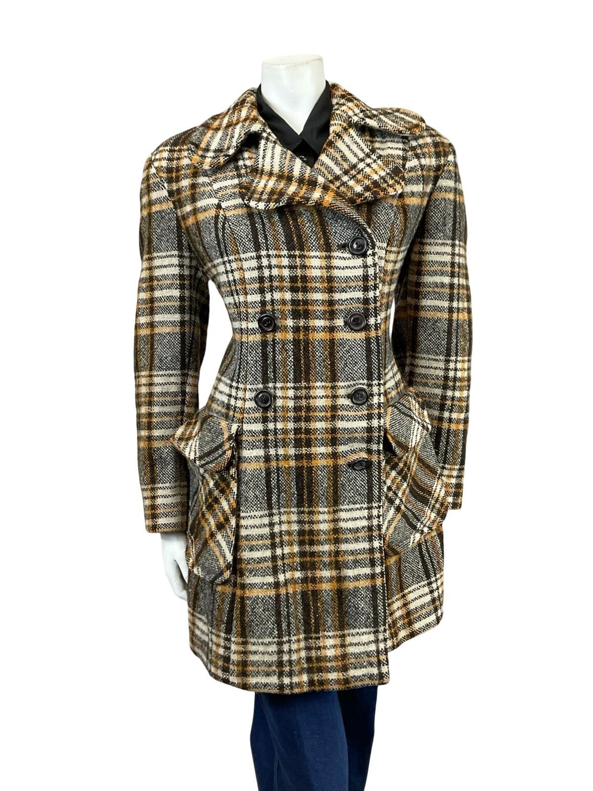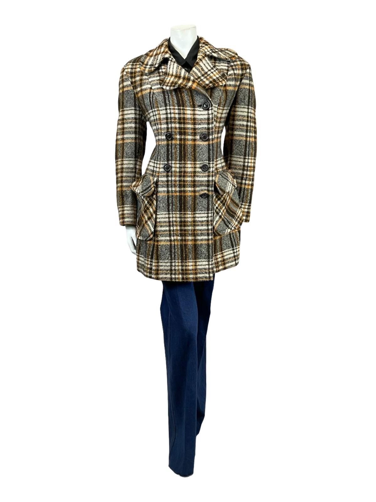 This is a lovely 60s 70s long sleeve wool coat featuring rounded dog ear notch lapels and brown double breasted buttoning. This coat has two flap pockets both with a depth of 7". The outer fabric is a plaid wool in beige, brown and cream, and the coat is lined with a brown synthetic.