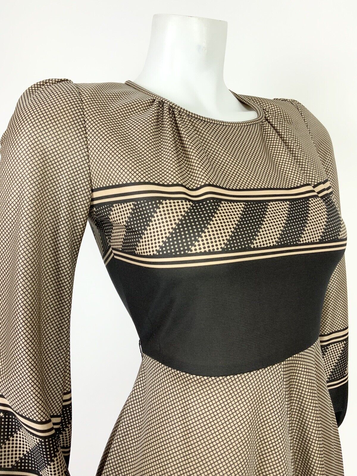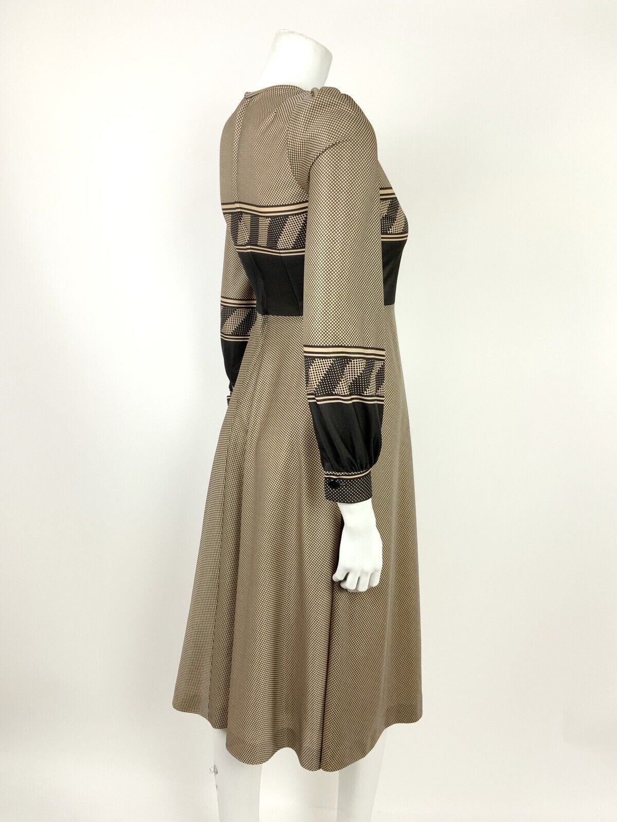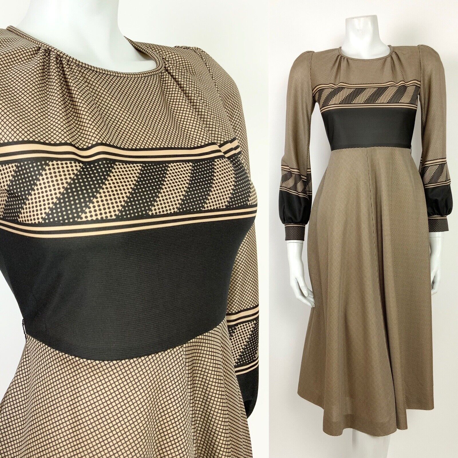 VTG 60s 70s BEIGE WHITE BLACK GRID GEOMETRIC POLKA DOT KNEE-LENGTH SWING DRESS 8