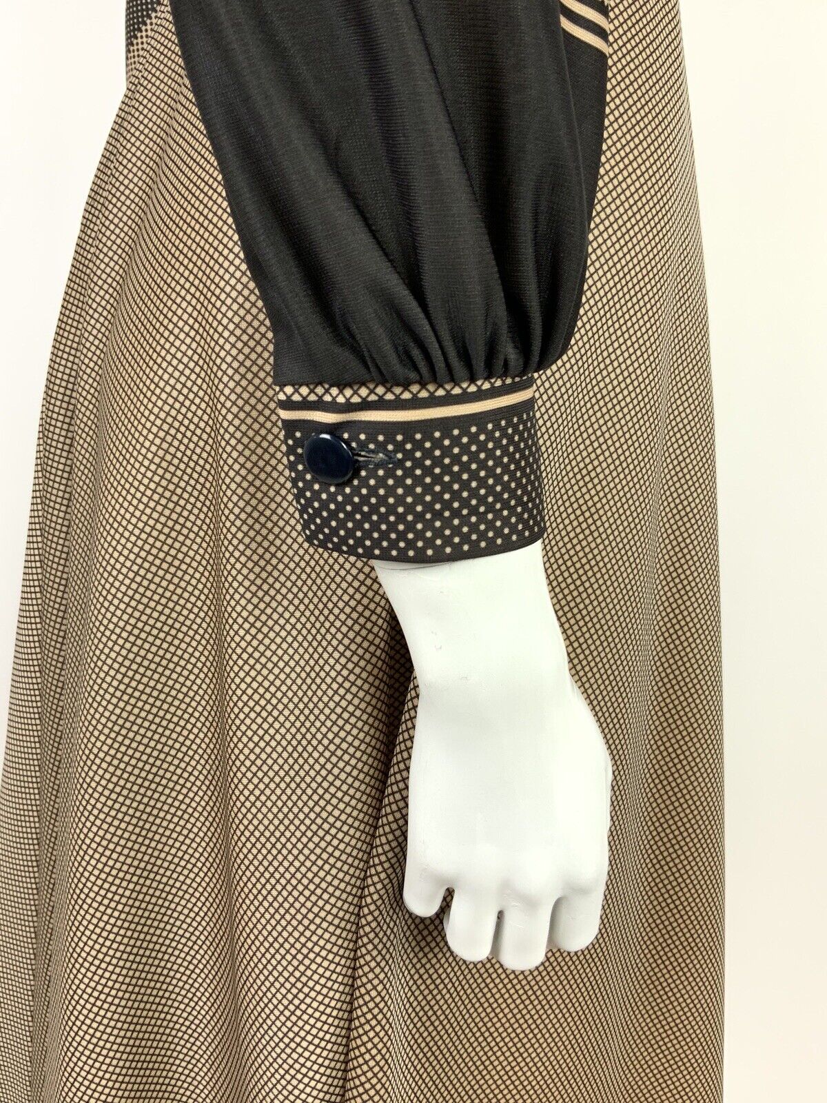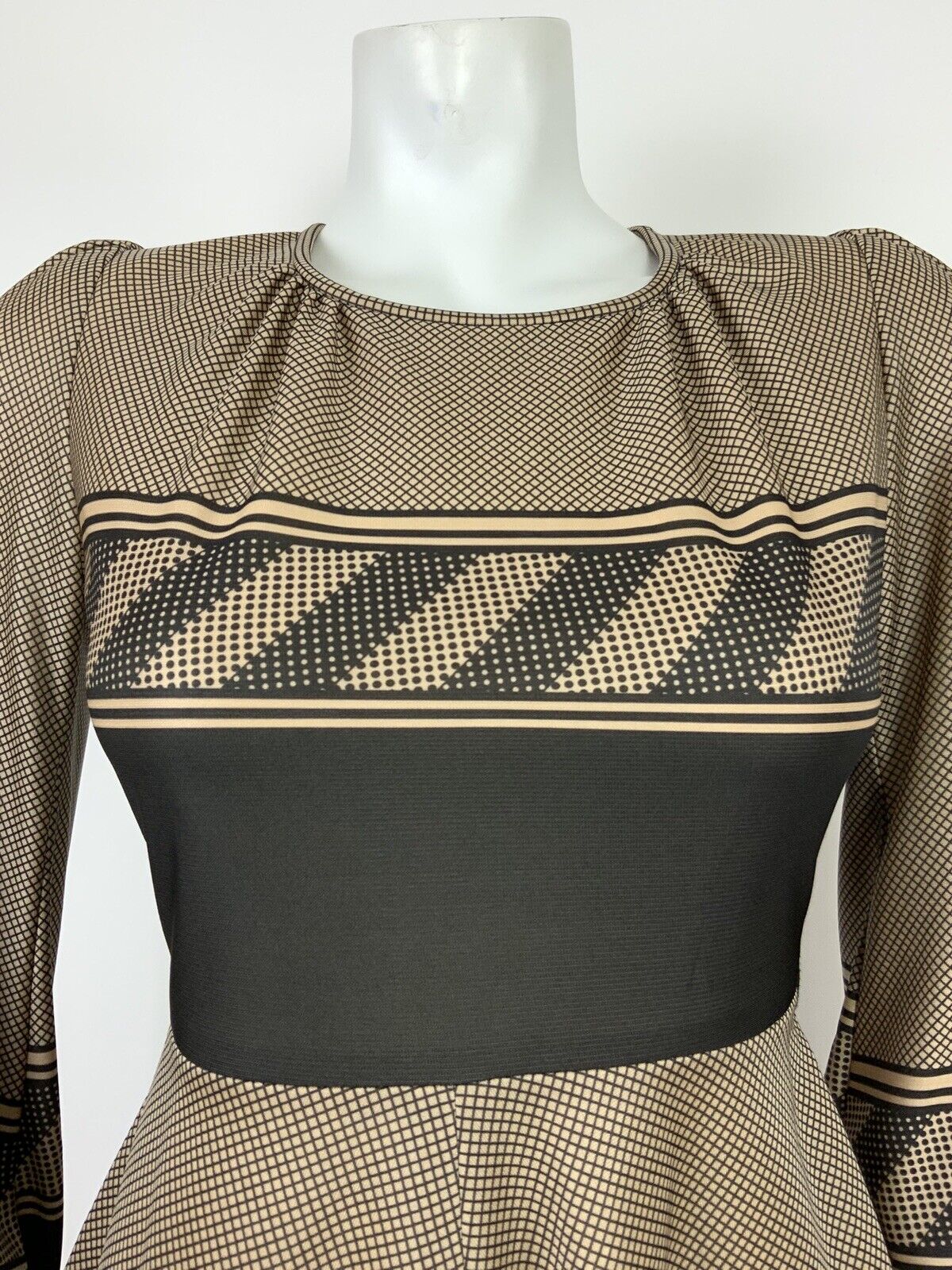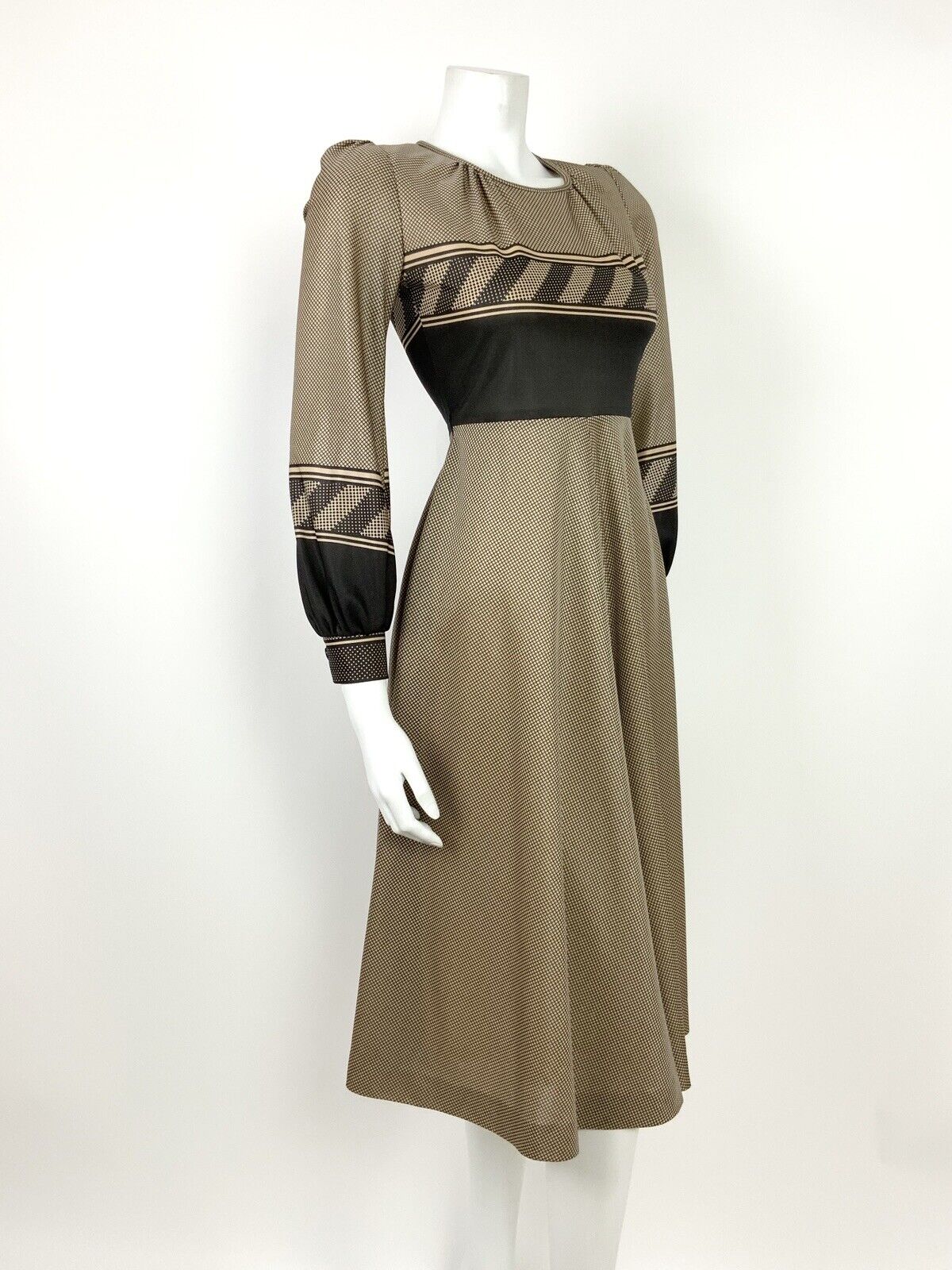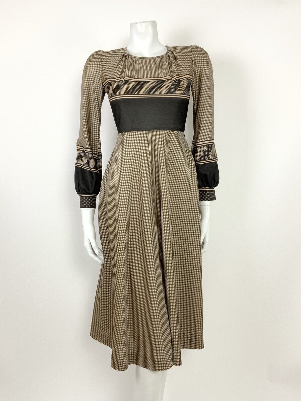 VTG 60s 70s BEIGE WHITE BLACK GRID GEOMETRIC POLKA DOT KNEE-LENGTH SWING DRESS 8