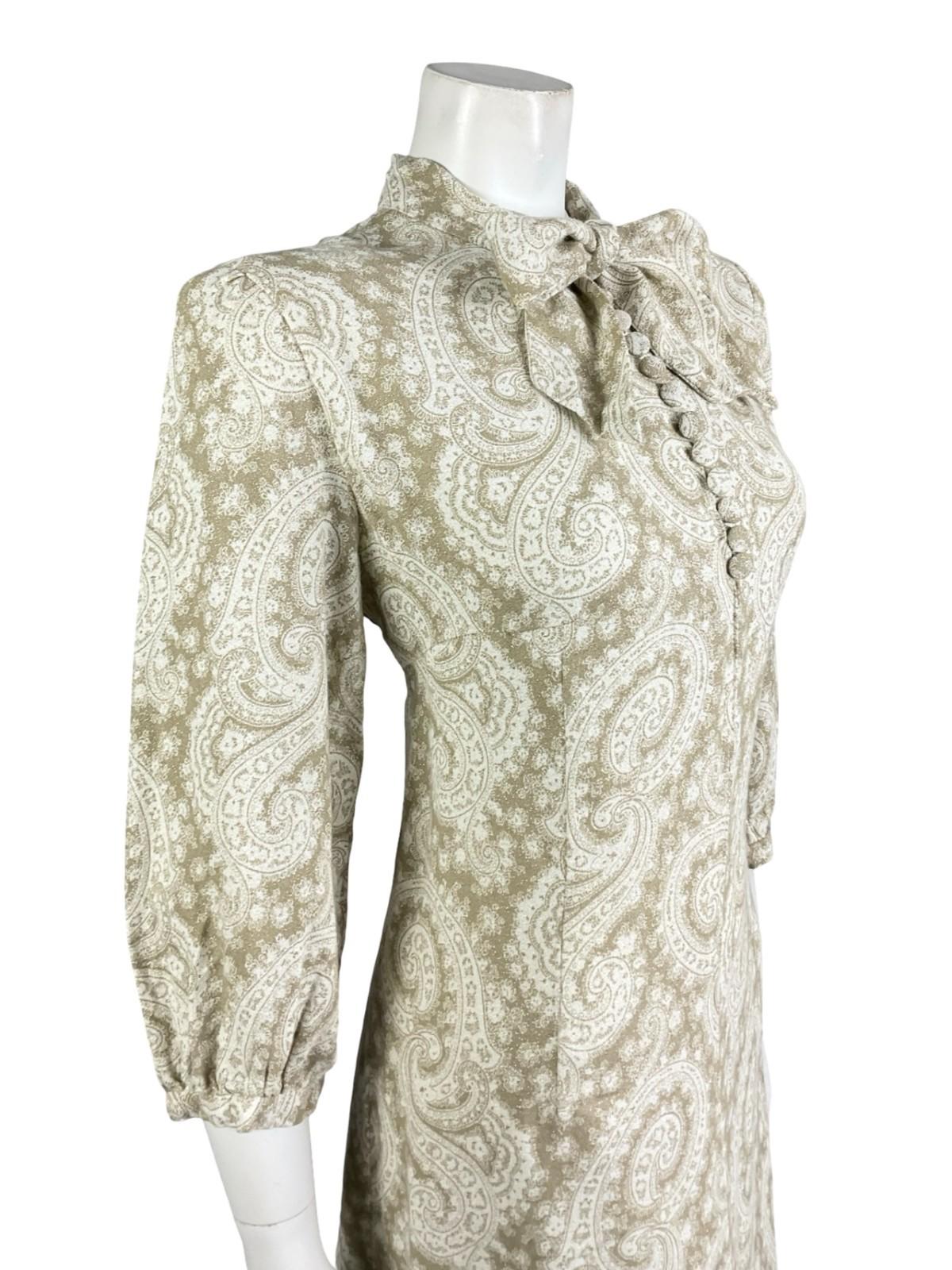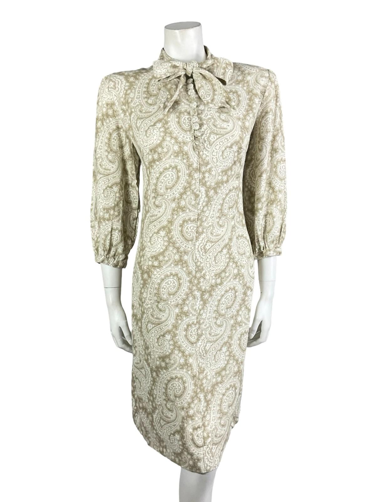VTG 60S 70S BEIGE WHITE PSYCHEDELIC SWIRL LUREX GLITTERY PUSSYBOW SHIFT DRESS 12