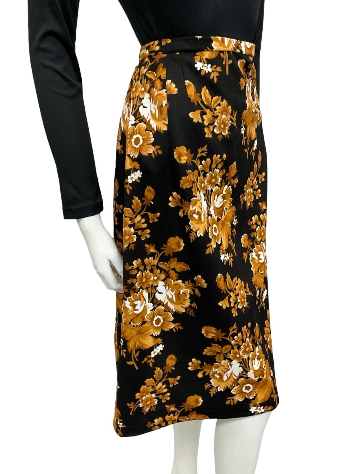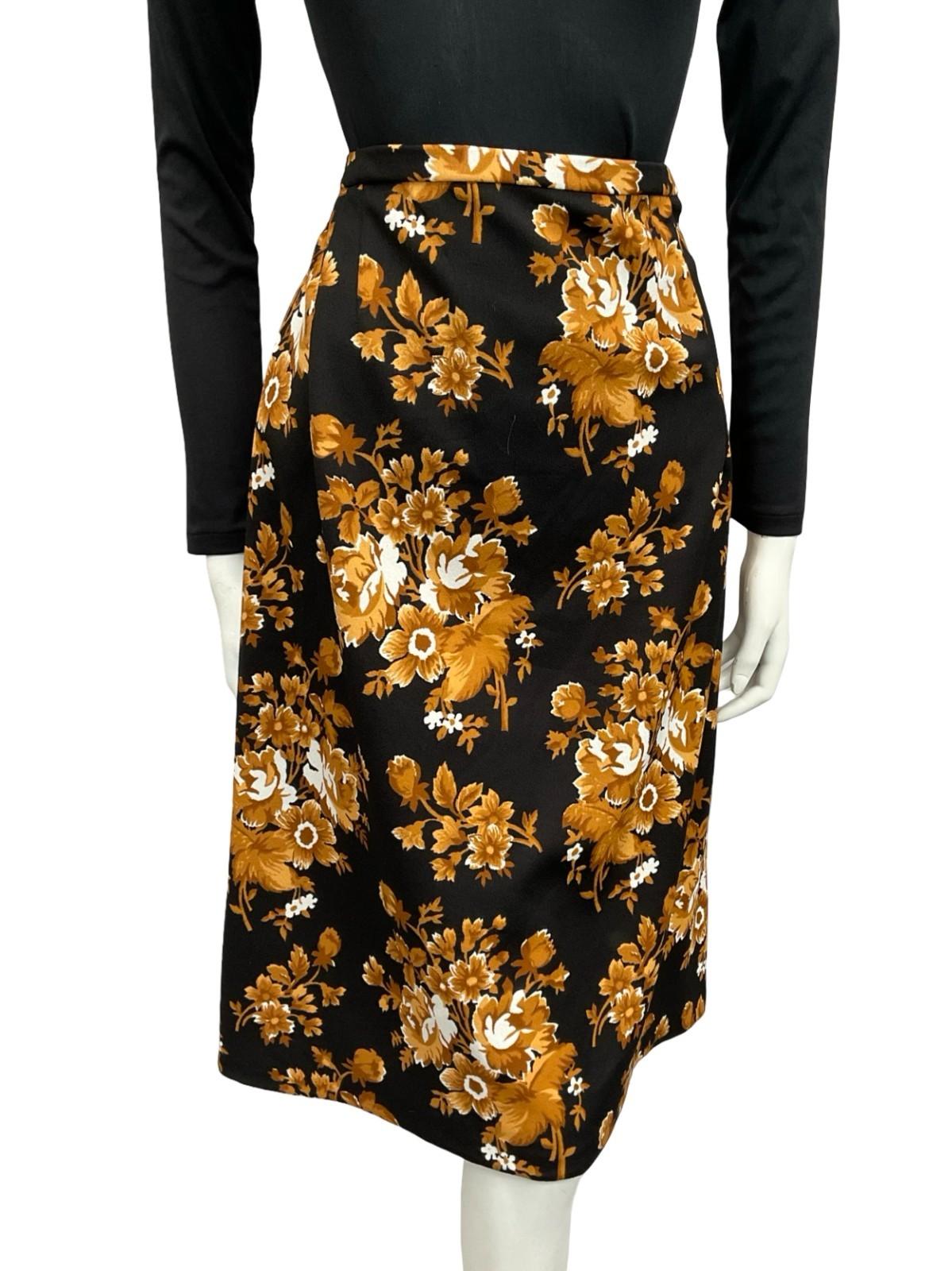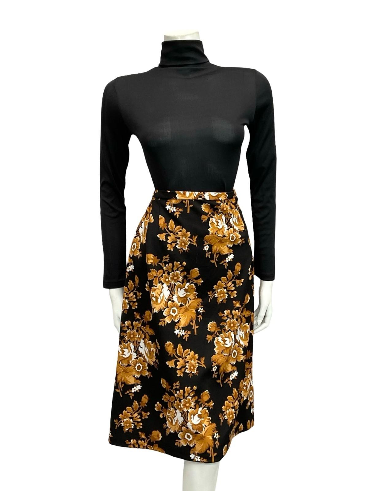 VTG 60S 70S BLACK BEIGE WHITE FLORAL MIDI SKIRT 14 16