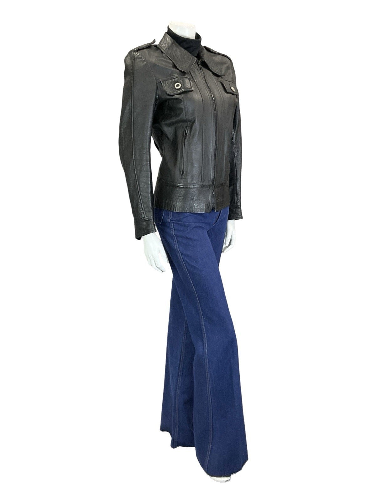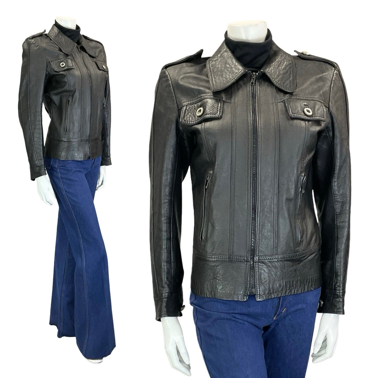 VTG 60S 70S BLACK BIKER ZIP UP LEATHER EPAULETTE MILITARY JACKET W/ POCKETS 10