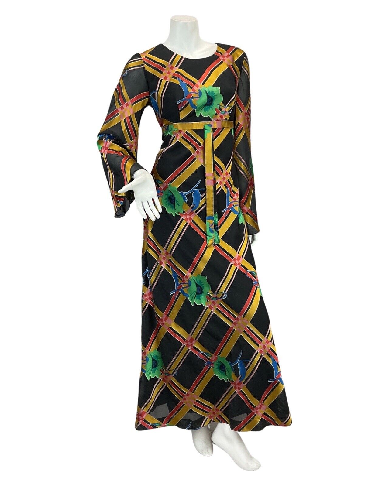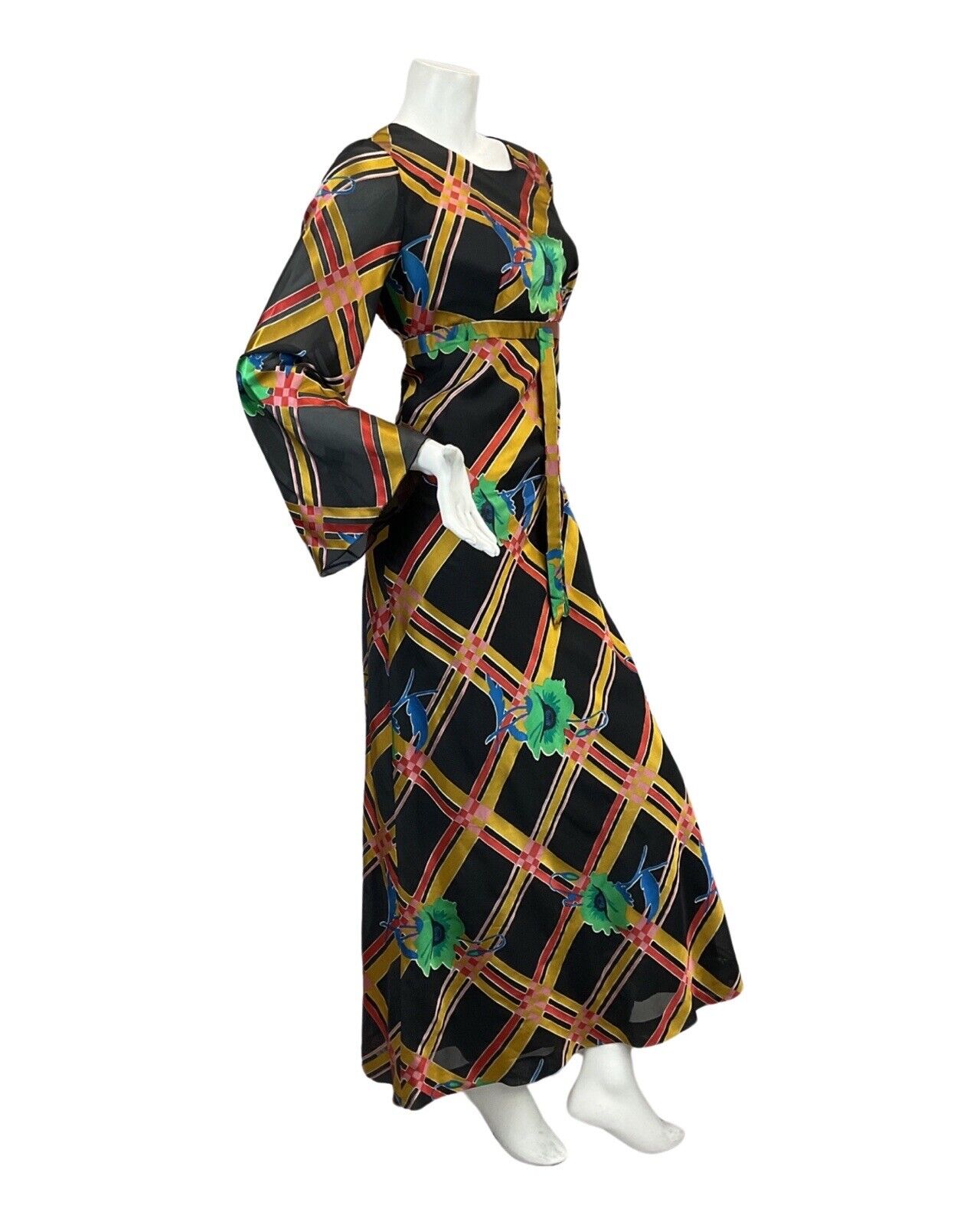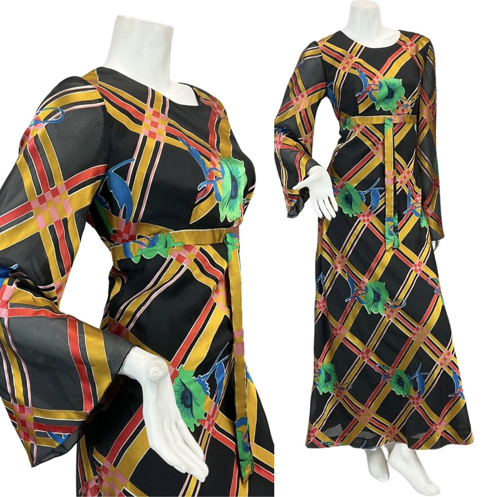 VTG 60s 70s BLACK GOLD RED GREEN FLOWER ABSTRACT PATTERN MAXI DRESS 8 10