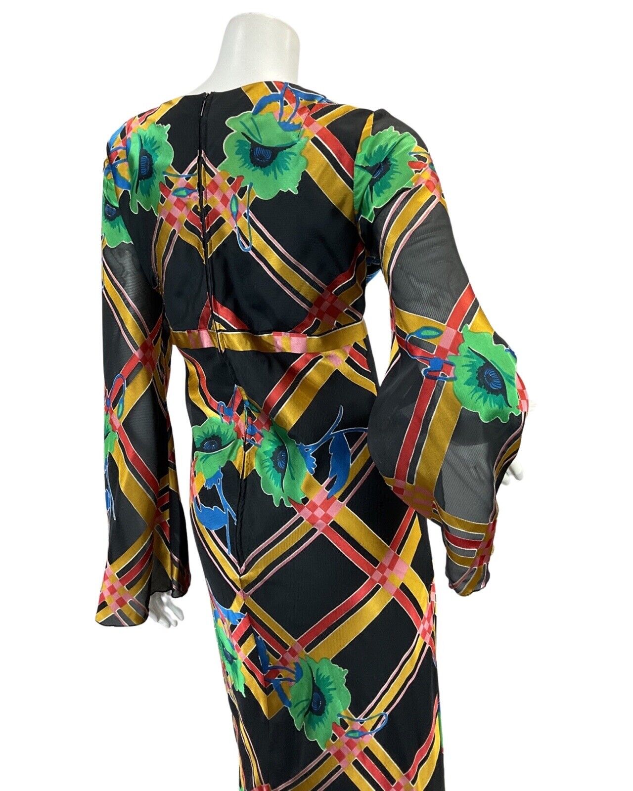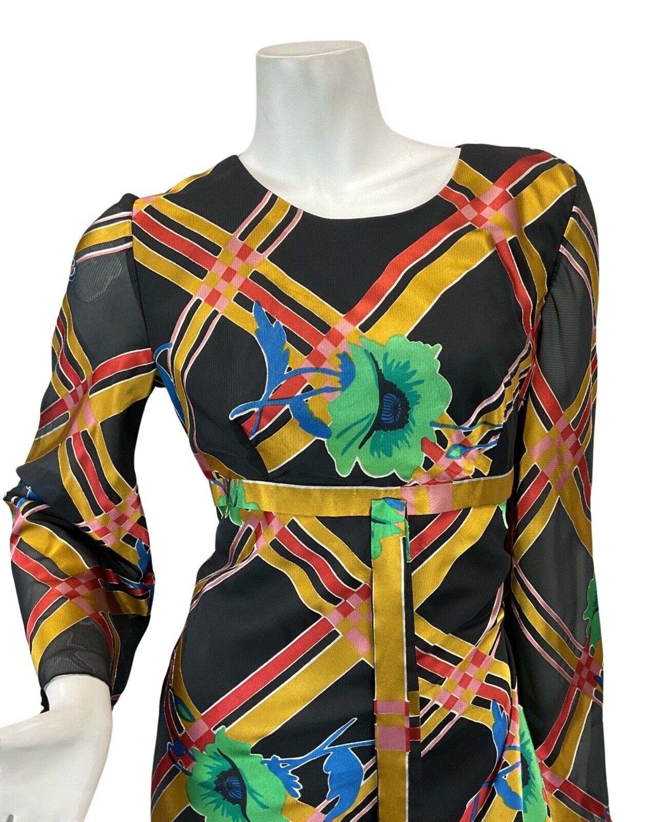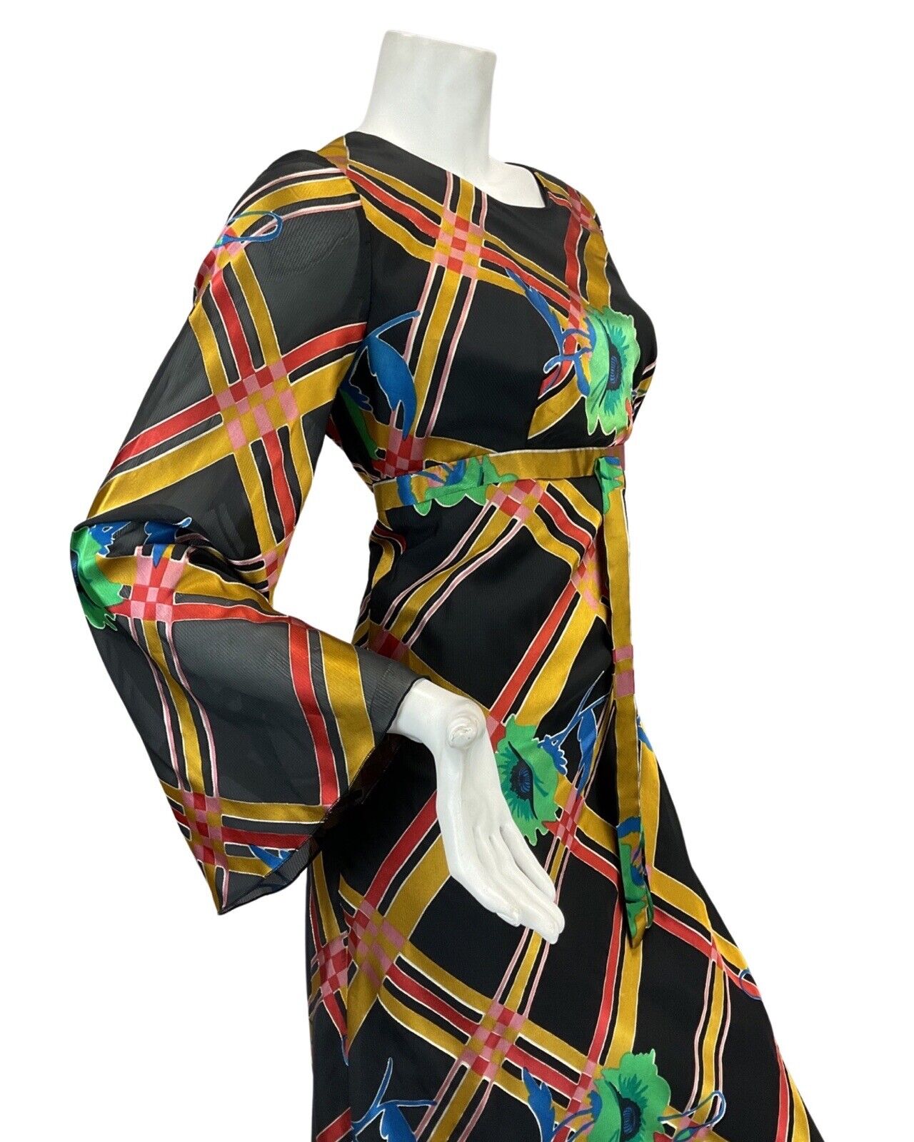 VTG 60s 70s BLACK GOLD RED GREEN FLOWER ABSTRACT PATTERN MAXI DRESS 8 10