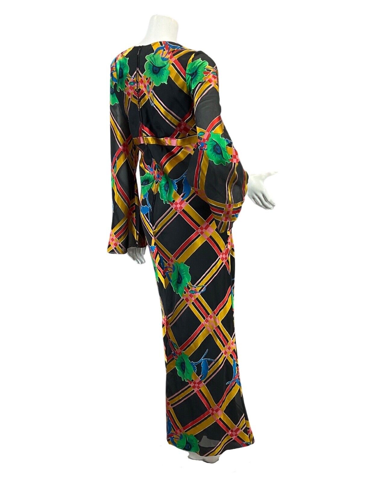 This is a beautiful 70s maxi dress. It's made from 100% polyester. It's really light and floaty and it's fully lined inside. It fastens with a zipper down the back and has lovely flared sleeves.