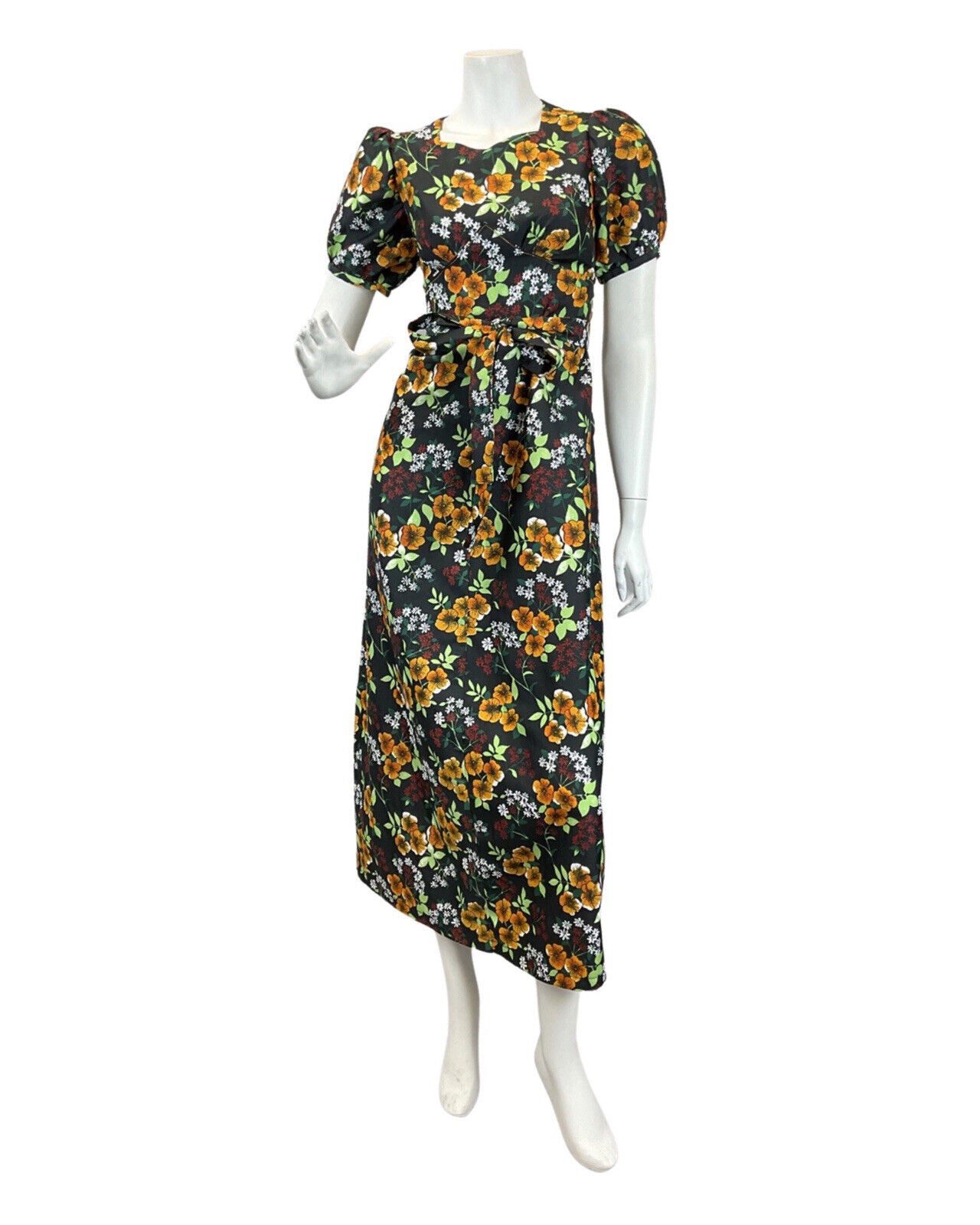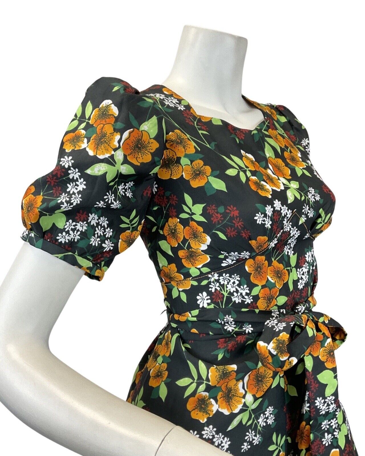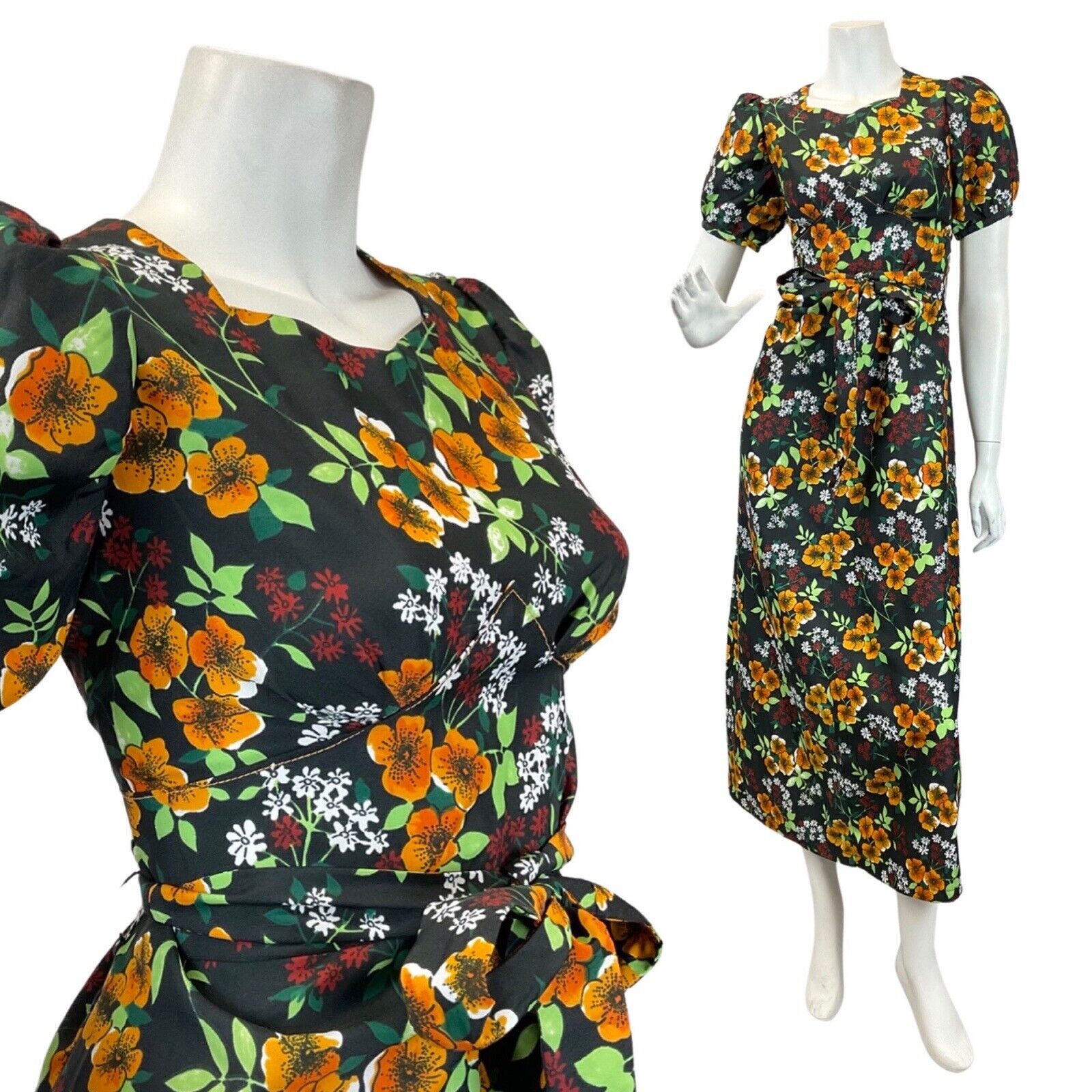 VTG 60s 70s BLACK ORANGE RED FLORAL PSYCHEDELIC PUFF SLEEVE MOD MAXI DRESS 8 10