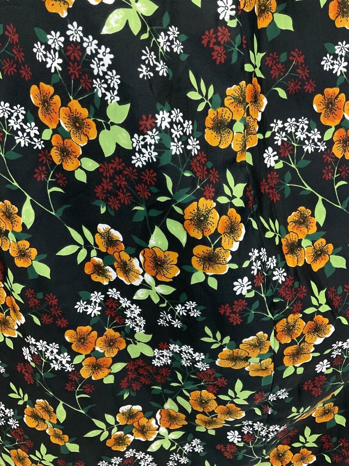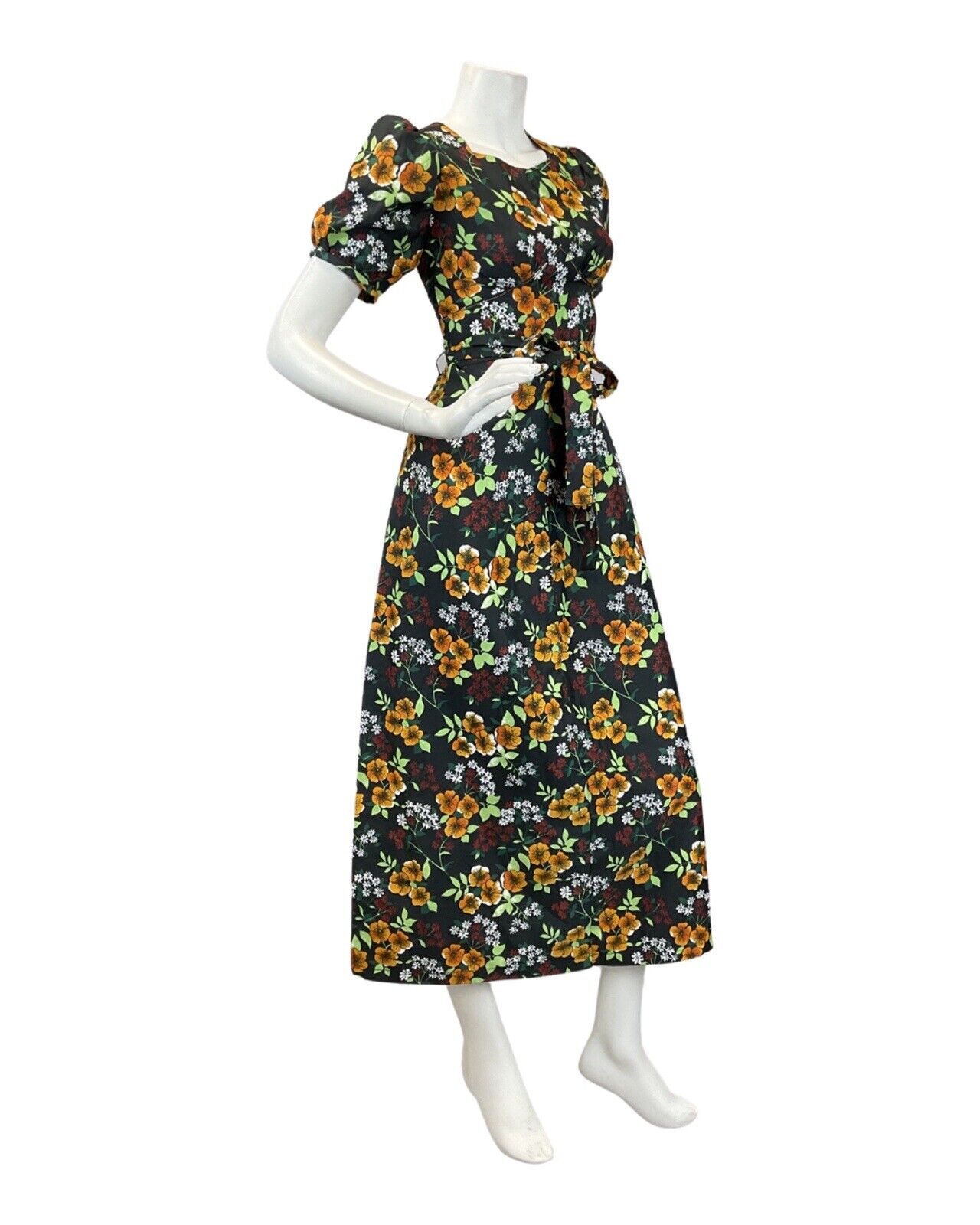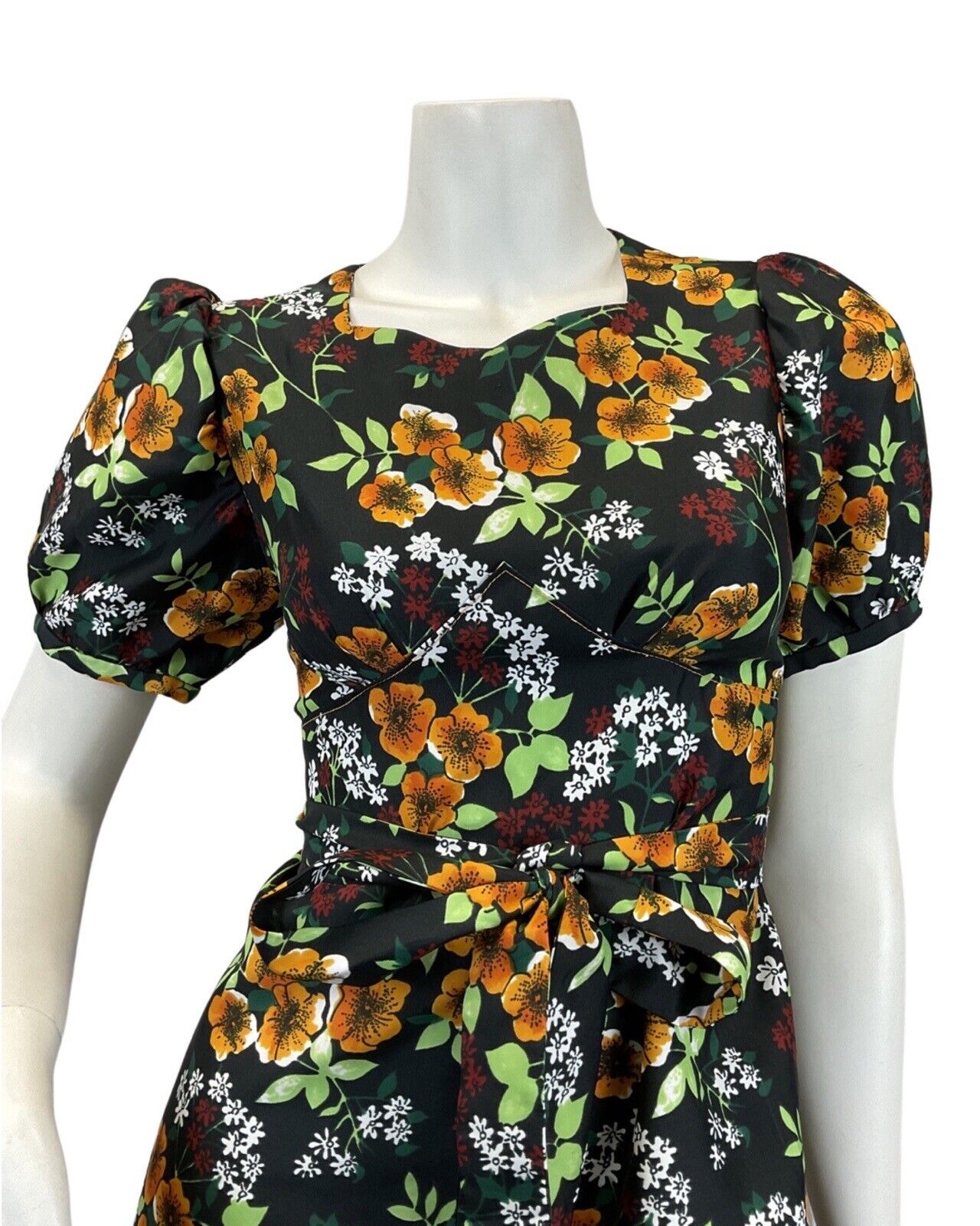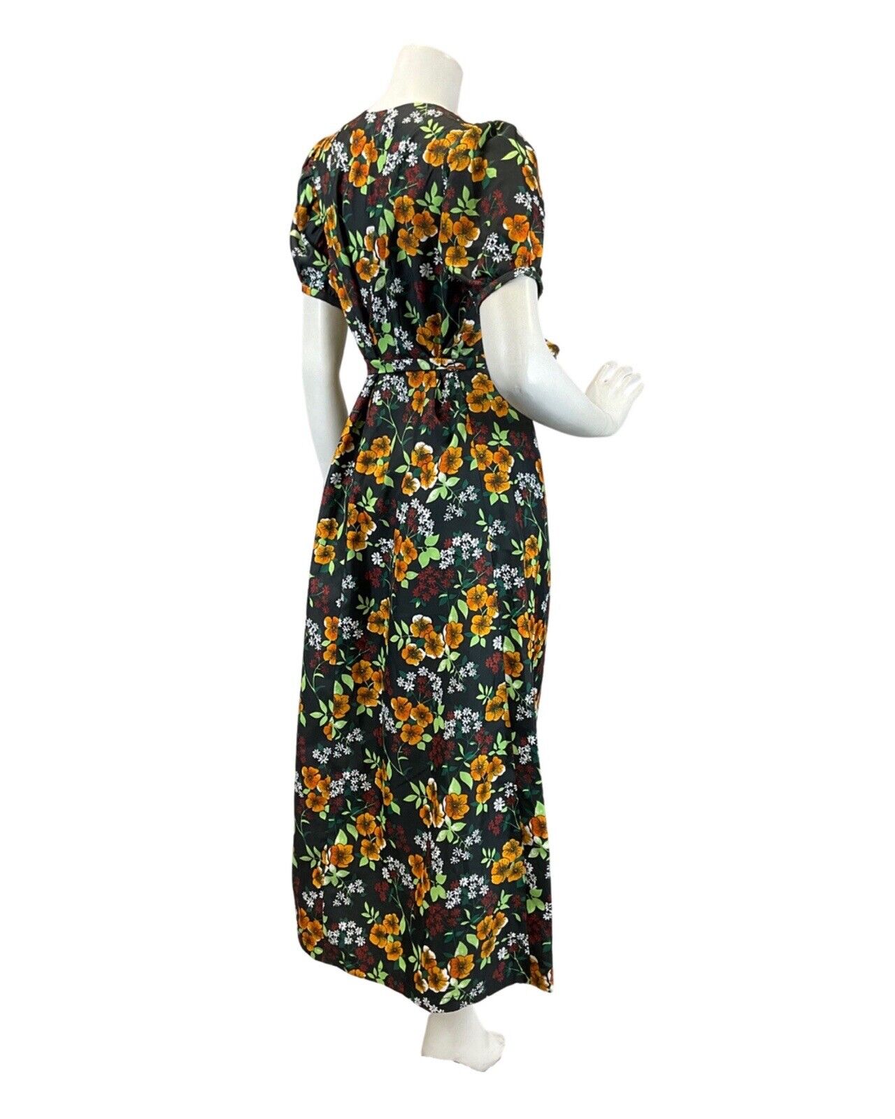 VTG 60s 70s BLACK ORANGE RED FLORAL PSYCHEDELIC PUFF SLEEVE MOD MAXI DRESS 8 10