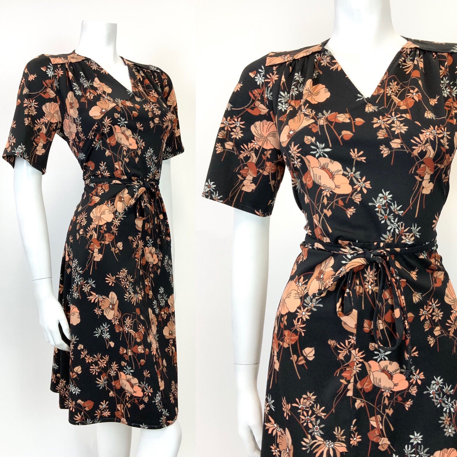 VTG 60s 70s BLACK PEACH BROWN BEIGE FLORAL LEAFY BELTED SHORT SLEEVE DRESS 12 14