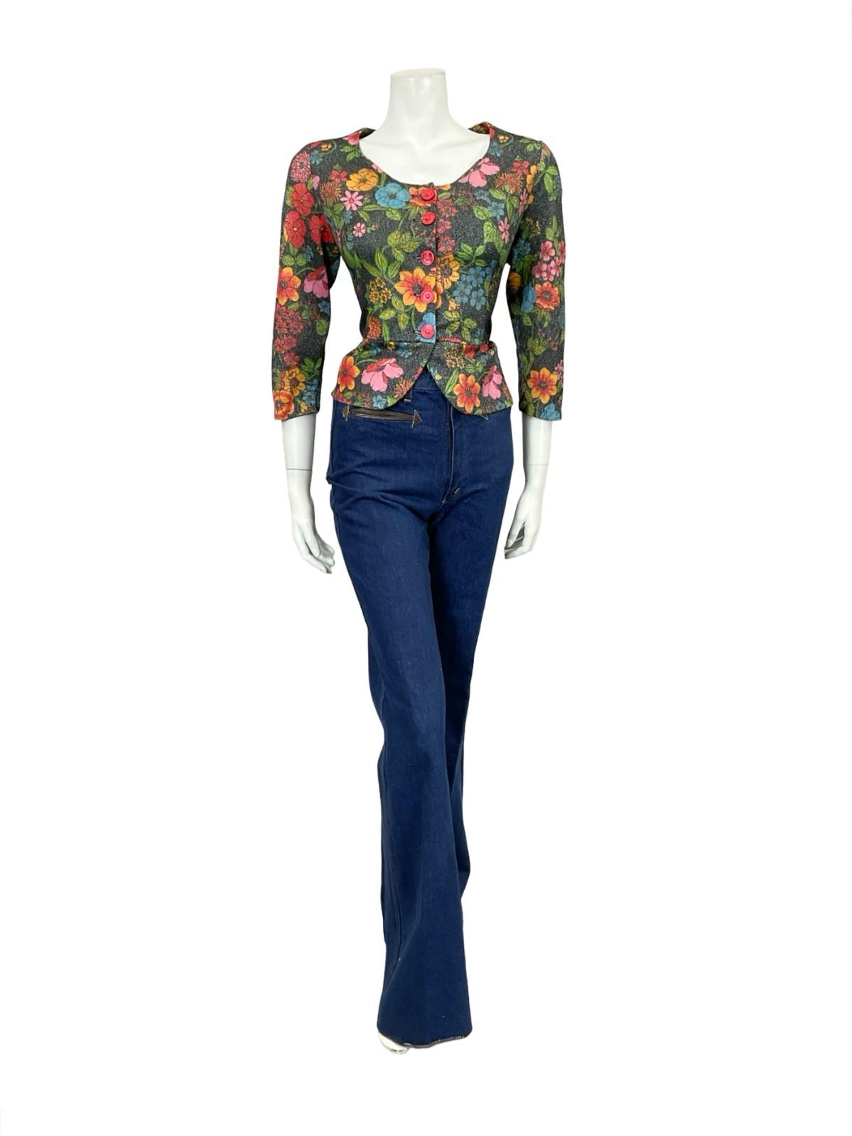 This is a cute 60s 70s blouse with a peplum hem, round large neckline and cropped sleeves. This blouse appears to be made of a glittery lurex polyester blend, printed wit red and orange flowers with green leaves on a black background. There is no inner lining to this blouse, and there are 5 bright red buttons at the front.