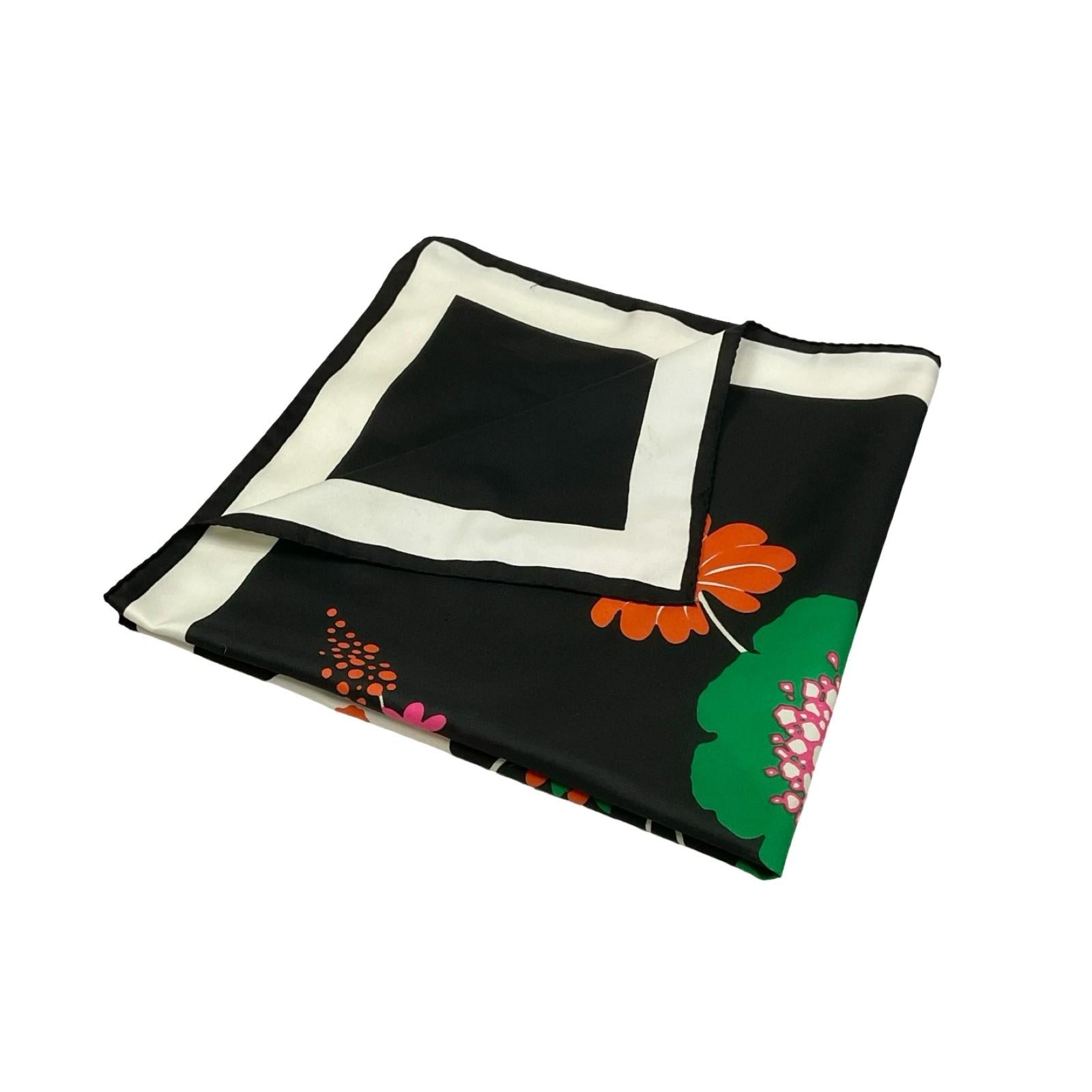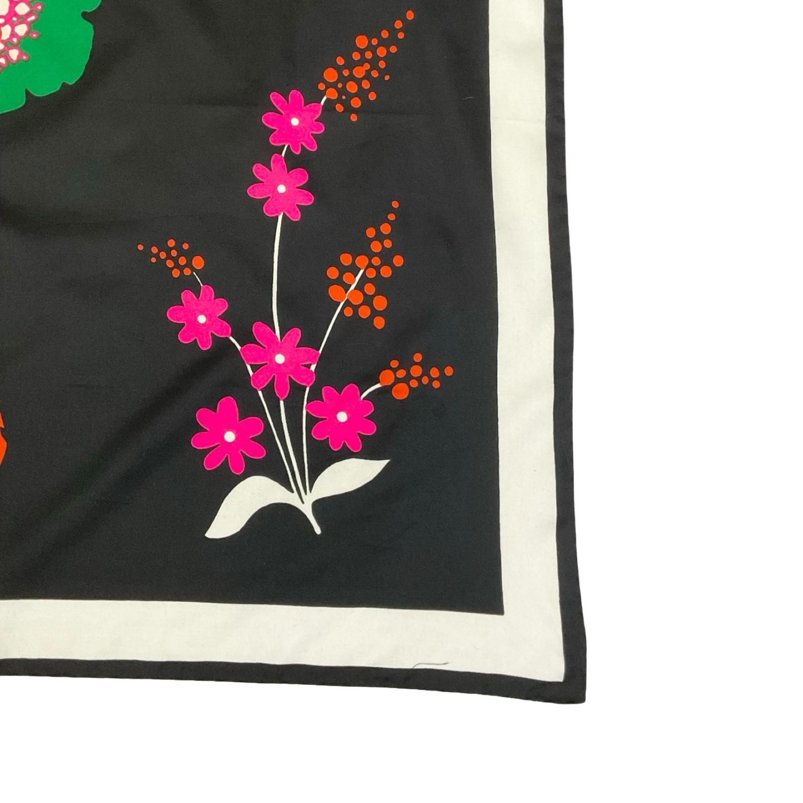 This is a cute 60s 70s floral scarf made from a synthetic, which feels like polyester. This scarf features a print of orange, pink, white and green flowers on a black background with a white border.
