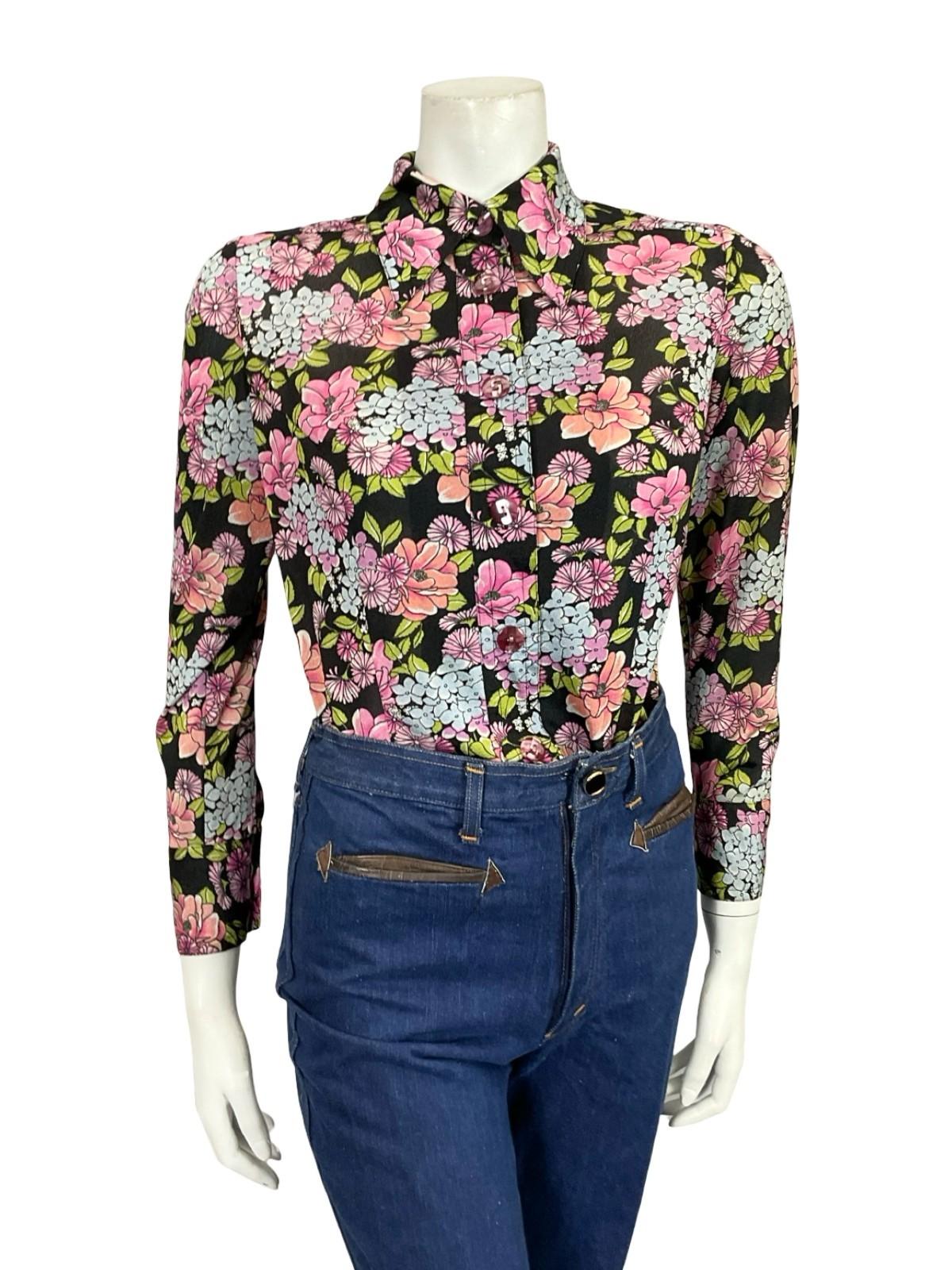 VTG 60S 70S BLACK PURPLE PINK BLUE MOD FLORAL LEAFY DAGGER COLLAR SHIRT 10 12