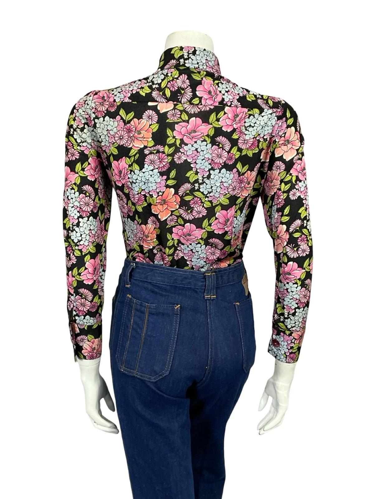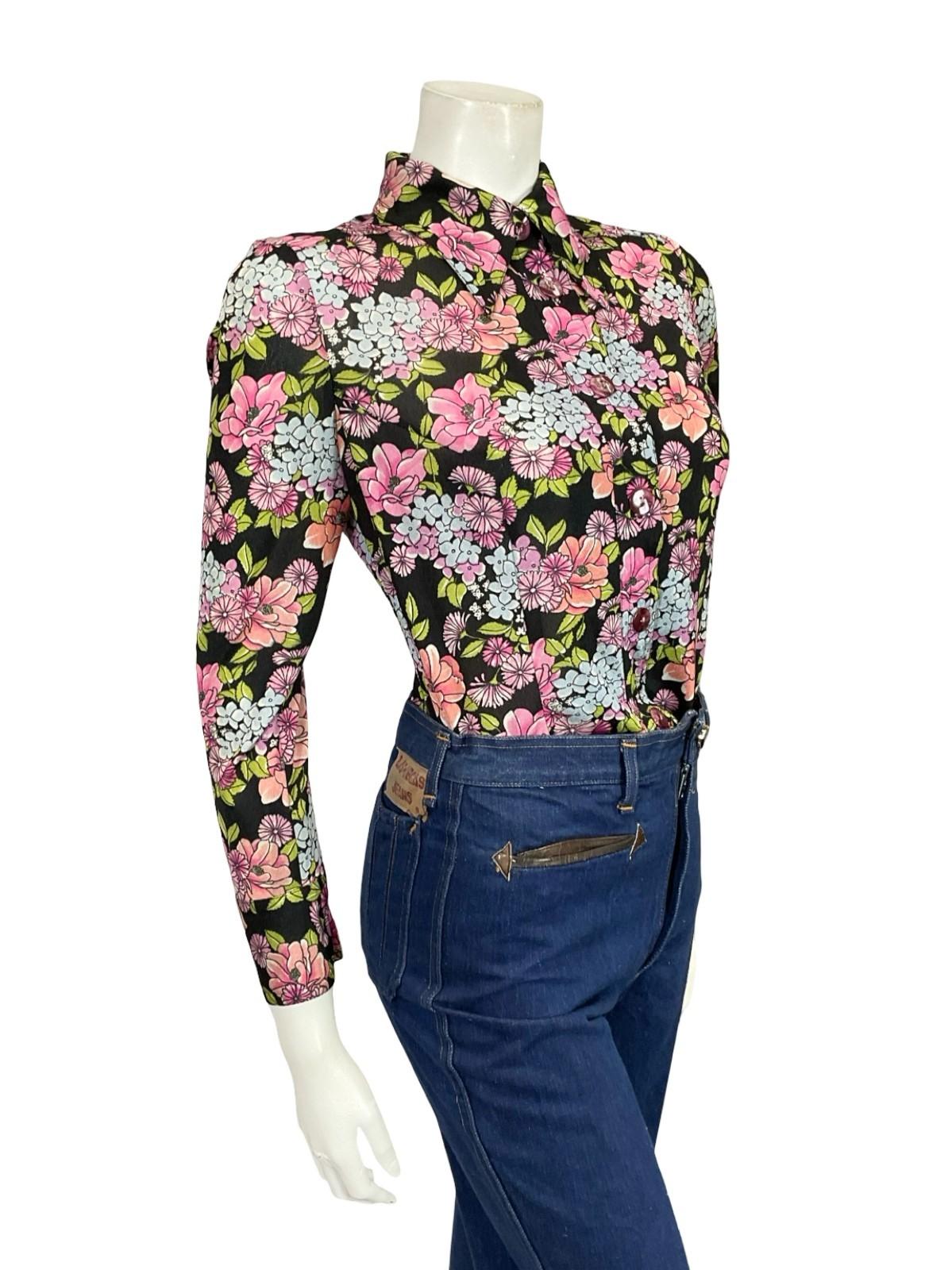This is a lovely 60s 70s dagger collar shirt with cropped sleeves and a slight amount of stretch. This shirt has no material composition labels, but feels to be made of a black synthetic, printed with blue, pink and purple flowers and green leaves. There are 6 purple marble buttons down the front, alongside one matching button on either cuff.
