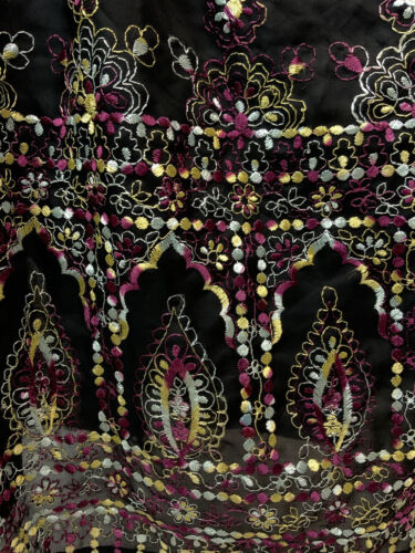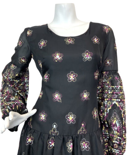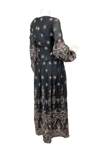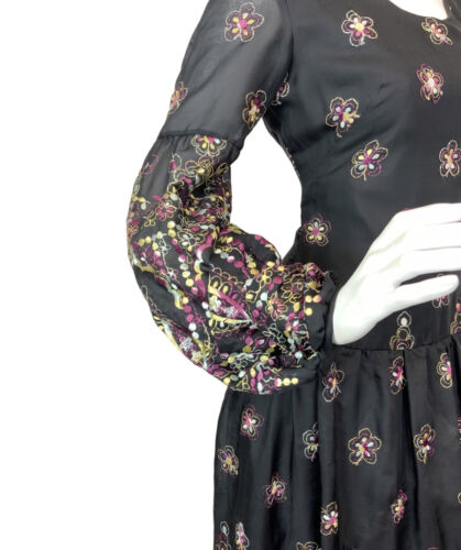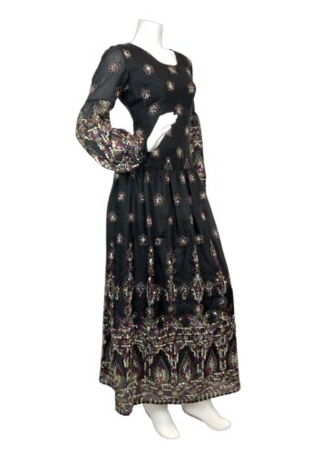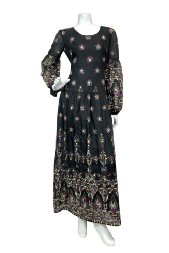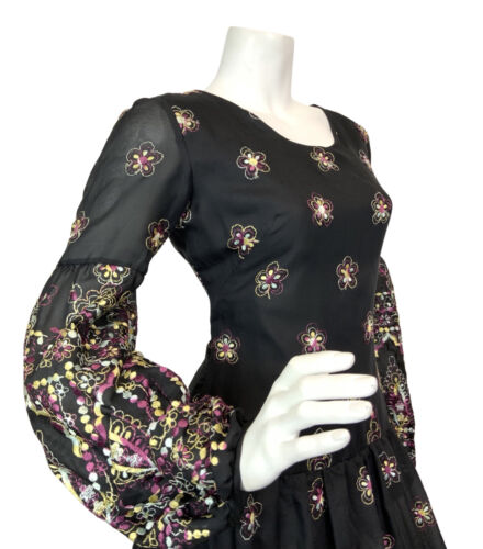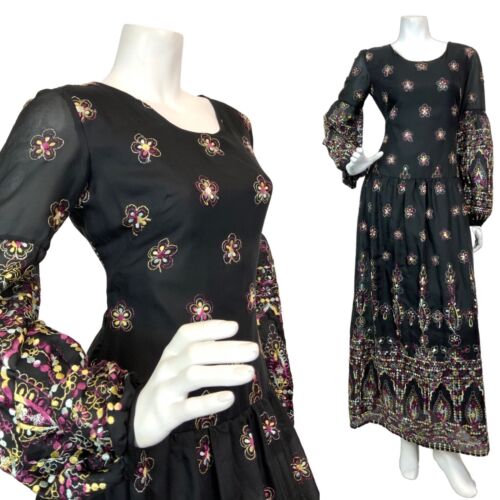 VTG 60s 70s BLACK PURPLE YELLOW EMBROIDERED FLORAL BOHO MOD MAXI DRESS 10 12