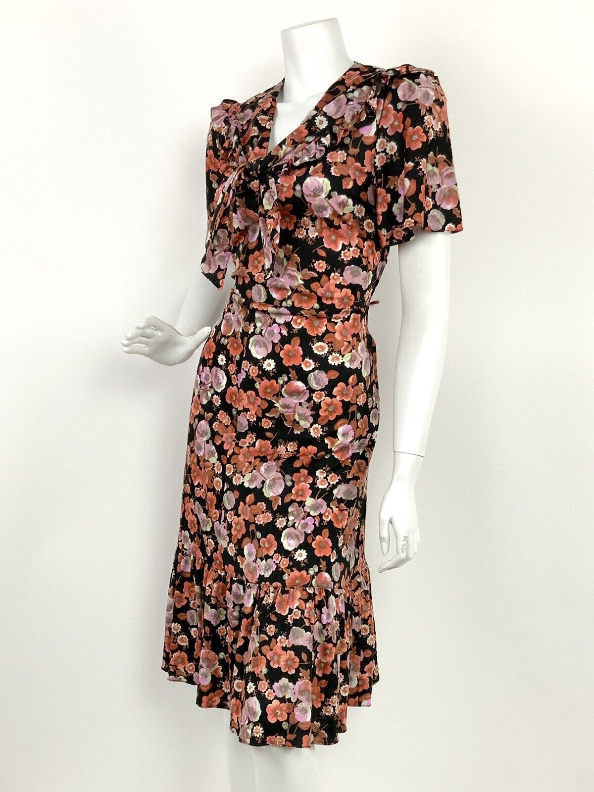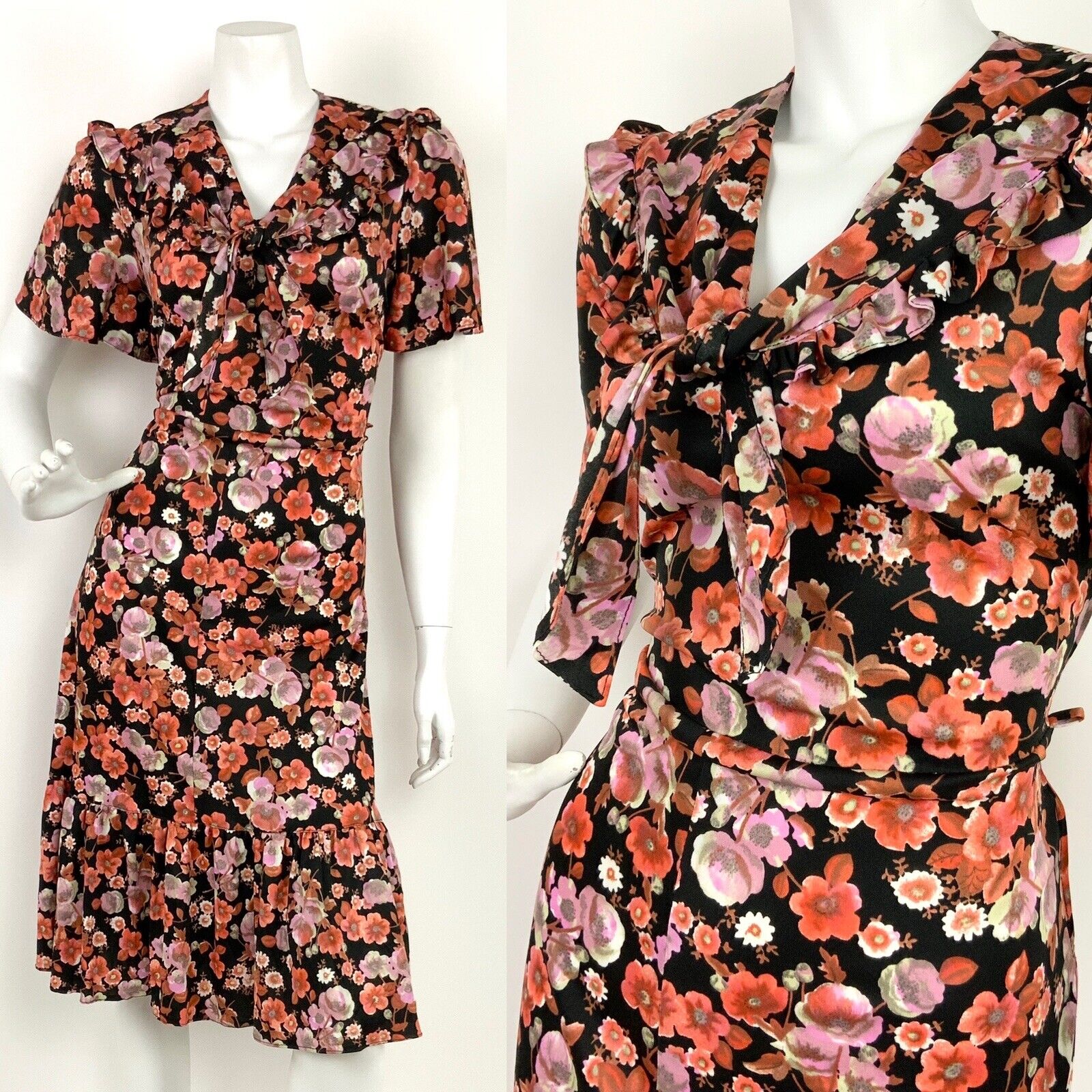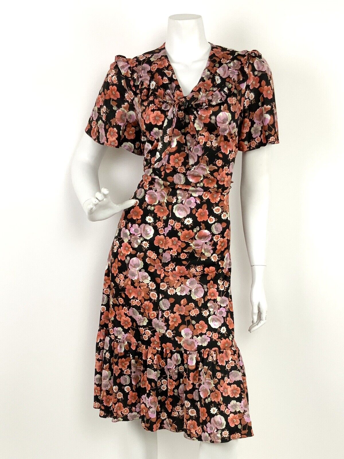 VTG 60s 70s BLACK RED PINK WHITE GREY FLORAL RUFFLE PUSSYBOW NECKTIE DRESS 12 14