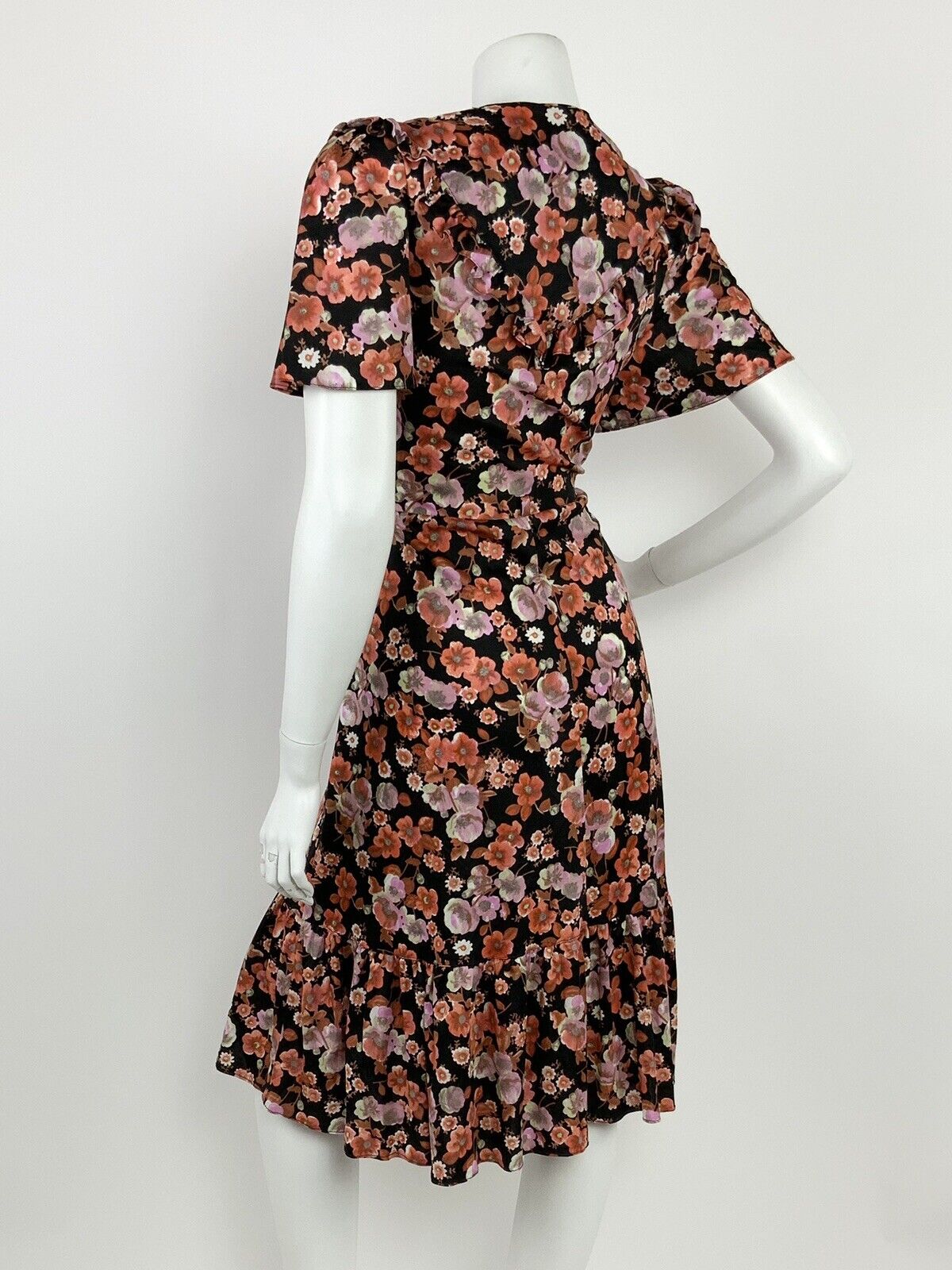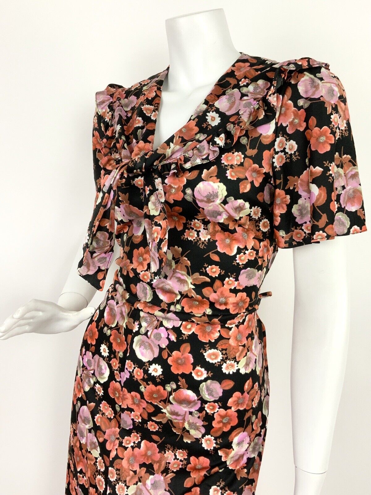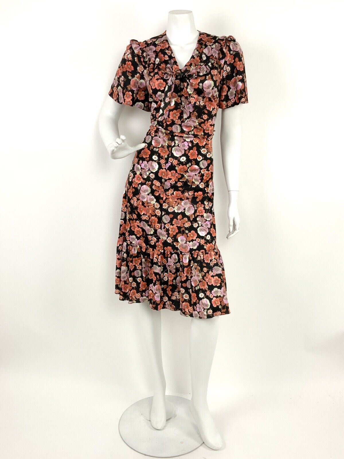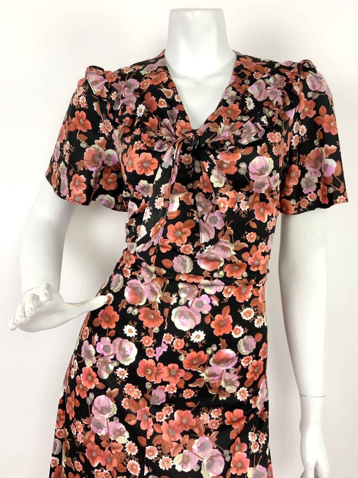 VTG 60s 70s BLACK RED PINK WHITE GREY FLORAL RUFFLE PUSSYBOW NECKTIE DRESS 12 14