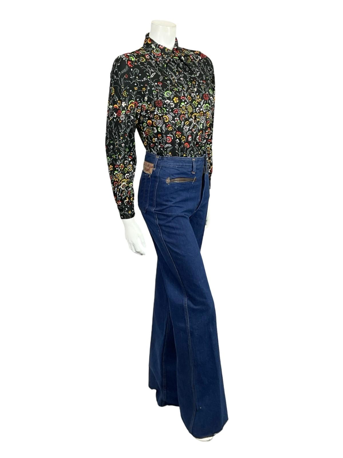 This is a cute 60s 70s Japanese long sleeve dagger collar shirt made from a black polyester printed with green, white, red and yellow florals. This shirt has 6 gold rimmed black buttons down the front, alongside a matching button on either cuff.