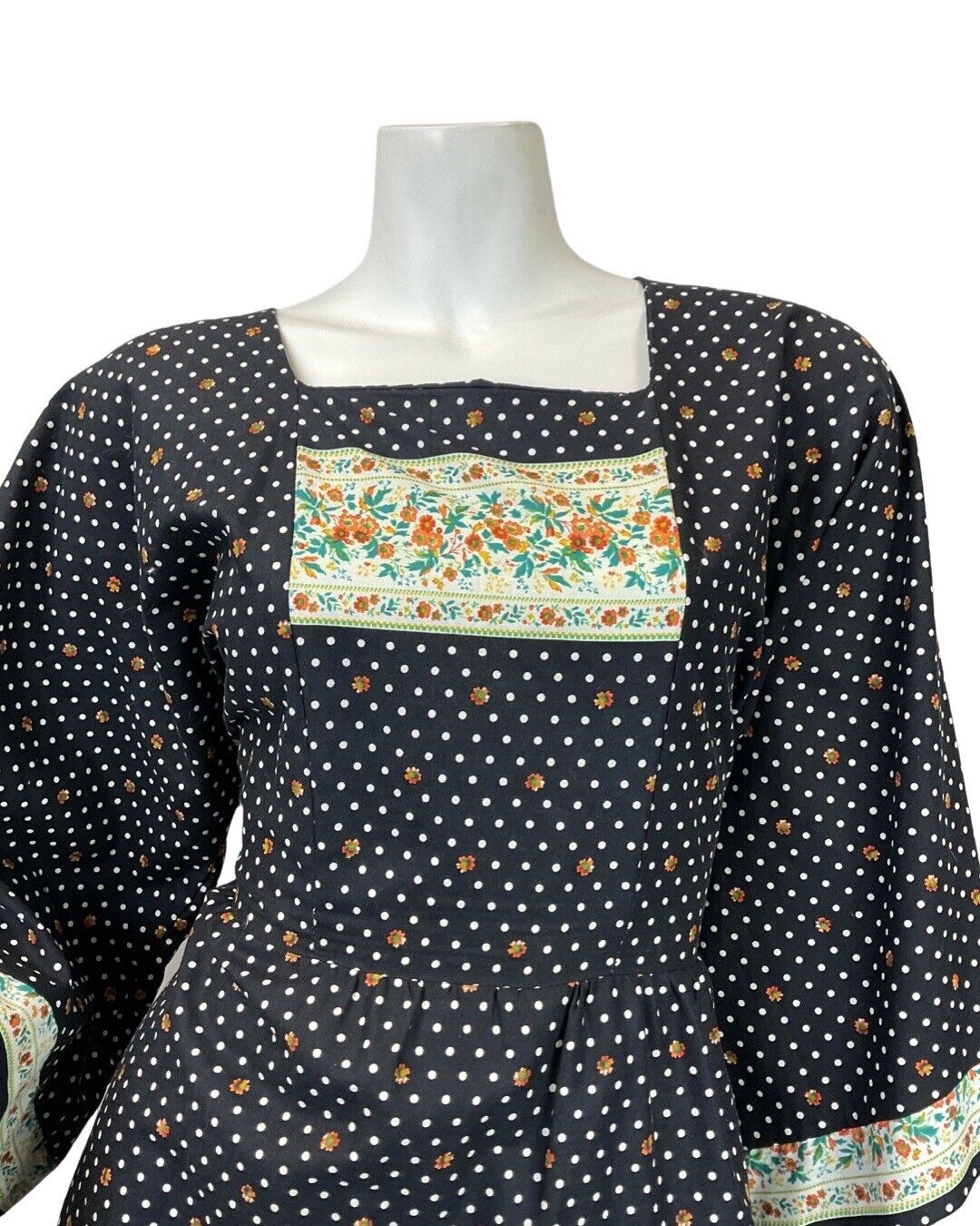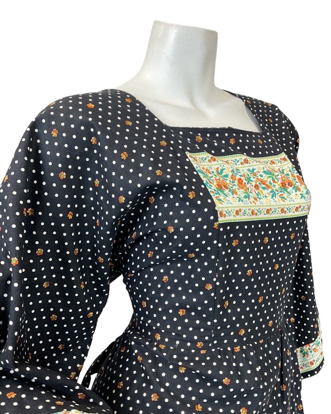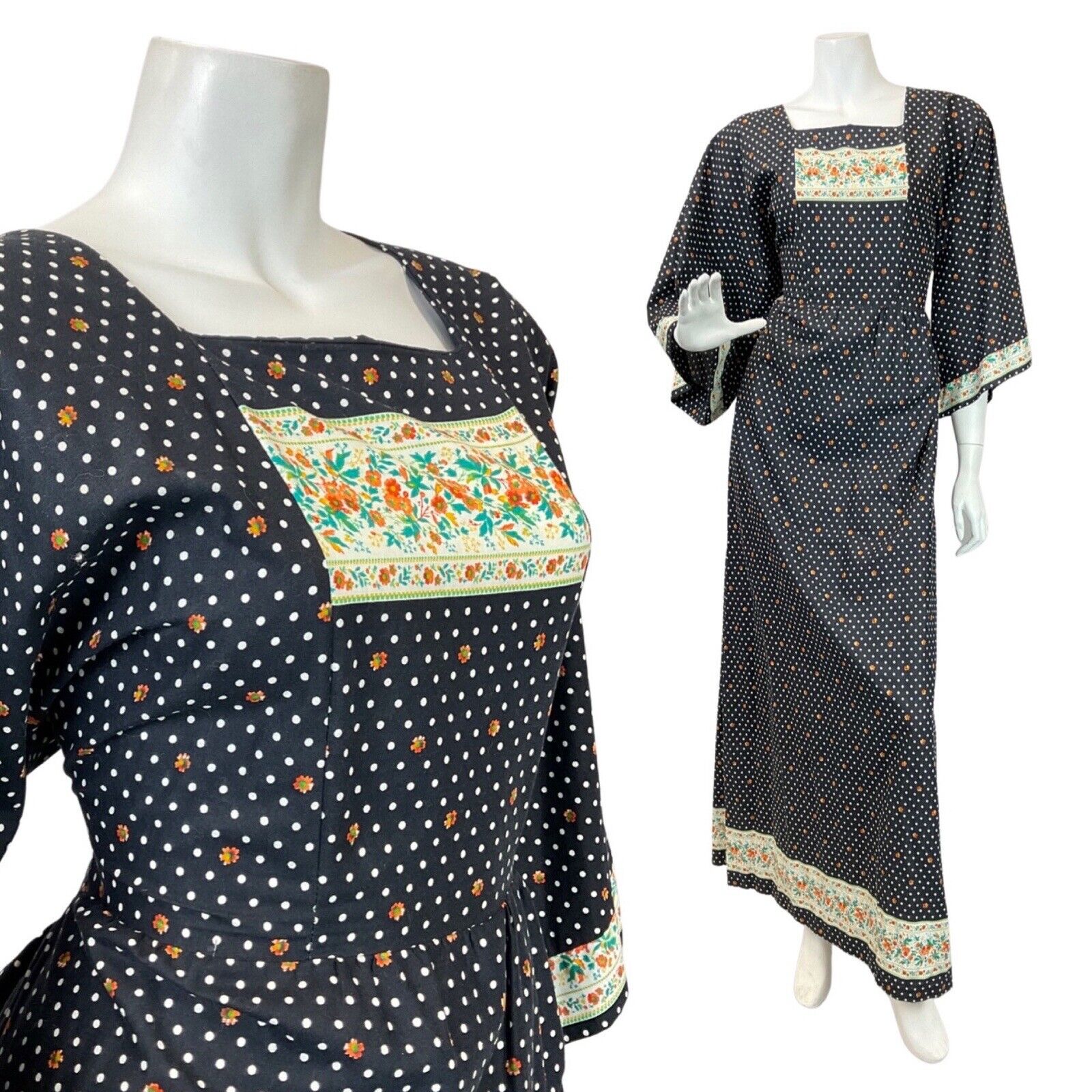 VTG 60s 70s BLACK WHITE ORANGE POLKA-DOT FLORAL BOHO PRAIRIE MAXI DRESS 10 12