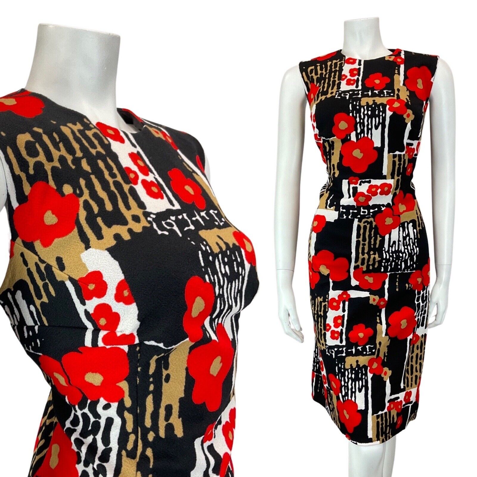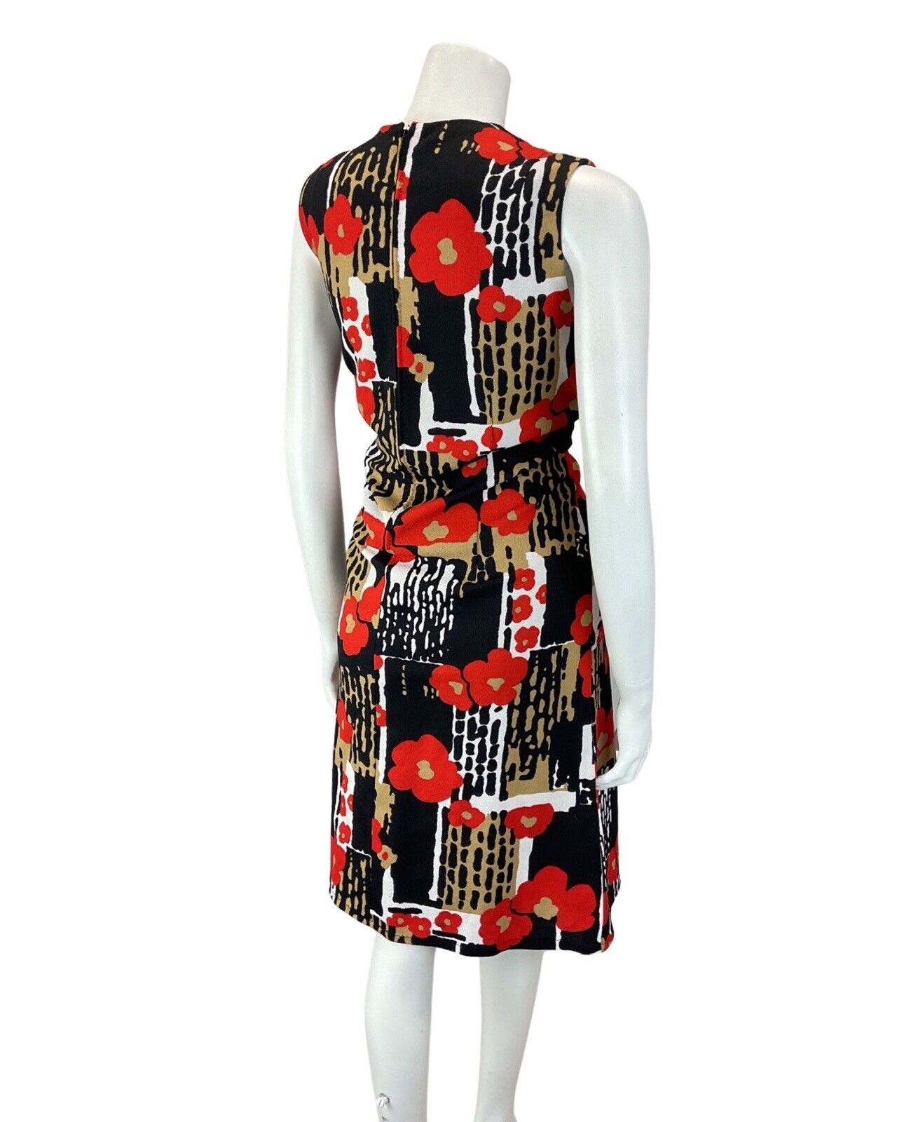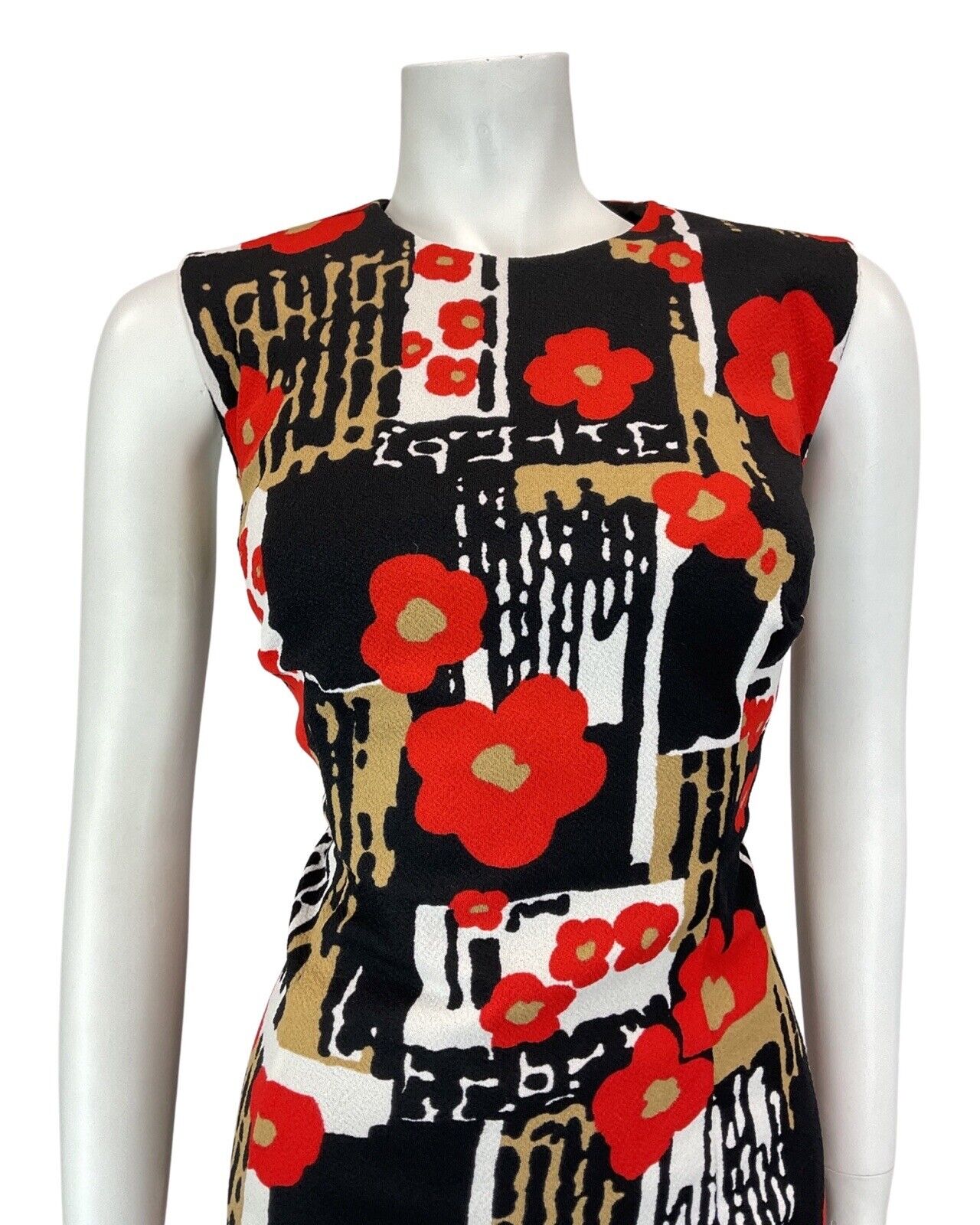 VTG 60s 70s BLACK WHITE RED PSYCHEDELIC FLORAL POPPY MOD SLEEVELESS DRESS 14 16