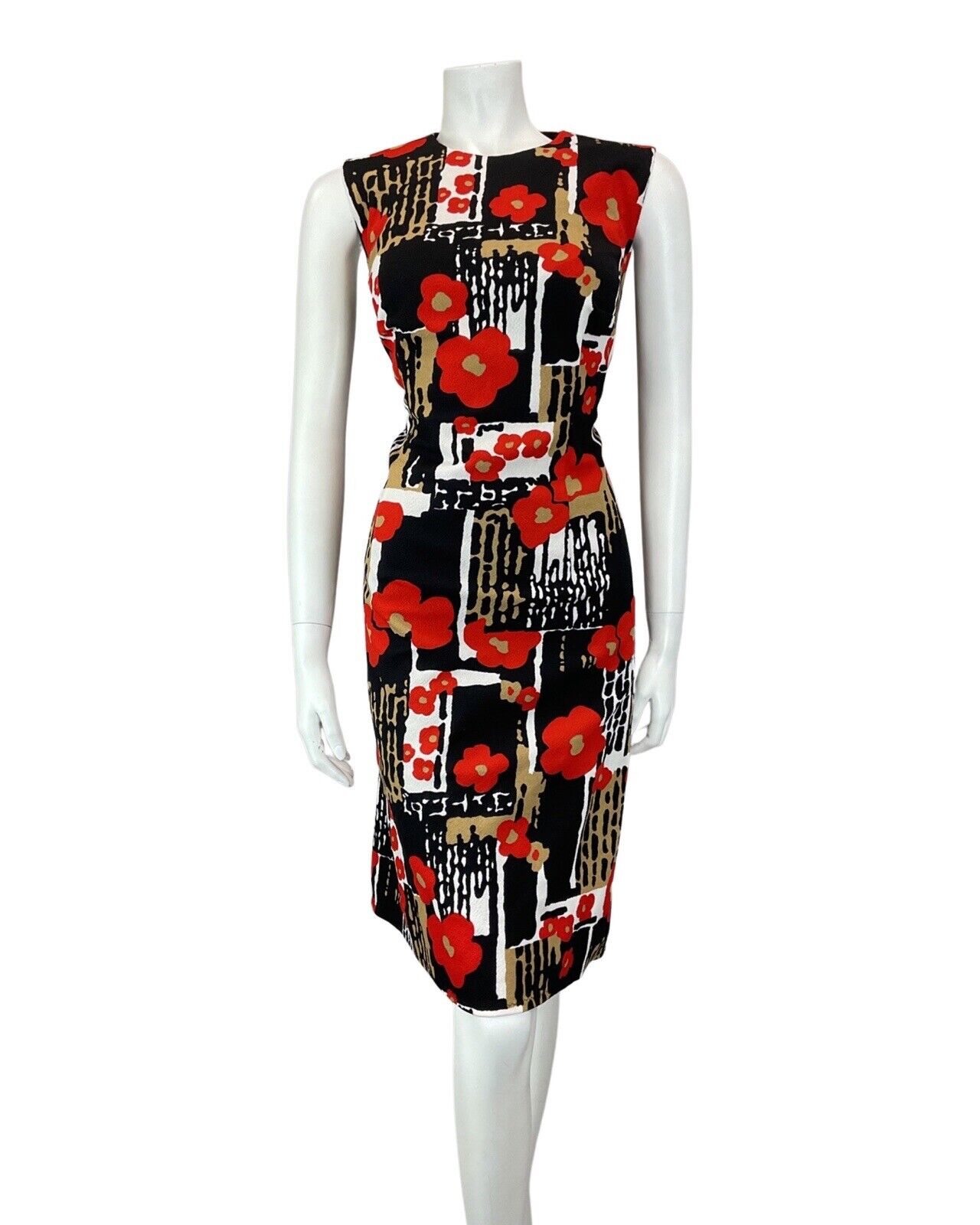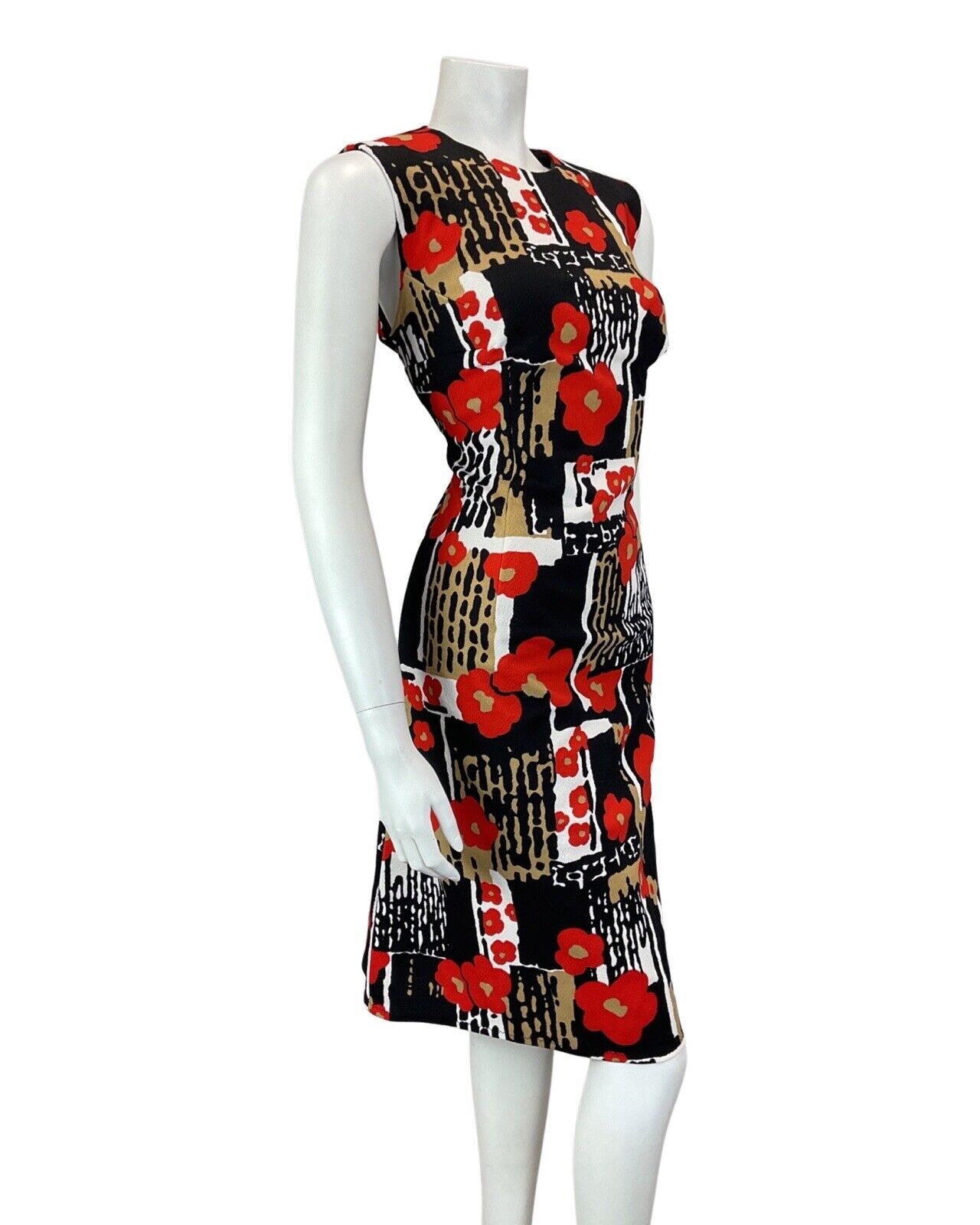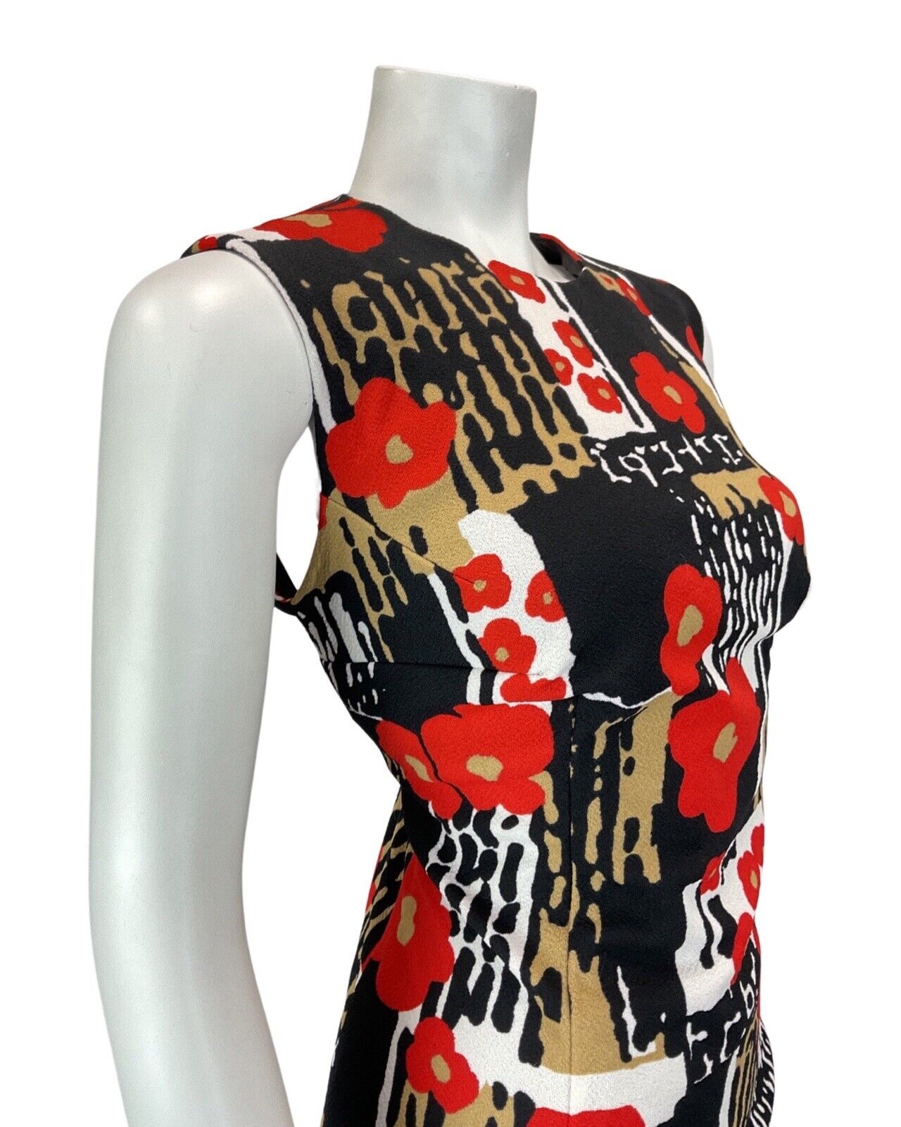 VTG 60s 70s BLACK WHITE RED PSYCHEDELIC FLORAL POPPY MOD SLEEVELESS DRESS 14 16